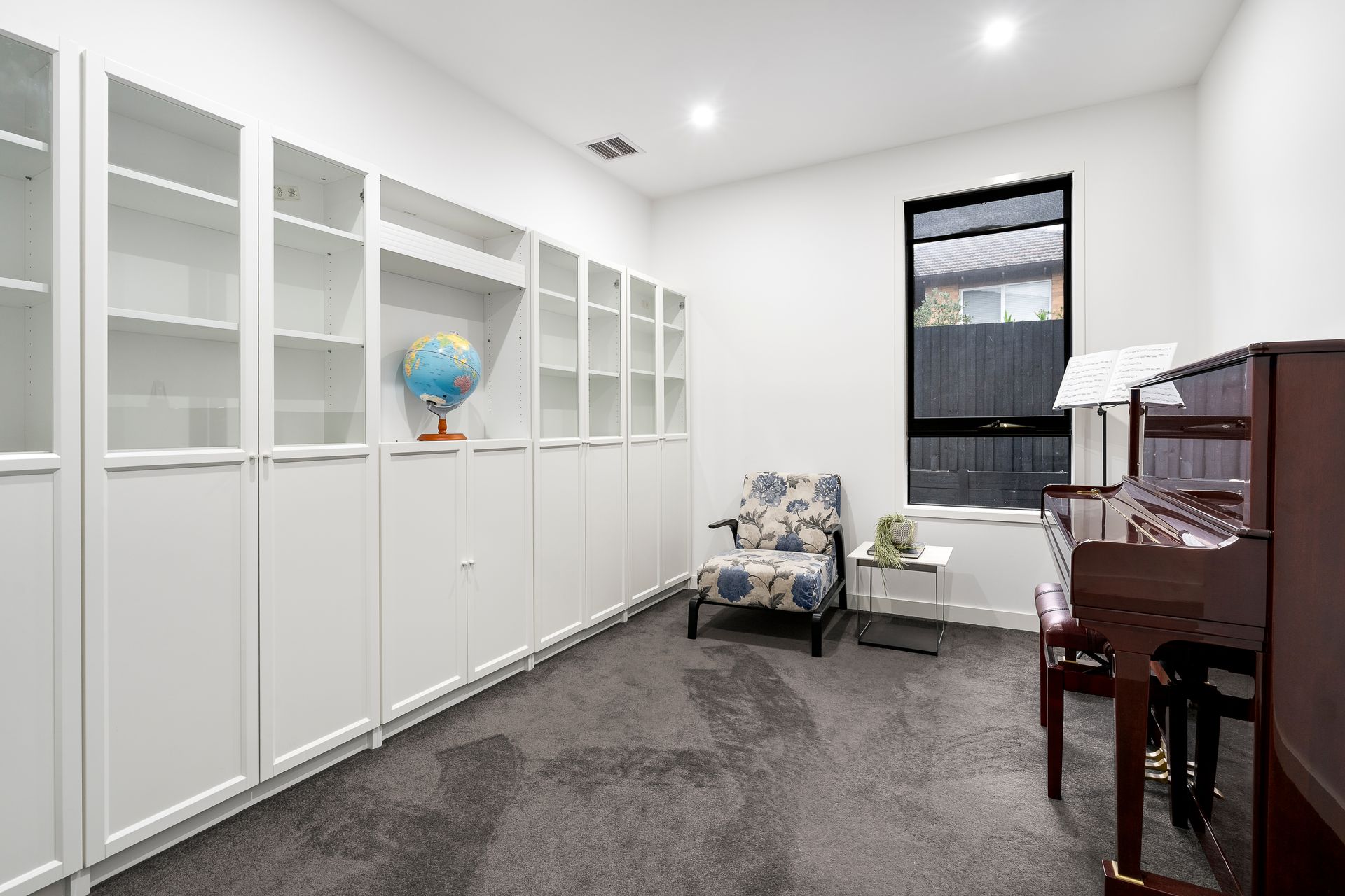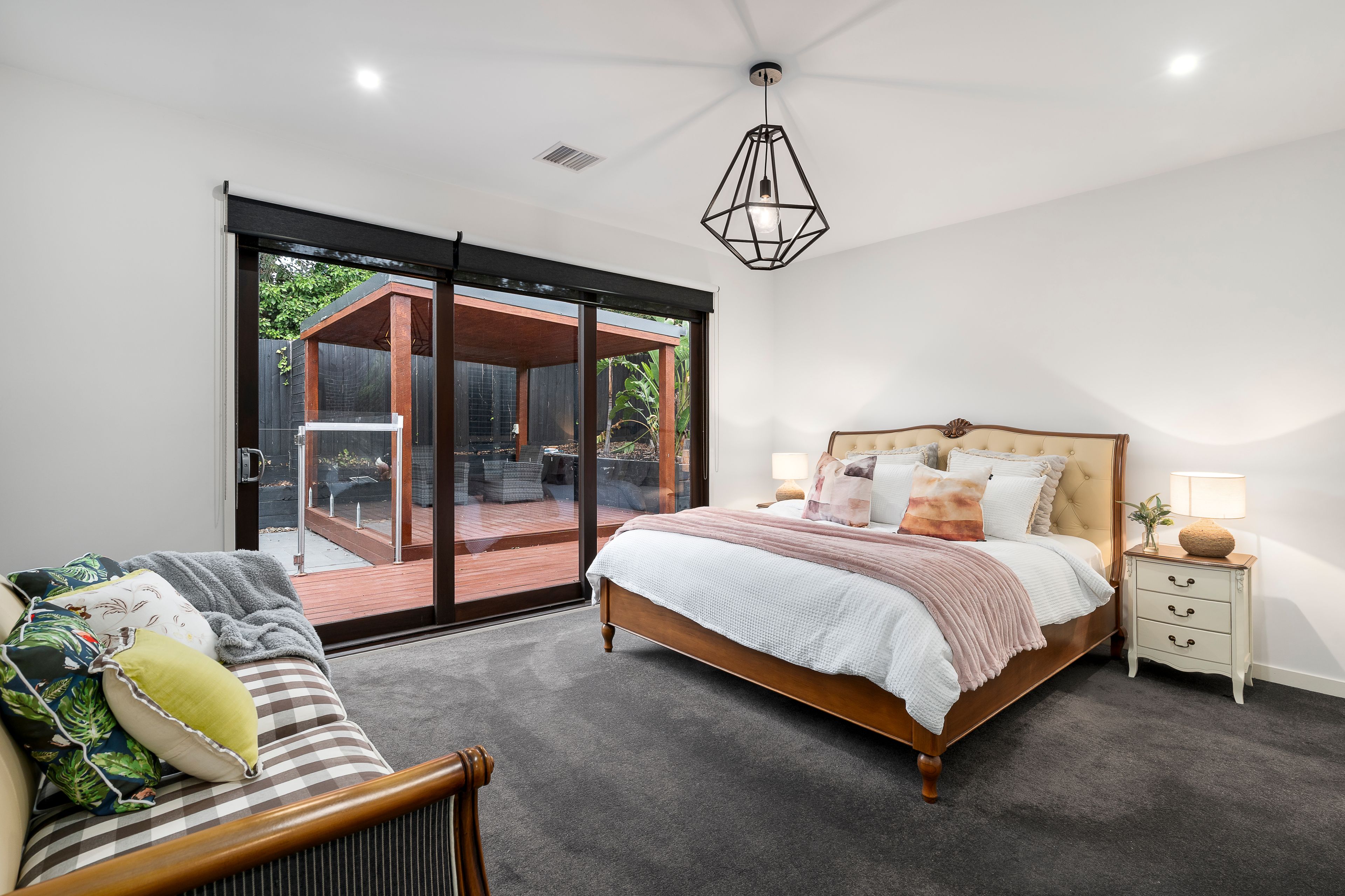 The floorplan offers thoughtful versatility, featuring a secluded ground-floor master wing with a vogue ensuite and private deck access. Upstairs, a second retreat opens onto a sunset balcony, offering breathtaking 180-degree views over the leafy Balwyn North canopy.