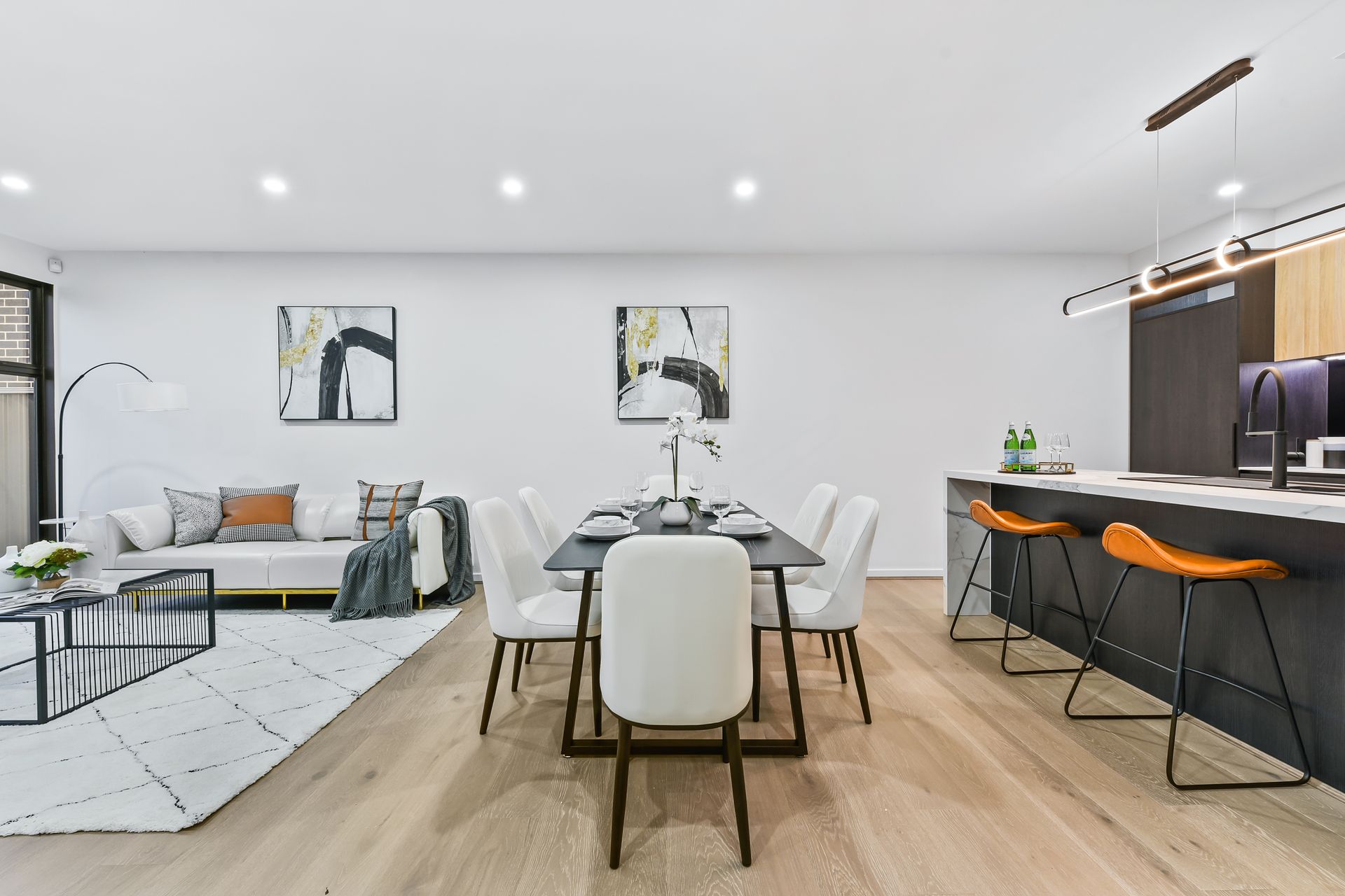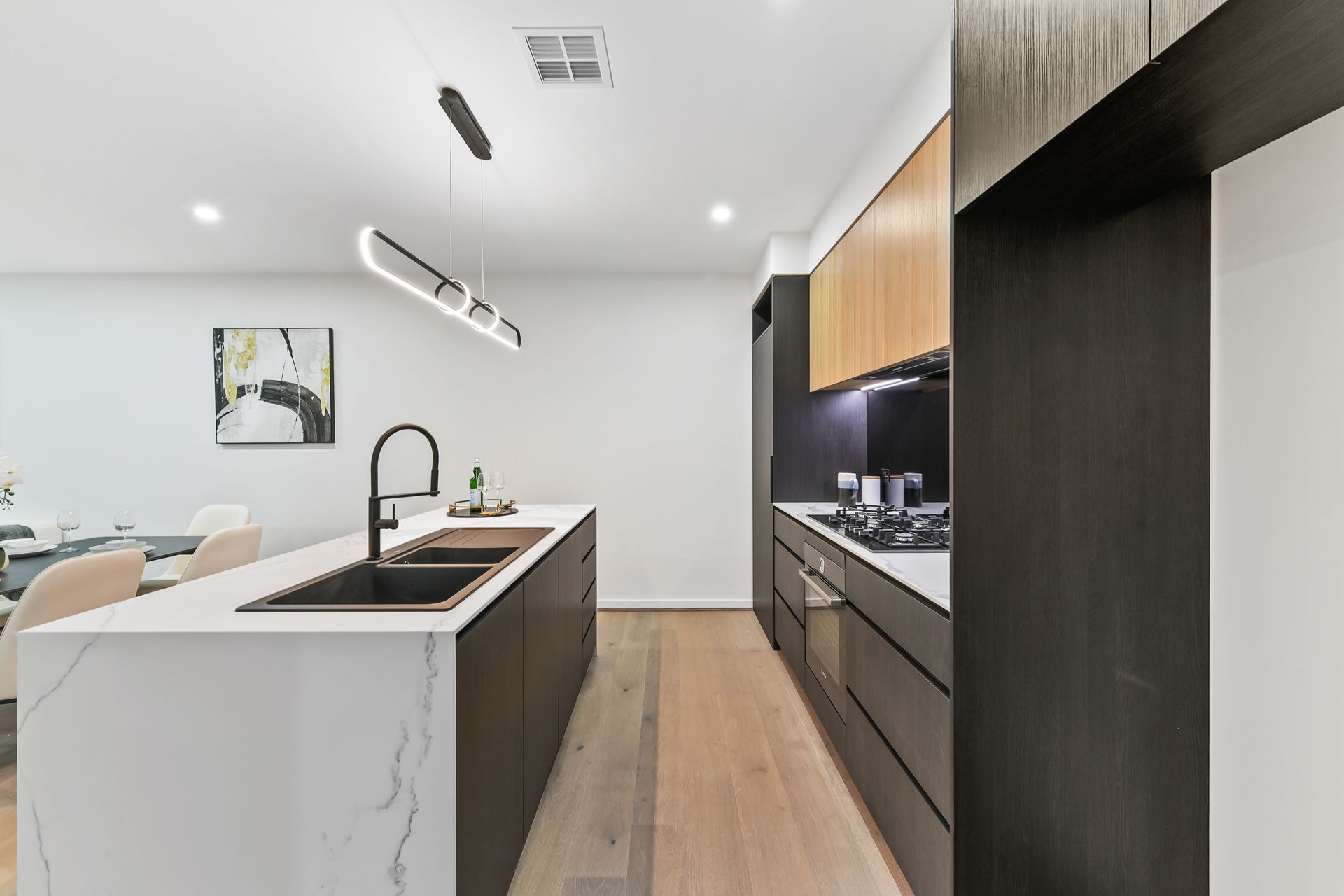Enjoying a light-filled open family/meal zone with floor-to-ceiling windows, this is a super-stylish and comfortable space in which to relax, dine or entertain. Connecting effortlessly is the designer kitchen with marble-effect stone benchtops, superb Bosch appliances, fashionable pendant lighting, mirrored splashback, matte Phoenix tapware and contrasting cabinetry.