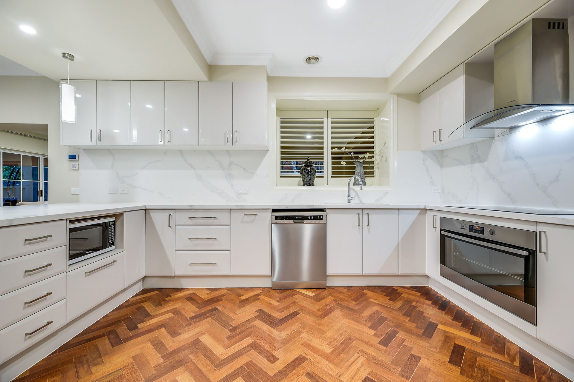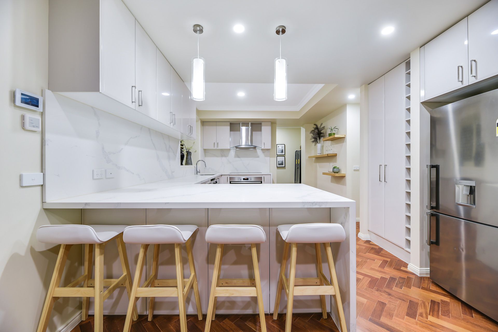 Nearby, the deluxe designer kitchen has been updated to perfection with sleek waterfall stone benchtops and matching marble-effect splashback, heaps of high-gloss cabinetry, a Westinghouse dishwasher, 900mm premium electric oven/cooktop, and a handy breakfast bar with pendant lighting.