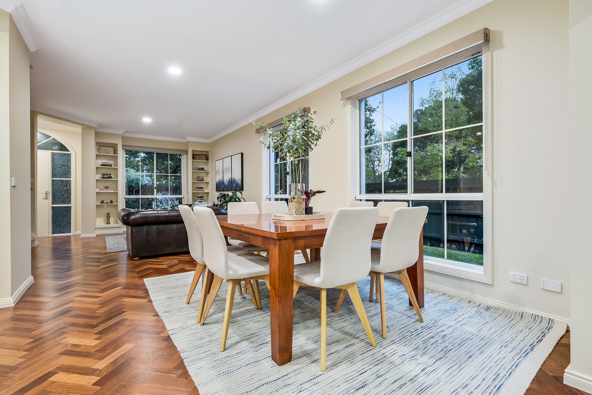 Stepping inside via the decked porch and arched front door, you're greeted by exquisite hardwood herringbone flooring, warm neutral tones, airy high ceilings and a bright Insta-worthy flowing layout.