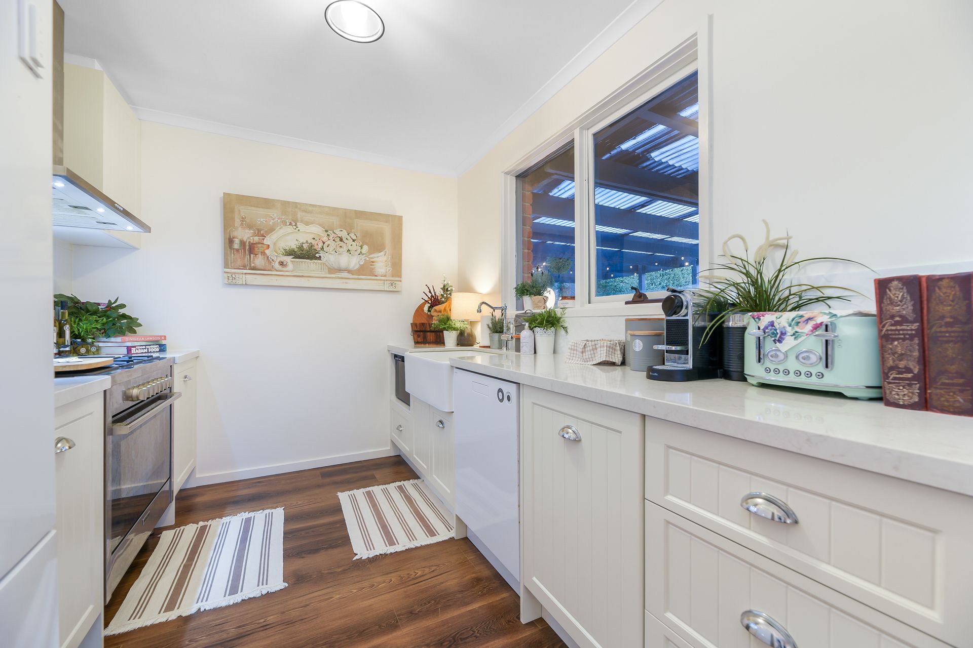 The connecting family/meal zone is a year-round delight with its split-system AC and decorative VJ wall panels, while the adjacent kitchen has been expertly renovated. The aspiring chef will love the shaker profile cabinetry, elegant stone benchtops, premium 900mm appliances, and chic farmhouse sink.