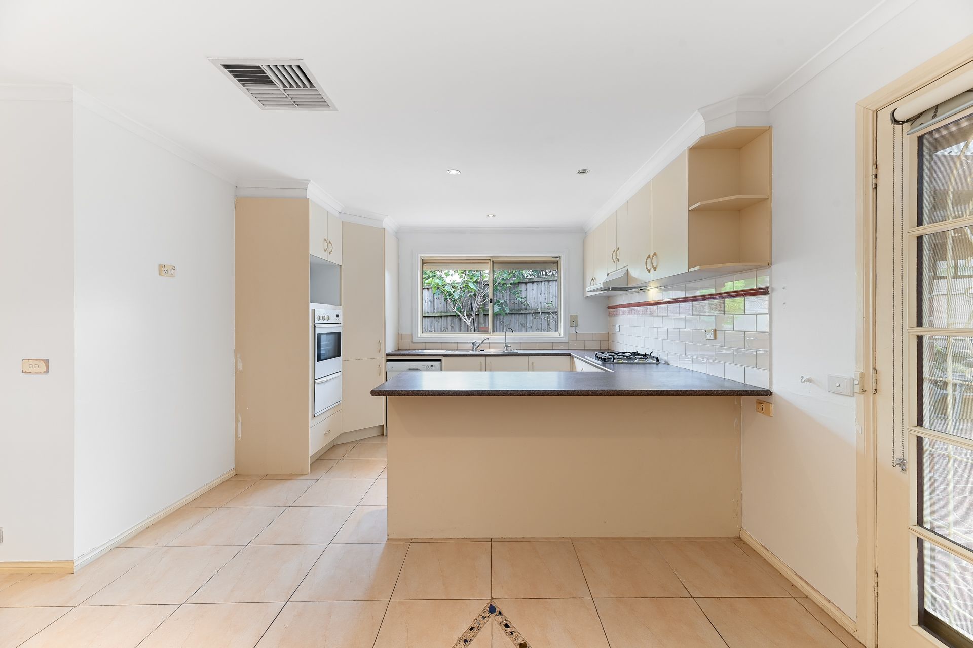 The roomy kitchen offers a leafy view to the yard and is defined by a three-seater breakfast bar finished in a beige palette. A 40mm rounded-edge laminate countertop runs perimeter, adorned by classic splash back tiles. A dishwasher is a welcome addition, and cooking appliances are integrated, including a wall-mounted oven and gas cooktop. Filtered water is available via a separate gooseneck mixer.