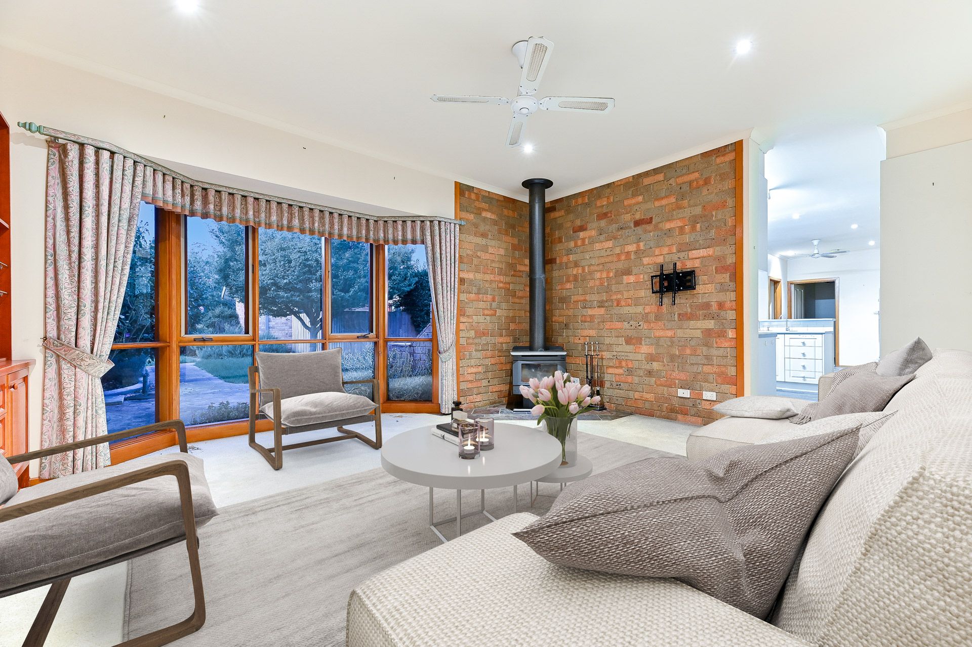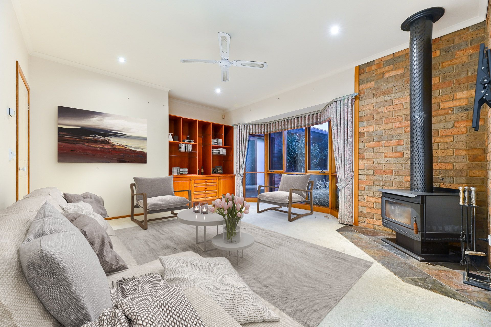 With multiple living zones in the main home, there's loads of space for the entire family to relax. A huge front lounge and dining room includes carpeting and feature front windows pouring in natural lighting. A bonus carpeted family room includes a wood fire for cosying up on cooler days and a ceiling fan.