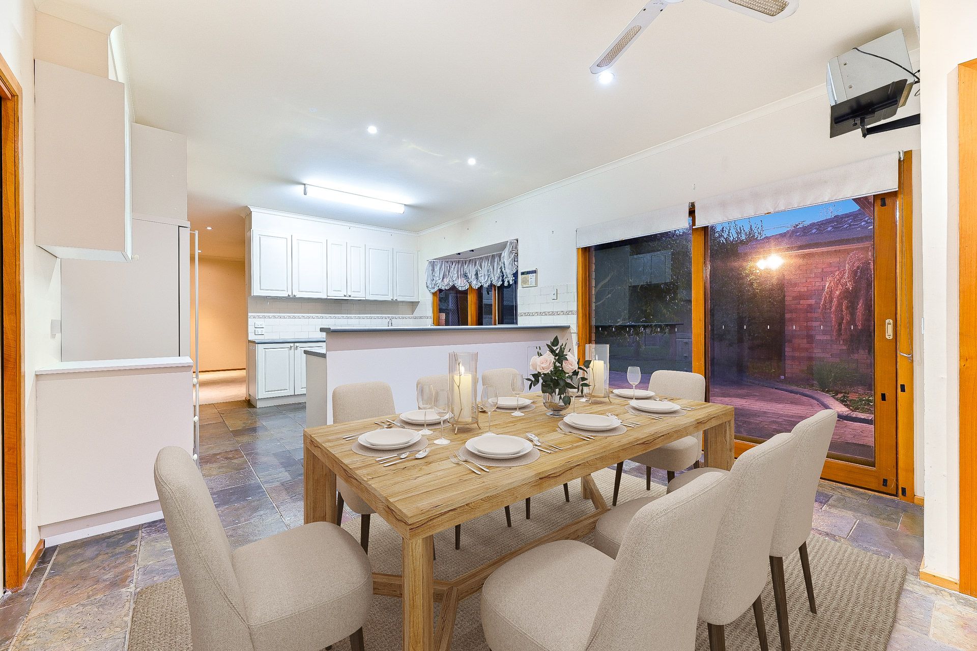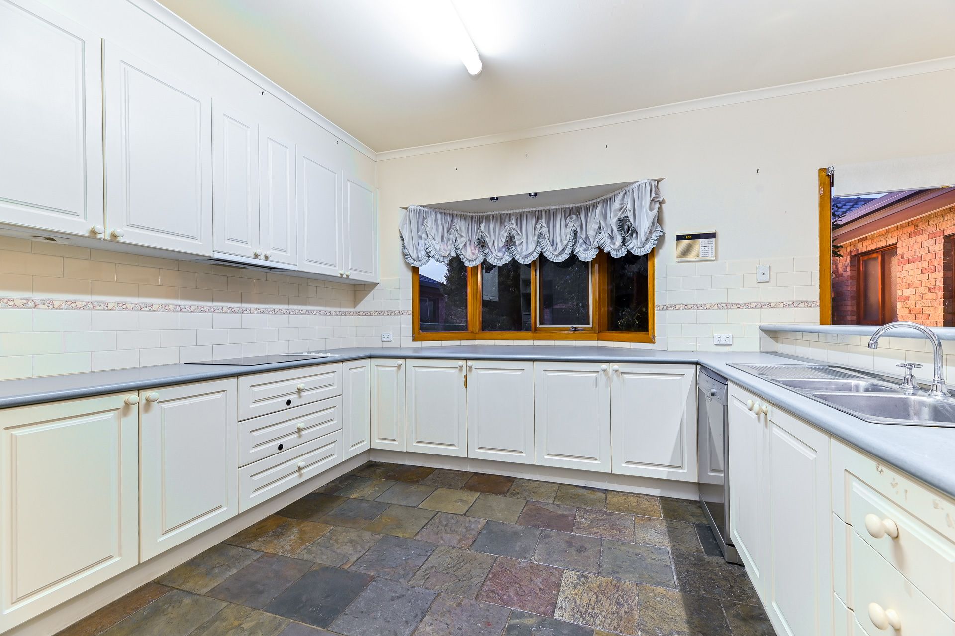 The modern U-shaped kitchen includes plenty of cabinet and bench space, a dishwasher, an electric cooktop and a double stainless-steel sink. It flows seamlessly into a separate meals area.