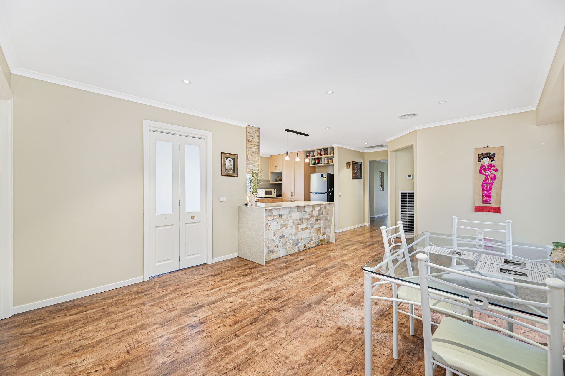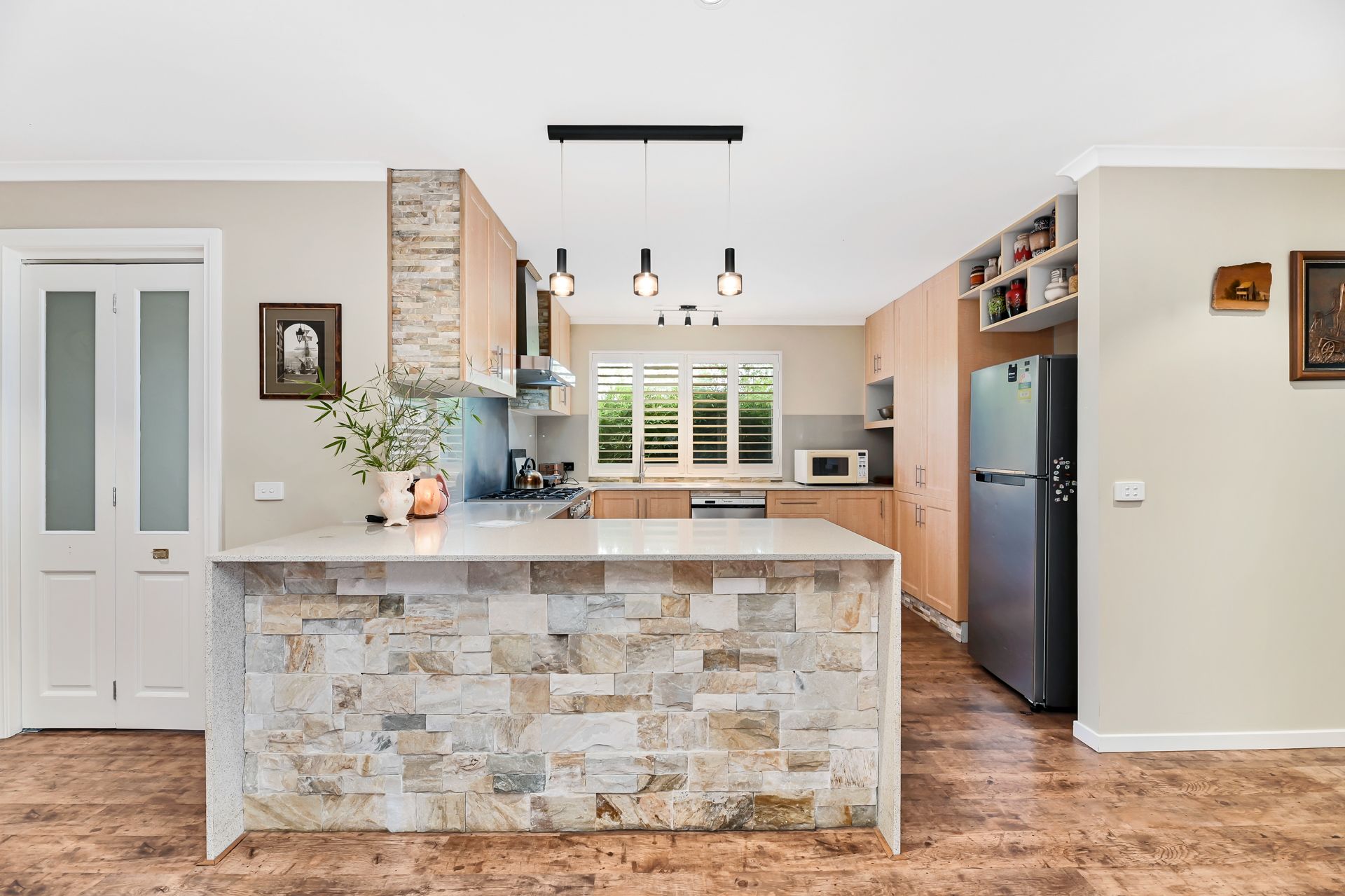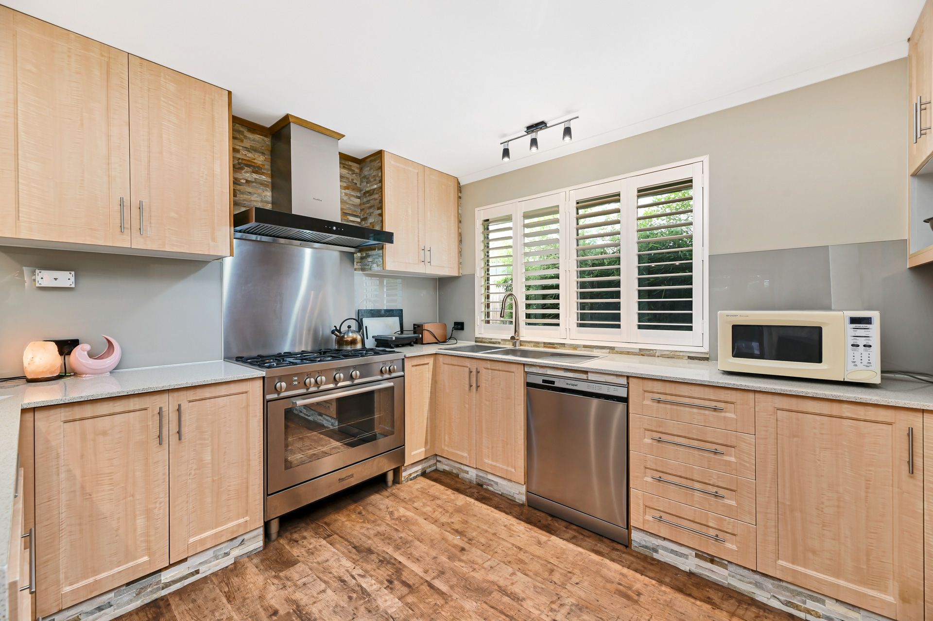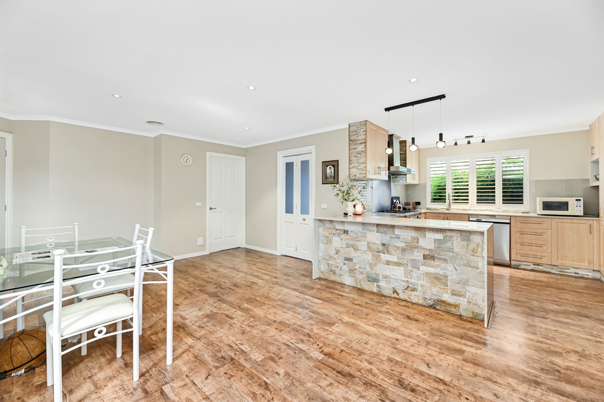 The timber-style kitchen is fully appointed with a stone top bench, glass splashbacks, stylish pendant lighting and quality appliances including a gas cooktop, oven, and dishwasher.