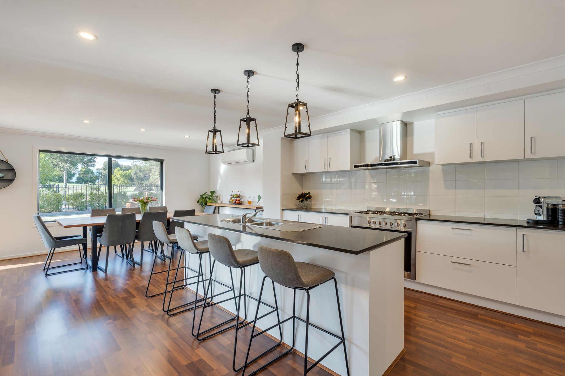 • The perfect place to relax and unwind in total comfort and privacy, and set against a sprawling backyard with established lawn, perimeter gardens, and a golf course outlook, sliding doors roll back to reveal an under-the-roofline alfresco with quality roller blind protection, an extended, timber entertaining deck, and a built-in kitchenette/barbecue.