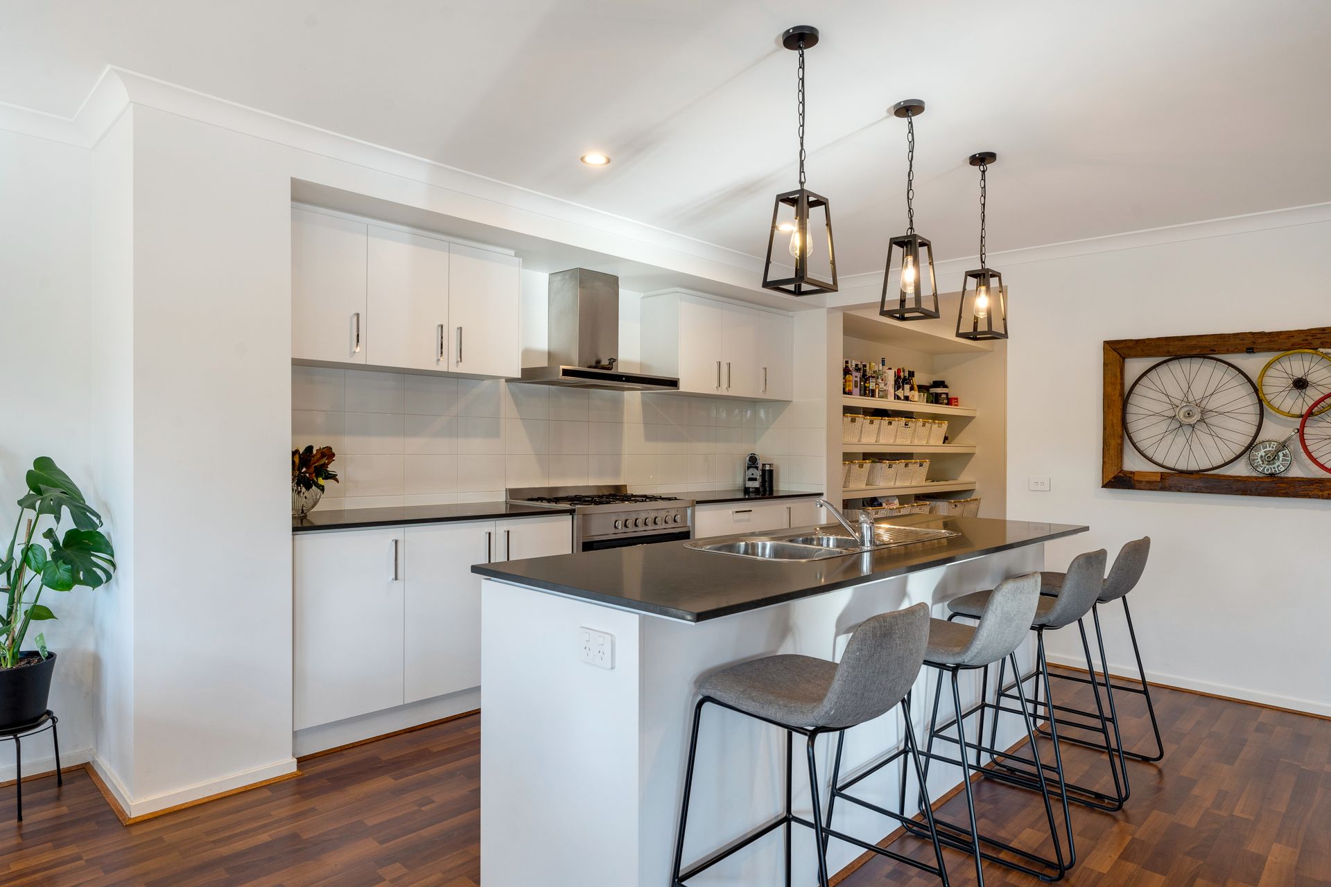 • Offering effortless entertaining, the lavish kitchen/living/dining zone is anchored by a gourmet kitchen boasting a generous, sit-up dining island, smooth stone surfaces, custom cabinetry, tiled backsplash, premium stainless-steel appliances, and a gorgeous walk-in pantry with access through to the garage.
