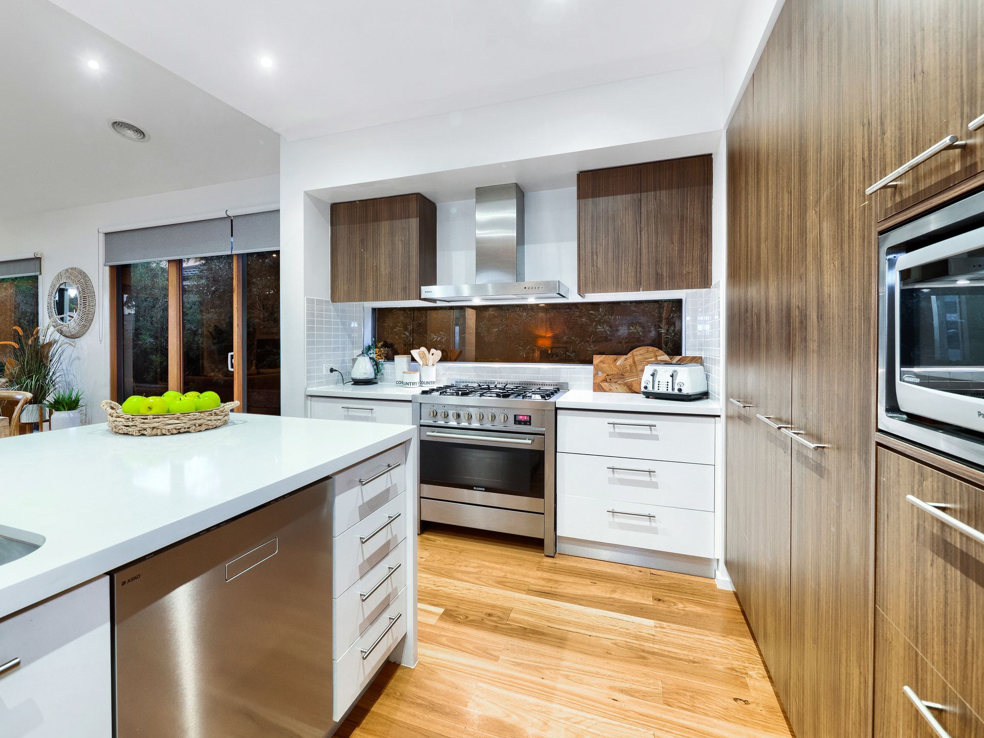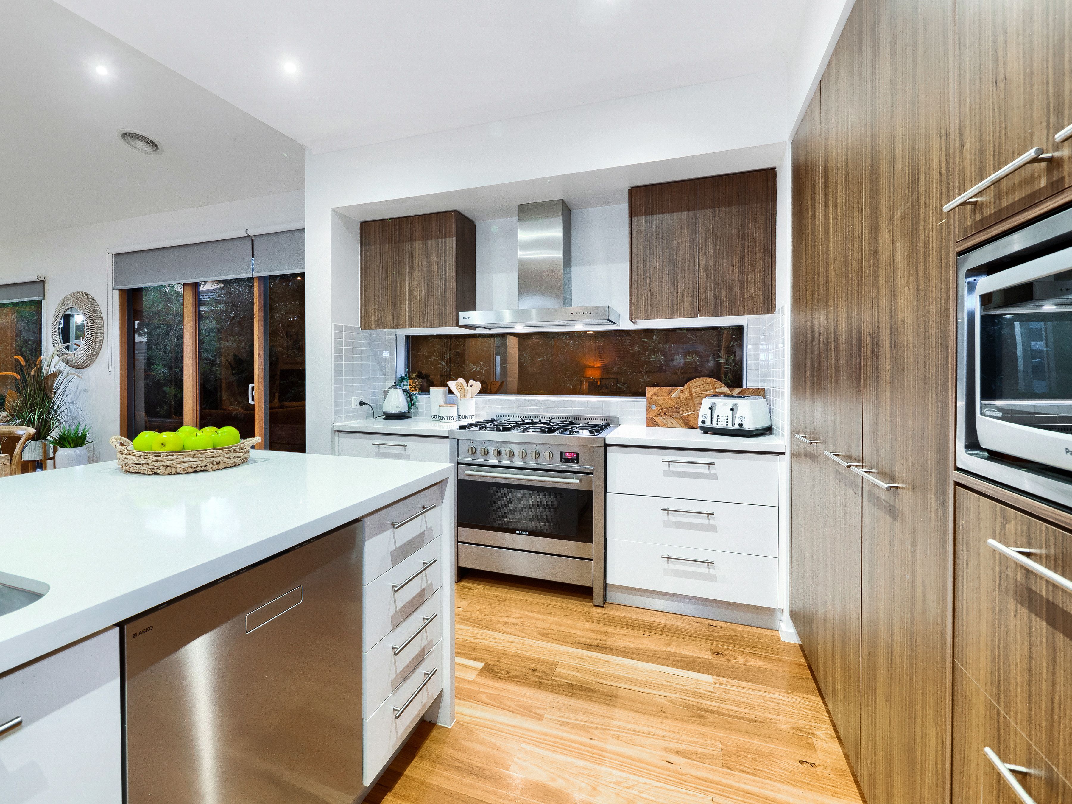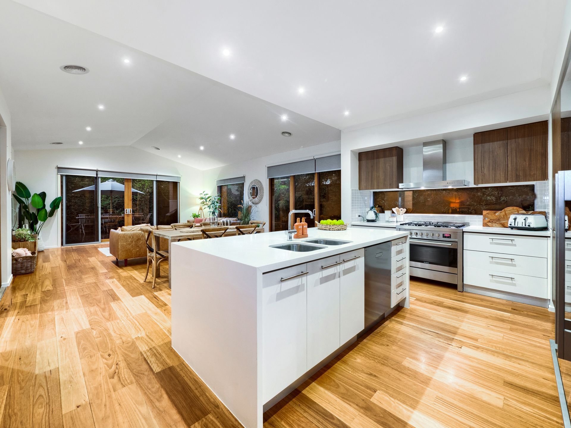 Spotted-gum flooring, a 3.3 metre vaulted ceiling and high clearing windows frame the leafy surrounds that define the generously sized family room, which flows out through sliding glass doors into the spacious outdoor entertainer's deck. Complete with a timber-lined alfresco with both covered and sun-splashed zones to enjoy throughout the seasons, this space has to be one of the major selling attractions!
