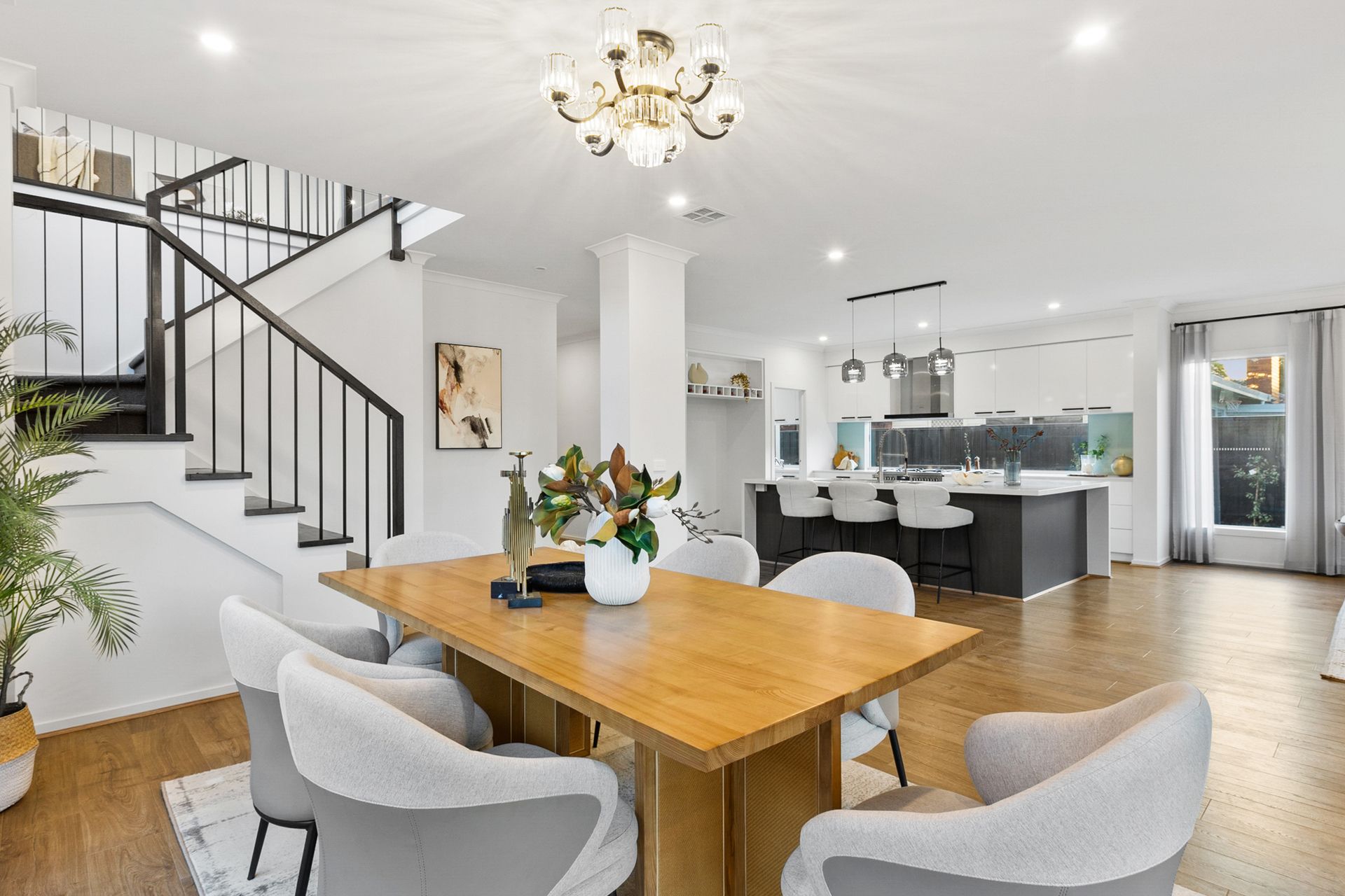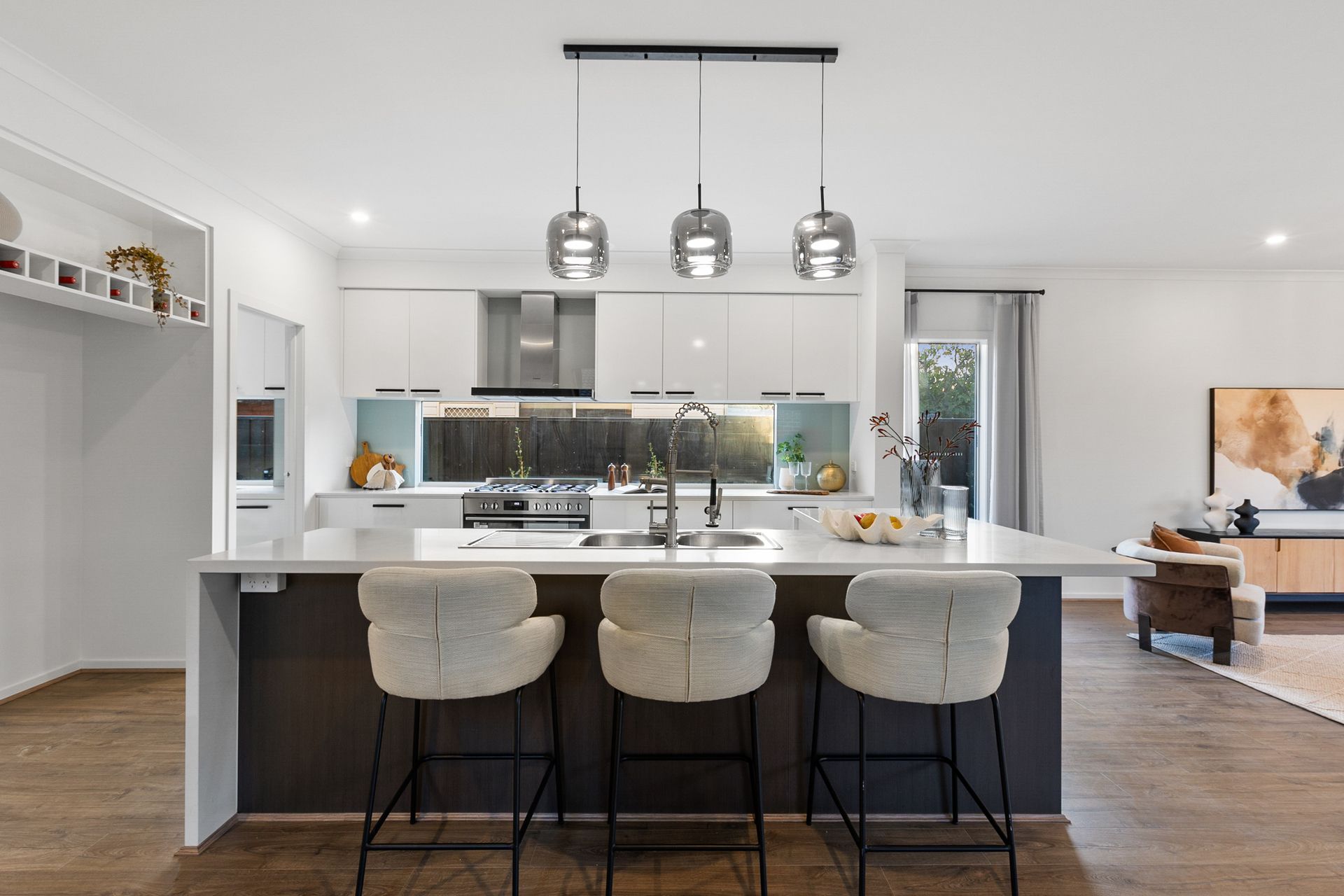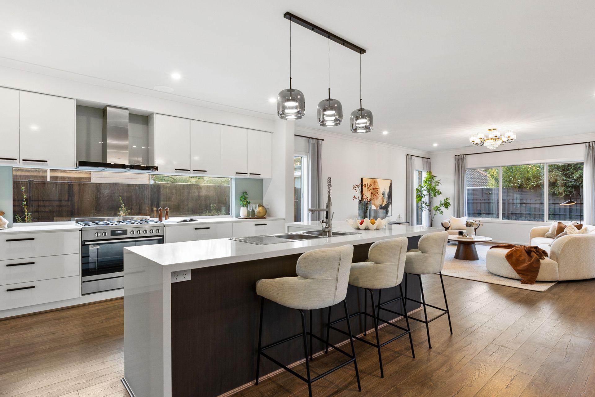 A glamorous open plan kitchen, dining and family room forms a fabulous hub for everyday life complete with waterfall stone benches, an island breakfast bench, 900mm Westinghouse oven/gas stove, Technika dishwasher plus a butler's pantry with gas stove.