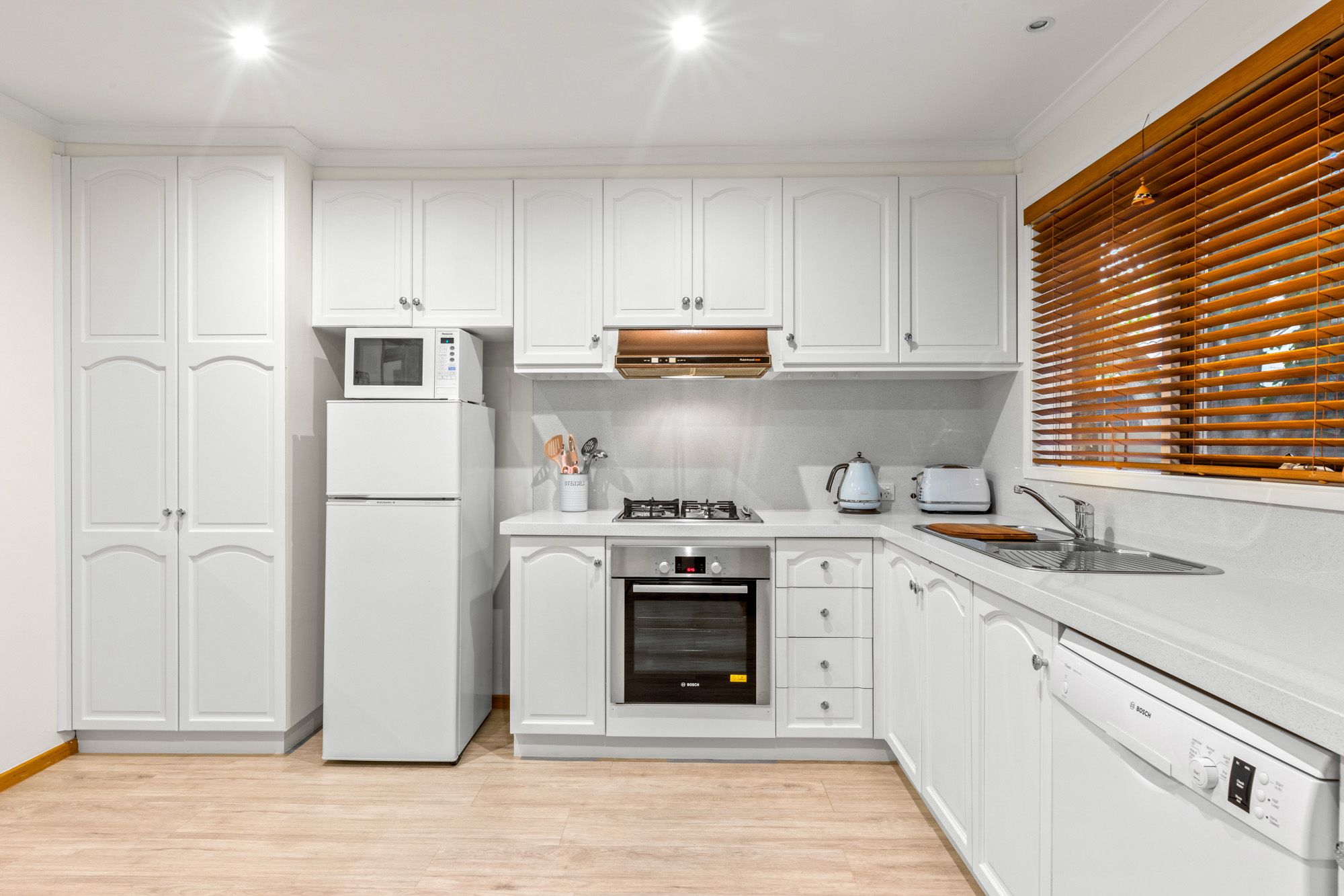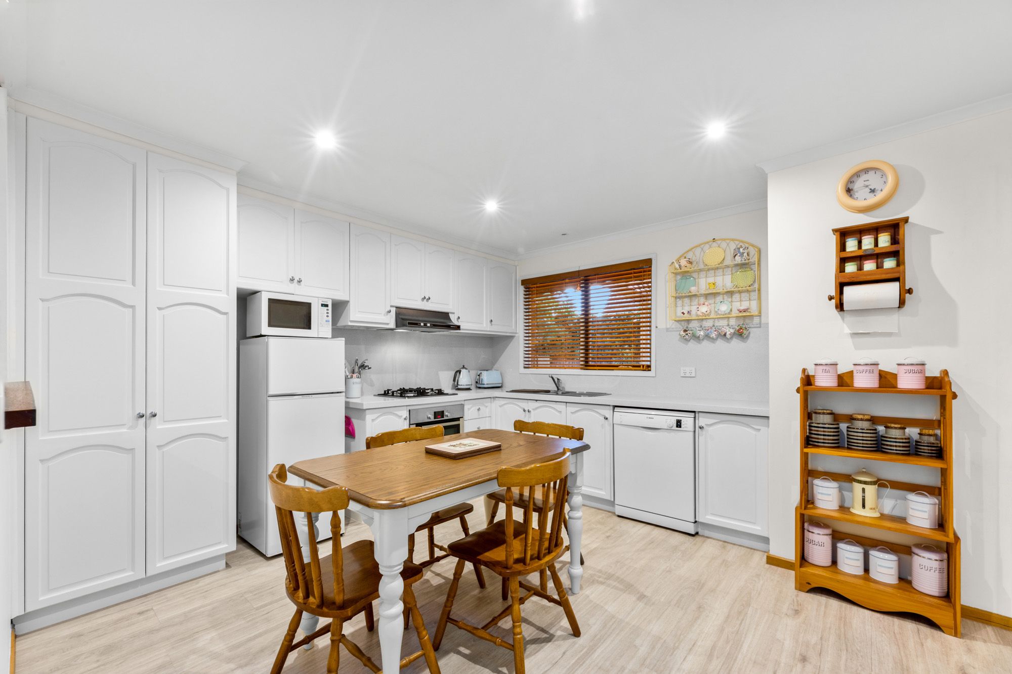 Highlighted by a charming bay window, the spacious lounge provides a comfortable area to unwind and connects seamlessly to the kitchen and meals zone. You'll appreciate the abundance of storage and top-notch European appliances, including a gas stove, oven, and German-made dishwasher.