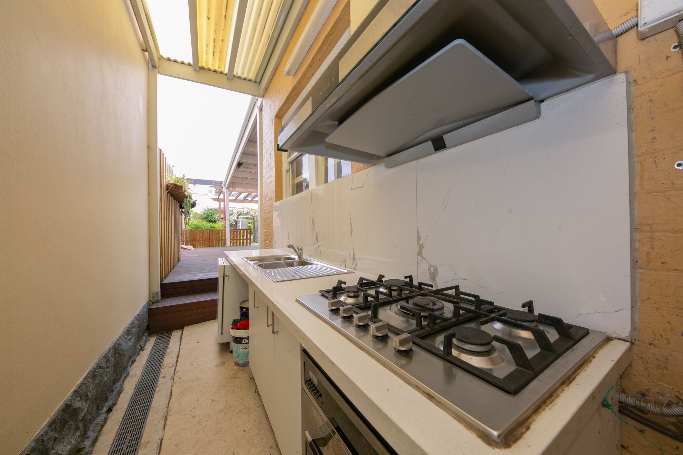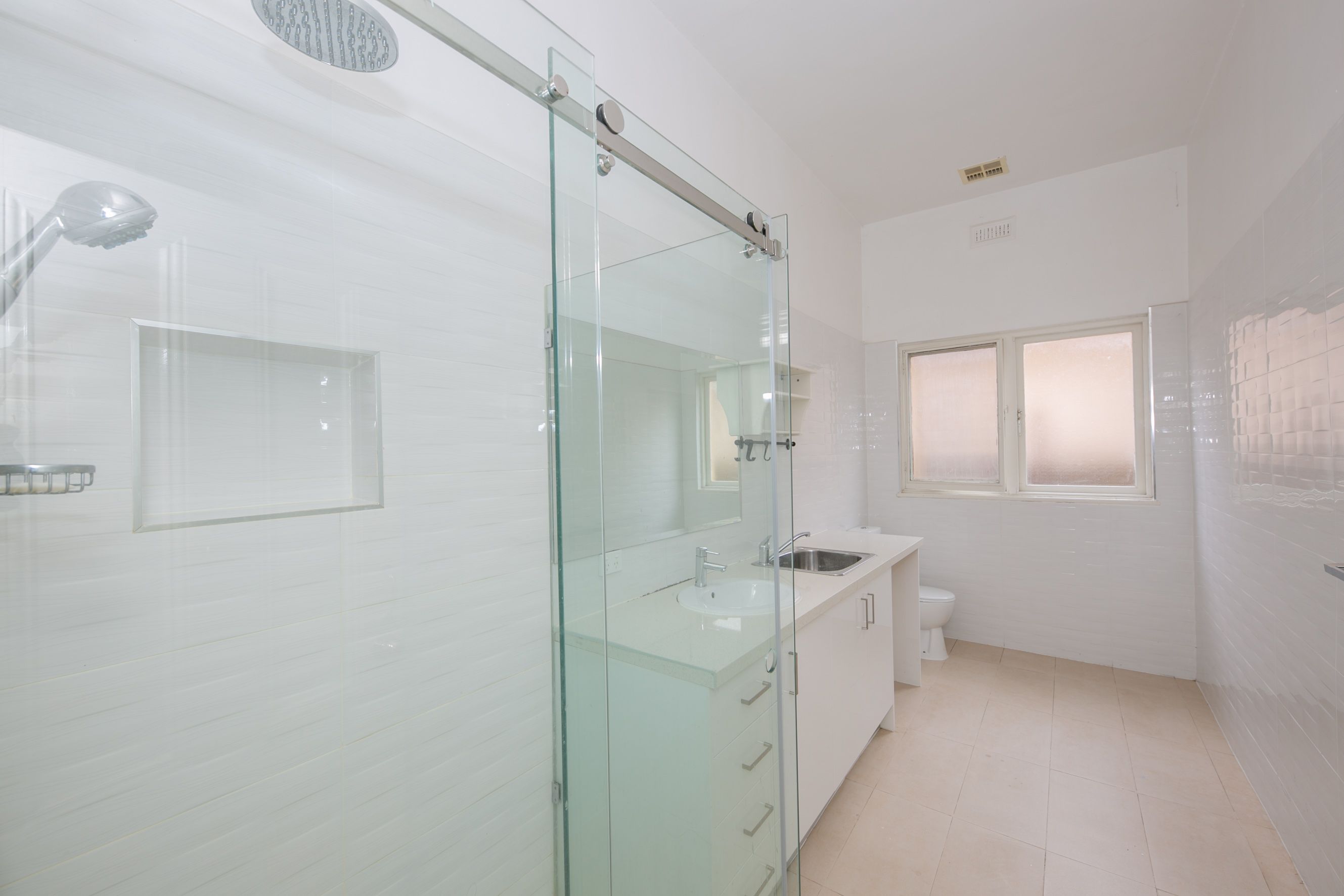 A bright kitchen with gas cooking and good cupboard space. A renovated bathroom/laundry.
