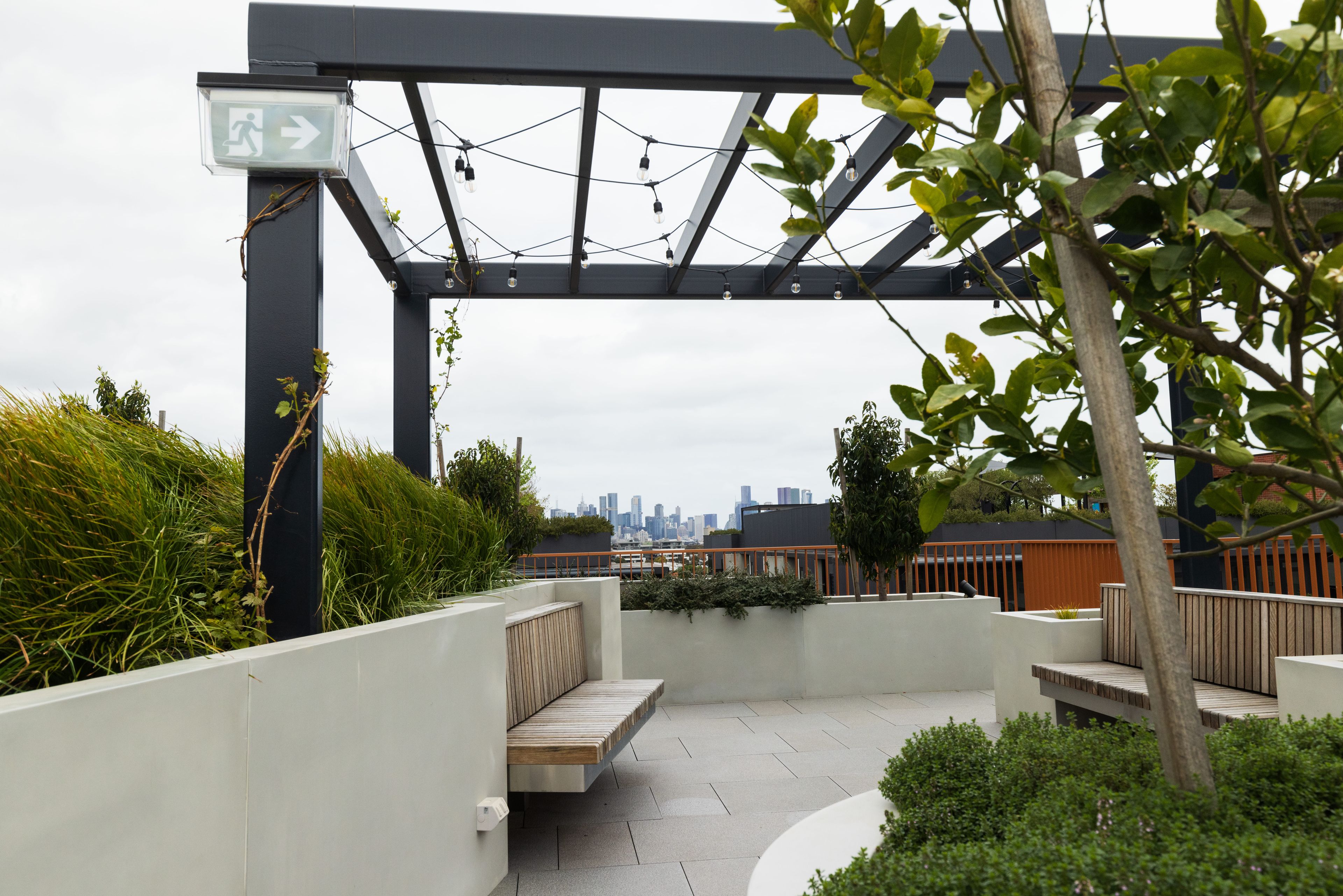 A full-length stacker door provides seamless access to an undercover balcony for relaxed indoor-outdoor lifestyle enjoyment; when it's time to entertain, head up to the communal rooftop entertaining area, where pergolas, seating nooks, portable cube seating and an attractive maze of colourful garden beds help to create distinct spaces and mean there's plenty of room for all, any time of day!