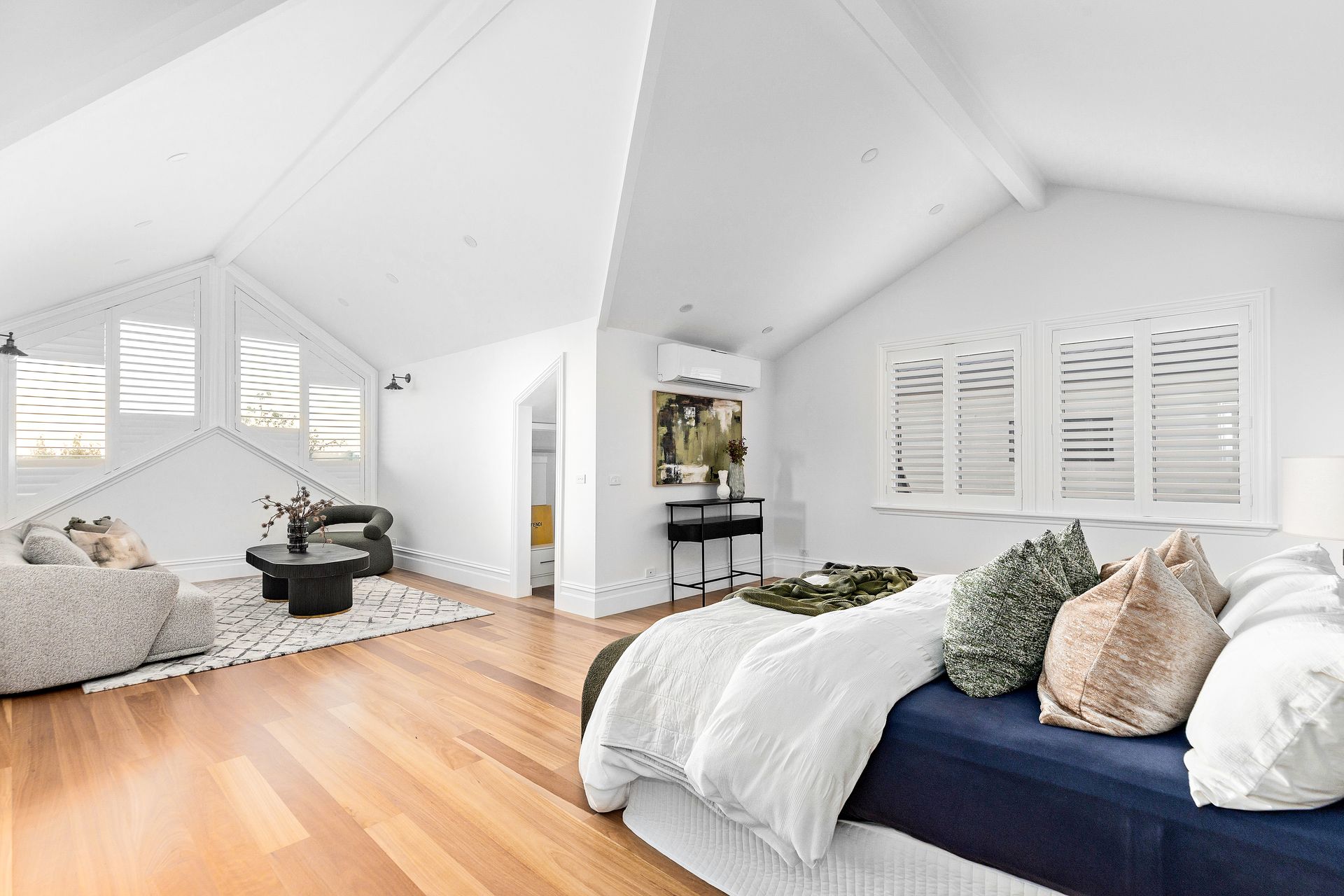 At its heart, a breathtaking open-plan living and dining domain showcases dramatic vaulted ceilings, a feature fireplace and seamless connection to a kitchen appointed with an oversized island bench, premium Smeg appliances and extensive storage. Blackbutt hardwood flooring, bespoke joinery and carefully curated finishes elevate every space, while ducted heating and split systems throughout ensure year-round comfort.