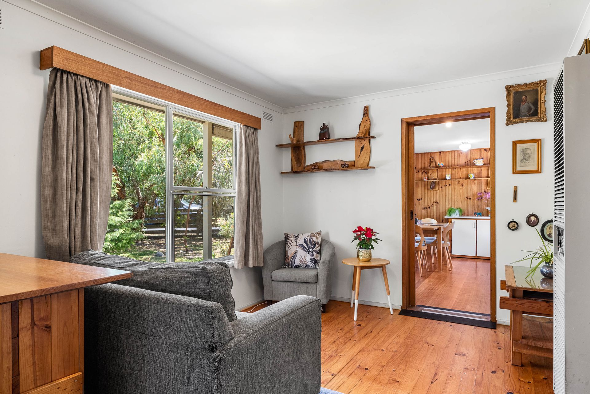 The heart of the home is the light-filled living and dining area, where large windows capture natural light and create a relaxed, welcoming atmosphere, with a central split-system for all-year round comfort. The adjoining kitchen is functional and well positioned, offering practical storage and bench space while maintaining a connection to the main living zone.