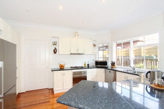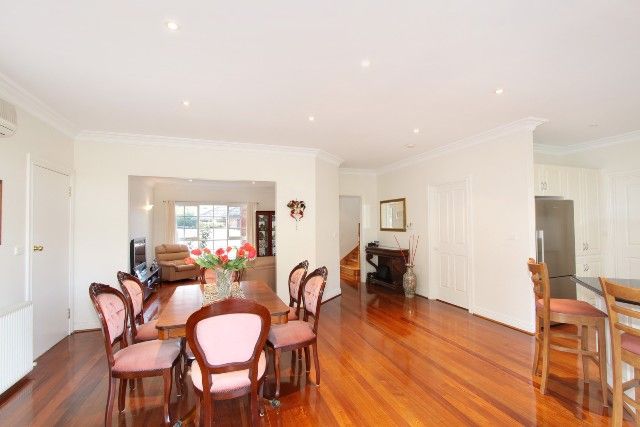 An enchanting faade with a surprising floorplan, this 5 bedroom + study, 2.5 bathroom street front home provides endless flexibility with its 8 principal rooms. Warm and welcoming with its timber floors, this sun filled home enjoys a sunken north facing living room, modern kitchen (European appliances), spacious dining area, downstairs main bedroom (BIRs & ensuite), 5th bedroom/2nd living, separate toilet & laundry. With cathedral ceilings, upstairs, there is the flexibility of up to 4 bedrooms (BIRs) or utilise two of the bedrooms as a study or upstairs living area with dormer window plus a spa bathroom. Quality appointed, this well maintained home features hydronic heating, R/C air conditioning, great storage, auto garage with rear rollerdoor and French doors lead from the dining area to a delightful verandah and paved courtyard garden.
