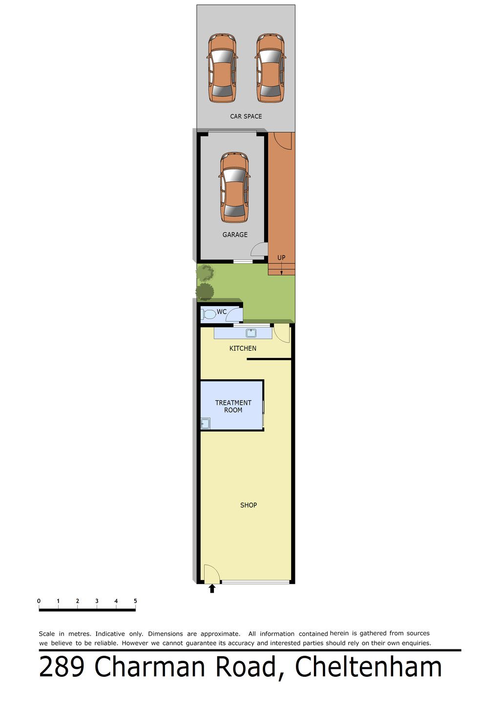 Building facilities include the main shop area, treatment room, kitchen area and a rear yard toilet, along with a single garage with dual access and two further parking spaces.