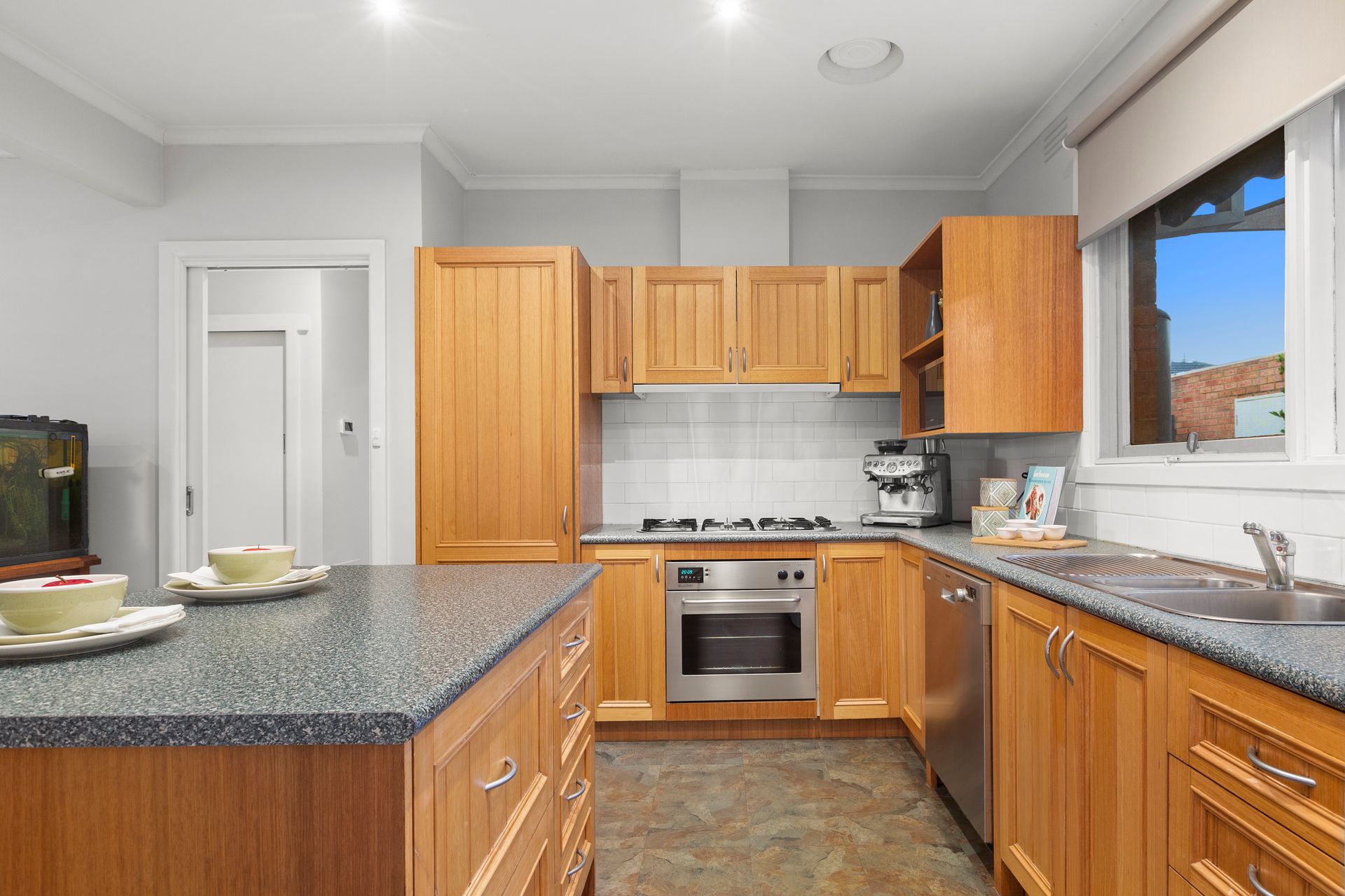 Sun-filled open plan living and dining, and a large Tassie Oak kitchen equipped with stainless steel cooking appliances and a dishwasher, excellent storage, and an island bench/breakfast bar at the centre - or take it out into an enticing, north-facing entertaining courtyard where you can enjoy the morning to afternoon sunshine and solitude at once!