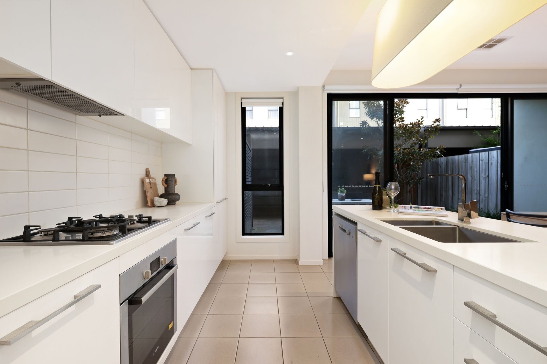 The light-filled open-plan living, dining, and kitchen area is spacious and welcoming, with a cleverly concealed laundry and a convenient powder room for guests. The kitchen is well-appointed with an island bench, Bosch appliances including a gas cooktop, oven and dishwasher, and ample storage.