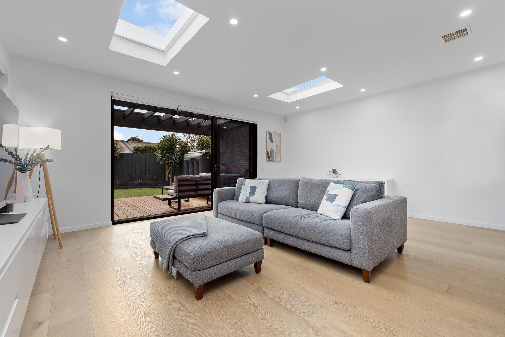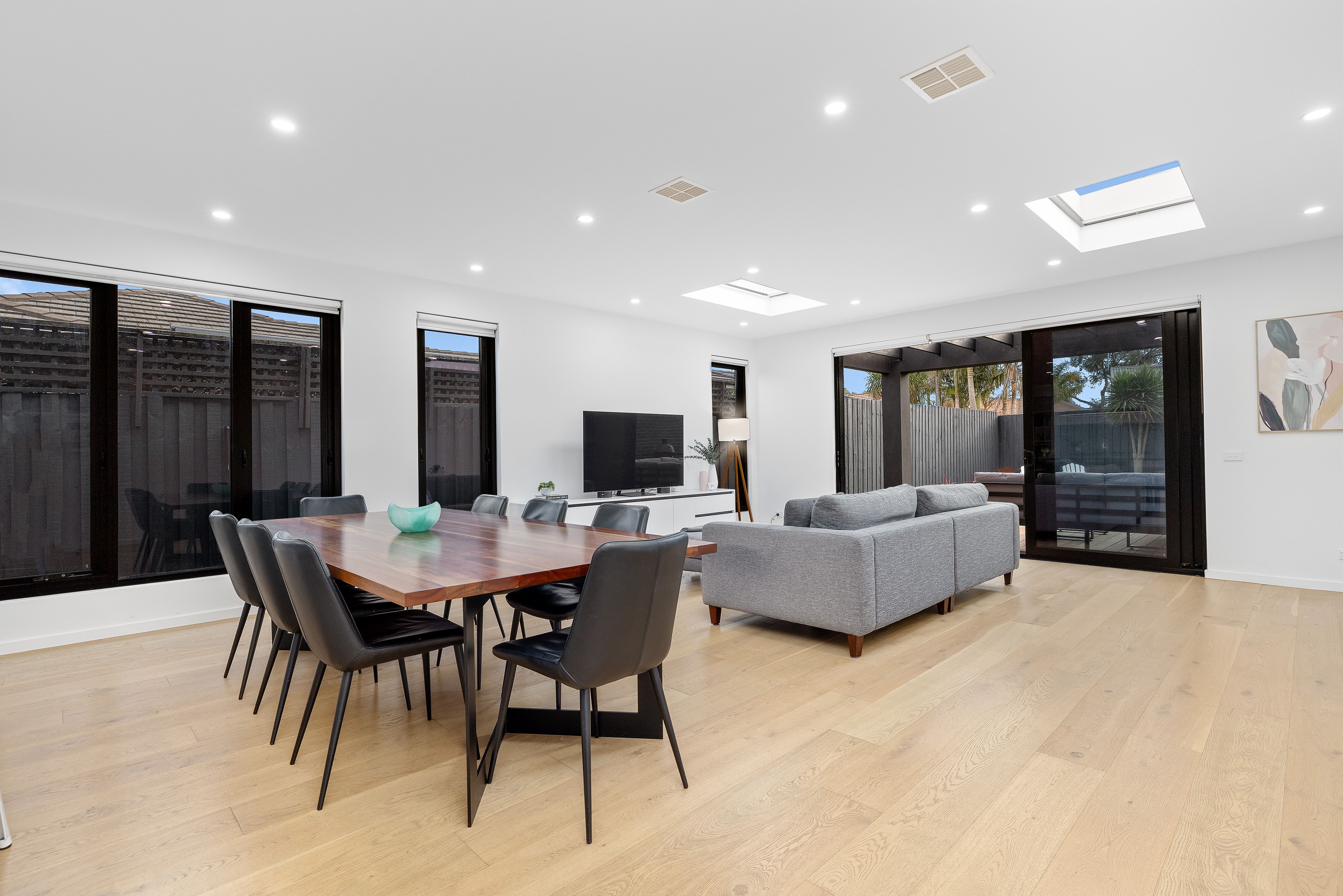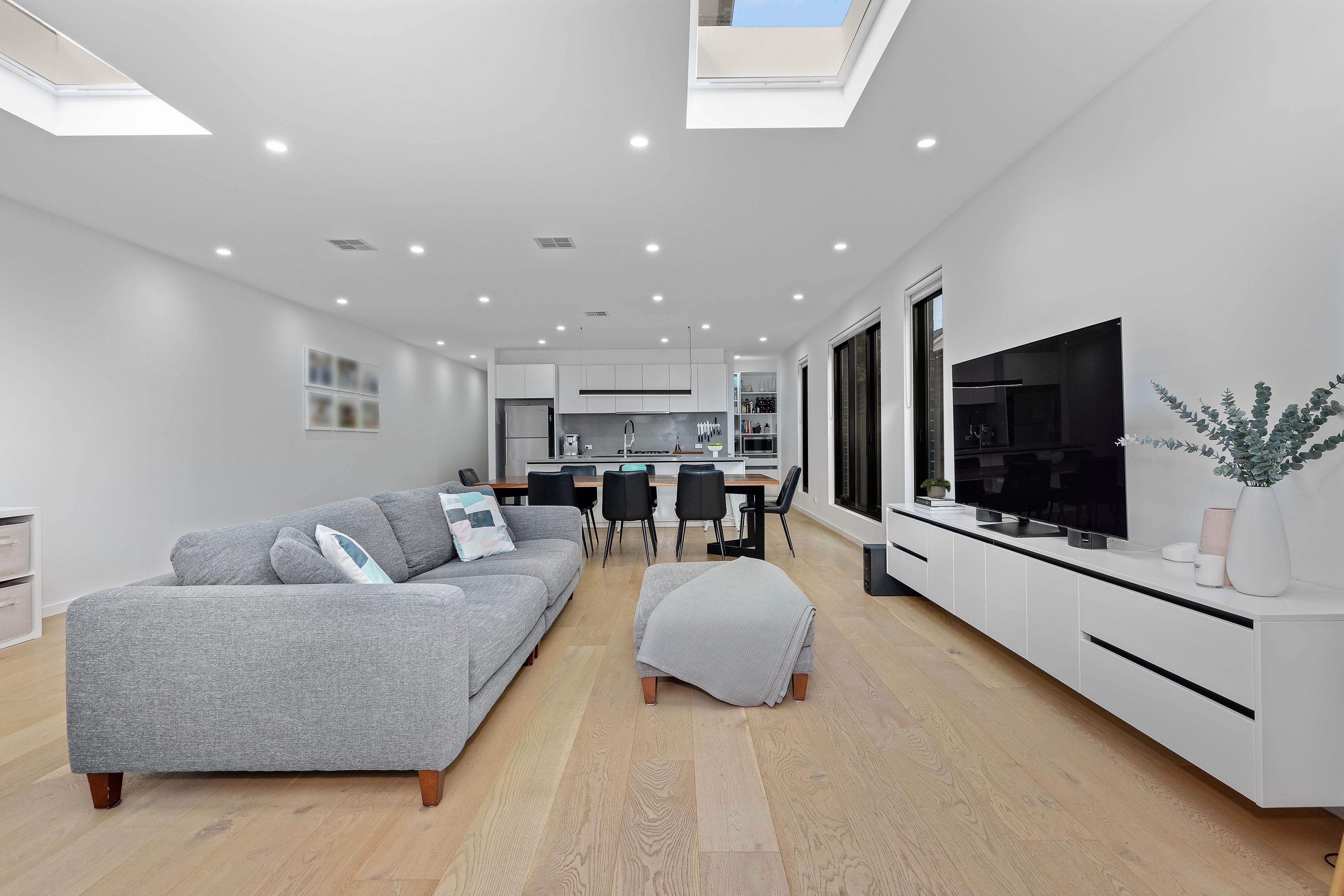 Broad engineered hardwood flooring and lightly hued interiors create an immediate sense of space and calm, flowing effortlessly into a vast open-plan living and dining domain. Bathed in natural light thanks to skylights and double-glazed windows, this welcoming space is perfectly crafted for both intimate family moments and large-scale entertaining. Sliding doors connect seamlessly to an alfresco deck and landscaped rear garden, where sunny afternoons and barbecue gatherings are elevated by a gas-mains hookup and ample room for children to play.