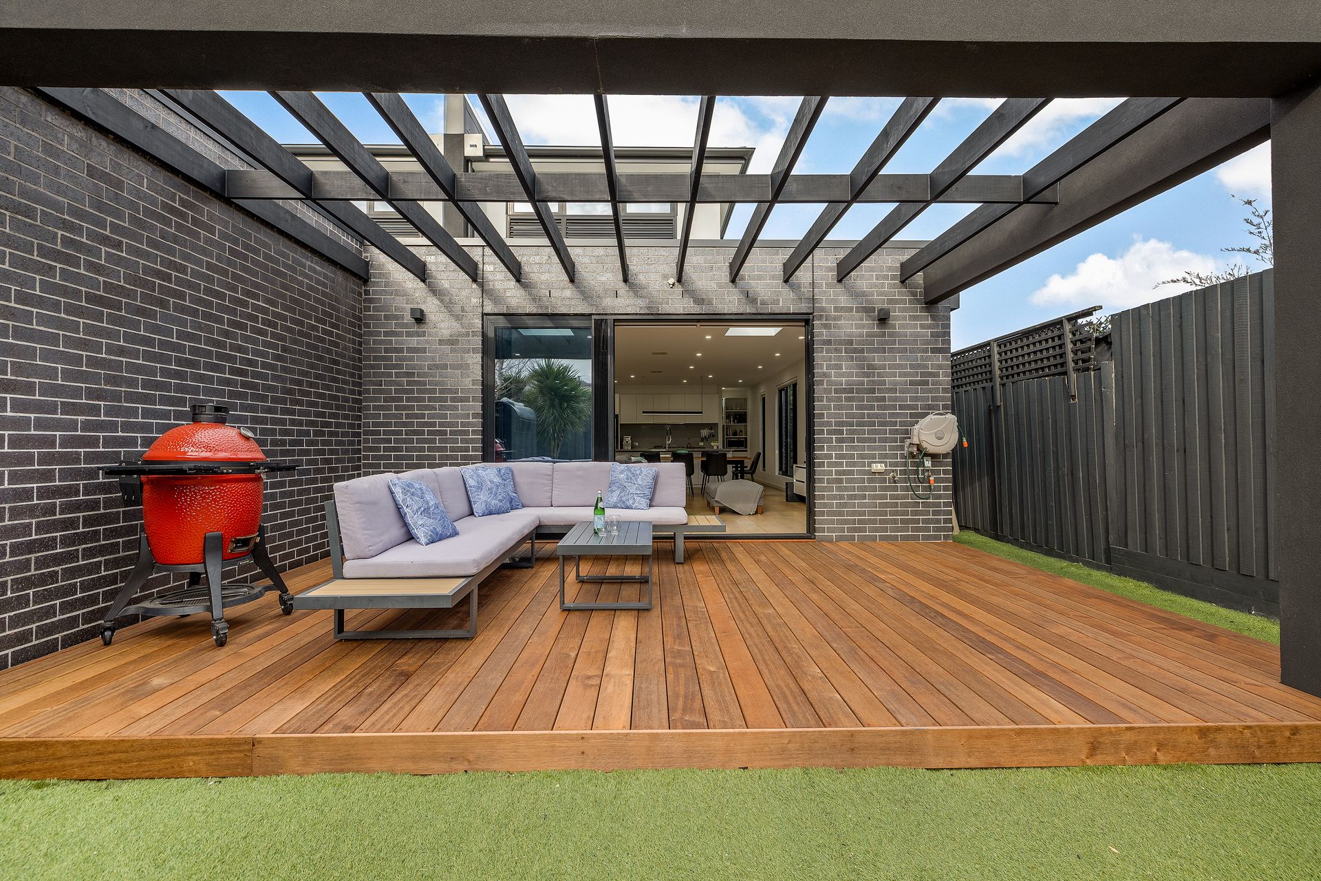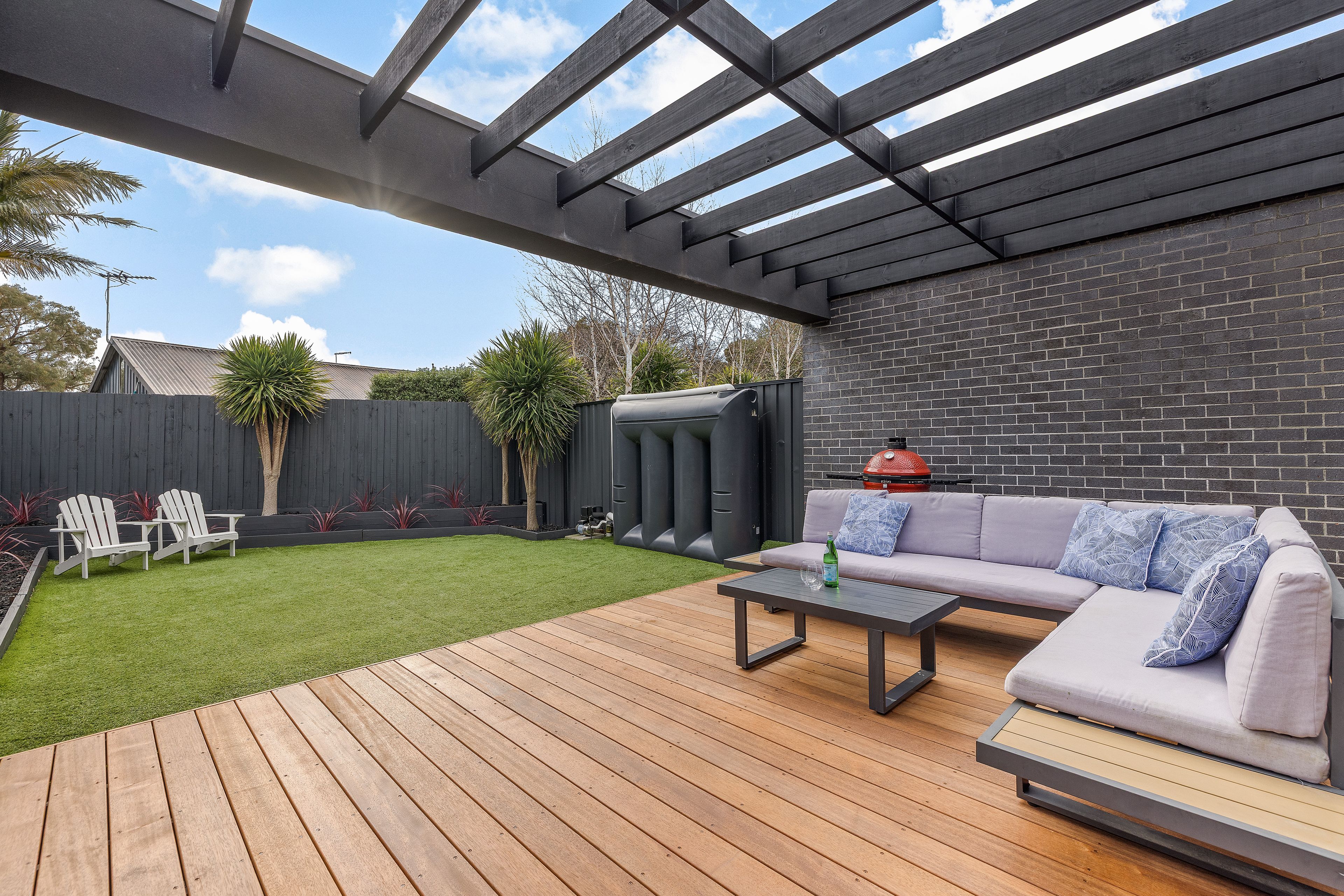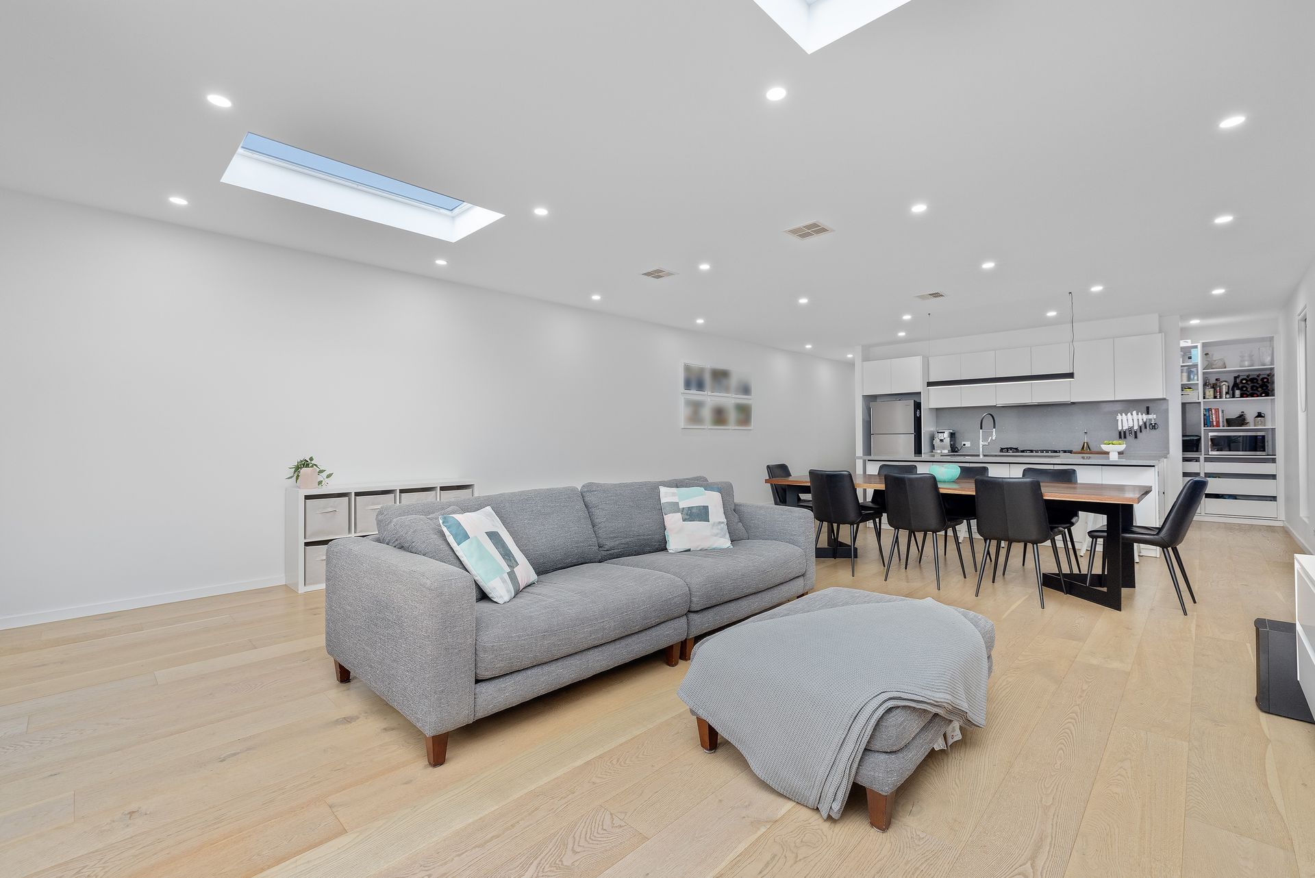 Broad engineered hardwood flooring and lightly hued interiors create an immediate sense of space and calm, flowing effortlessly into a vast open-plan living and dining domain. Bathed in natural light thanks to skylights and double-glazed windows, this welcoming space is perfectly crafted for both intimate family moments and large-scale entertaining. Sliding doors connect seamlessly to an alfresco deck and landscaped rear garden, where sunny afternoons and barbecue gatherings are elevated by a gas-mains hookup and ample room for children to play.