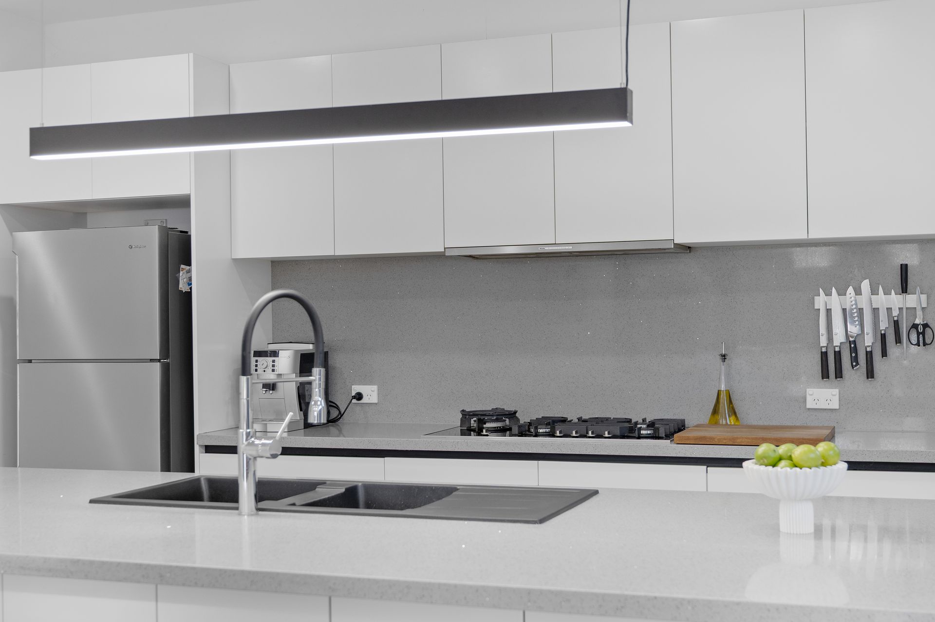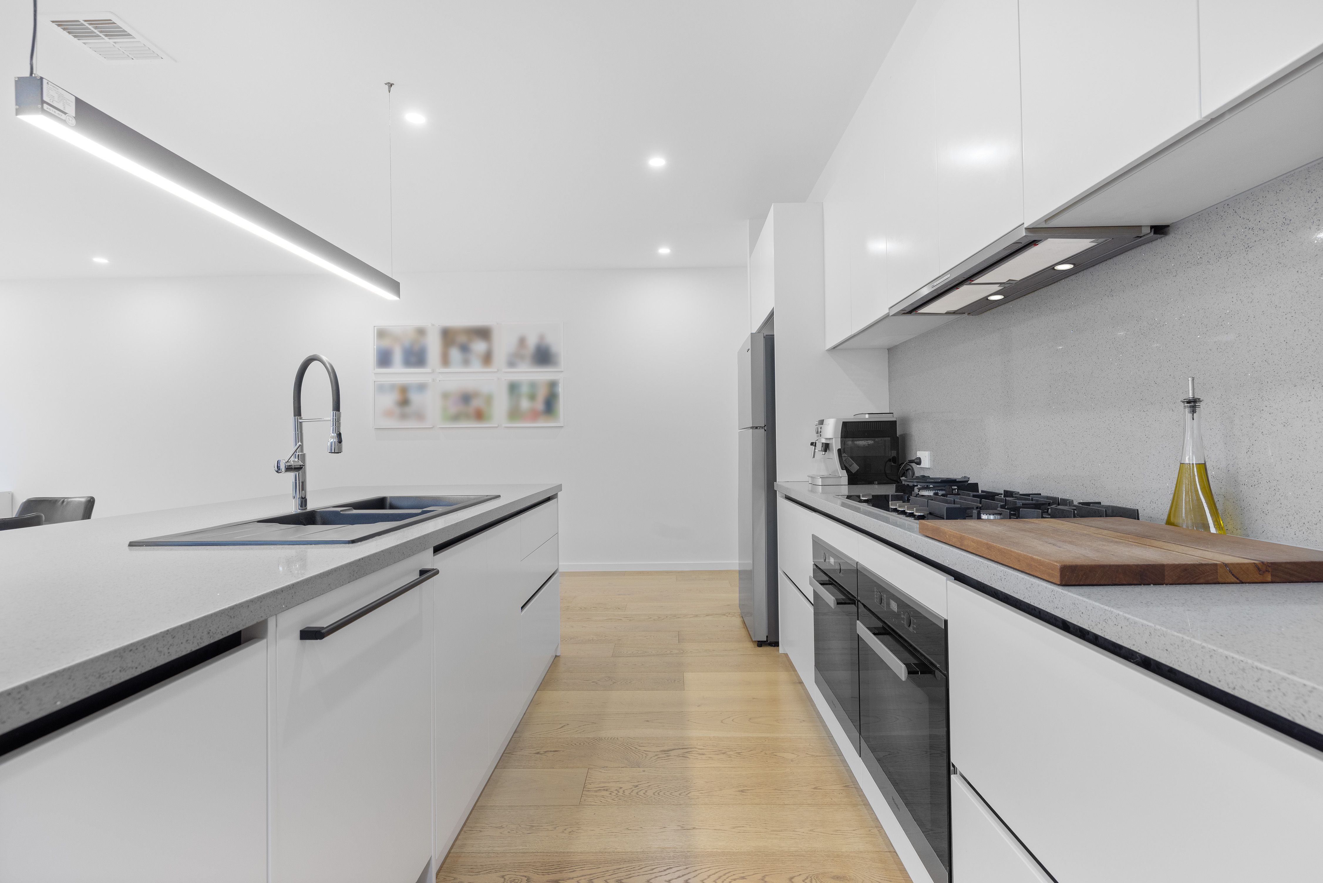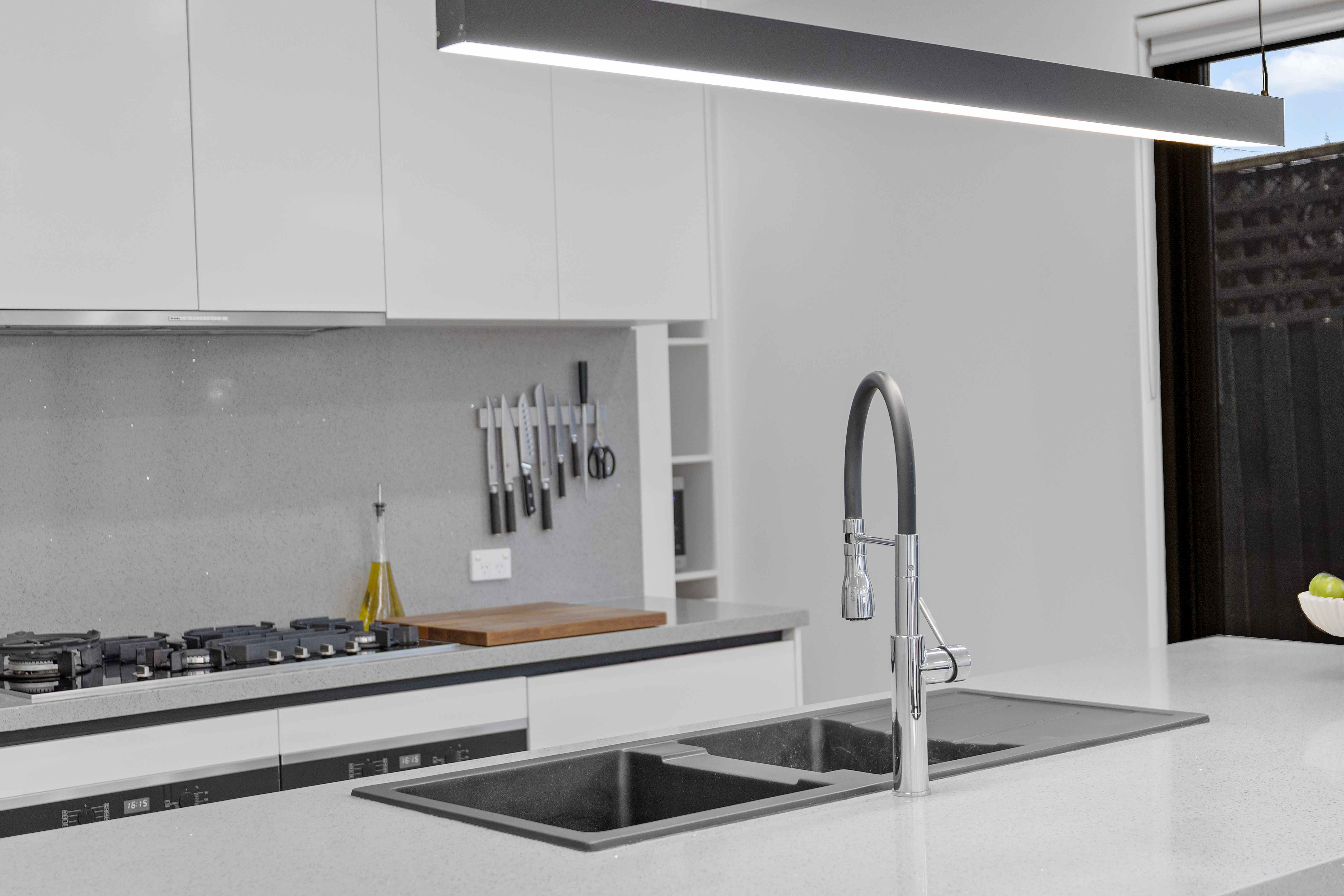 At the heart of the home, the gourmet kitchen combines striking design with everyday practicality. A stone-topped island and breakfast bar form the centrepiece, complemented by premium Miele appliances, a glass splashback, pendant lighting, and an impressive butler's pantry featuring a third sink and filtered water system. Whether it's a family dinner or a festive occasion, this culinary hub ensures both style and functionality.