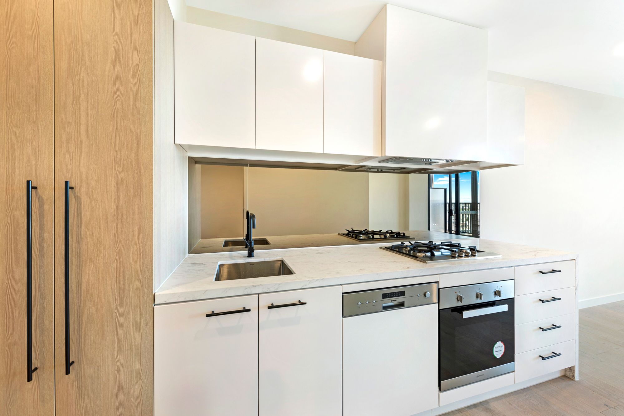 - Elegant marble-look stone bench top kitchen with European gas cooking, oven and a