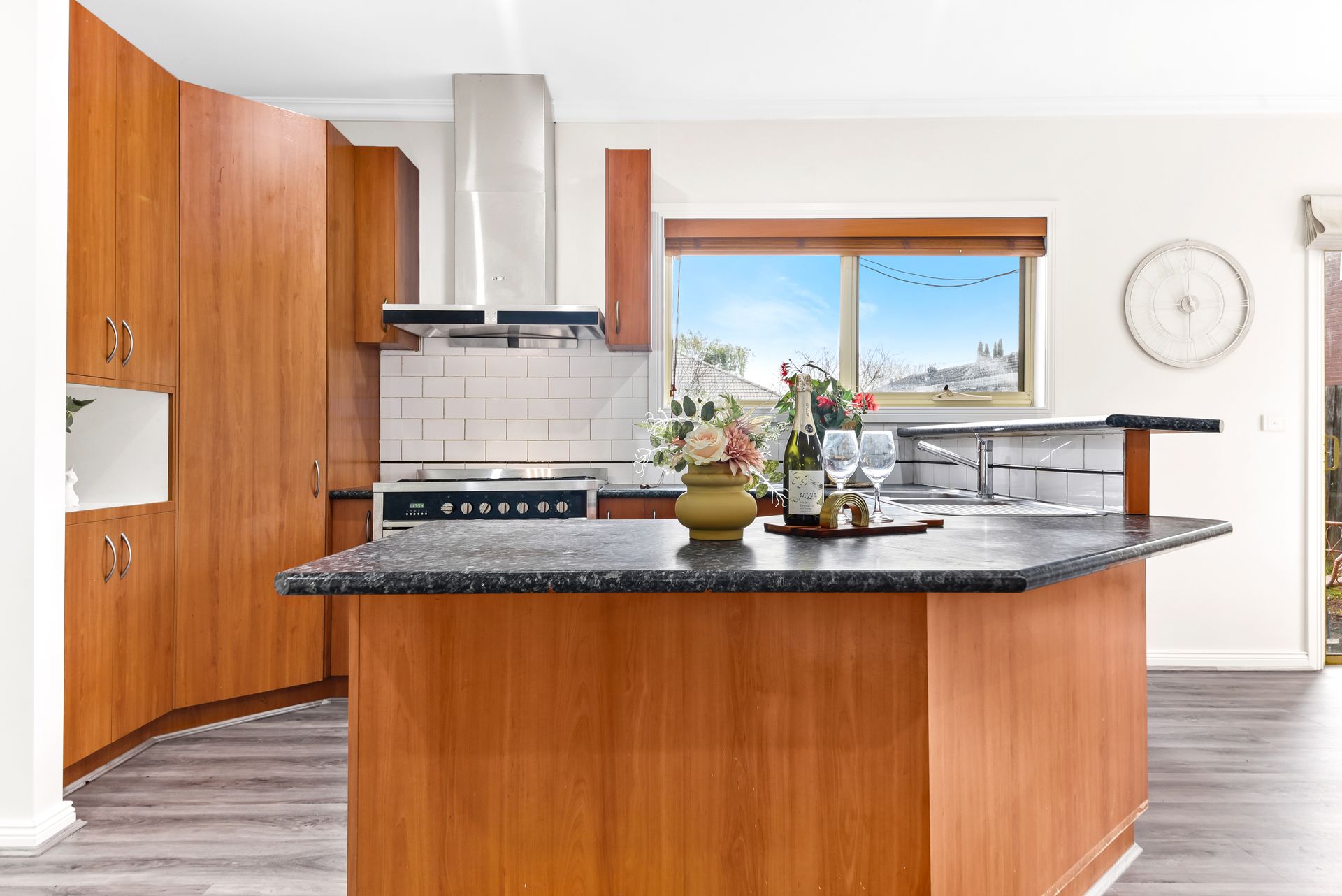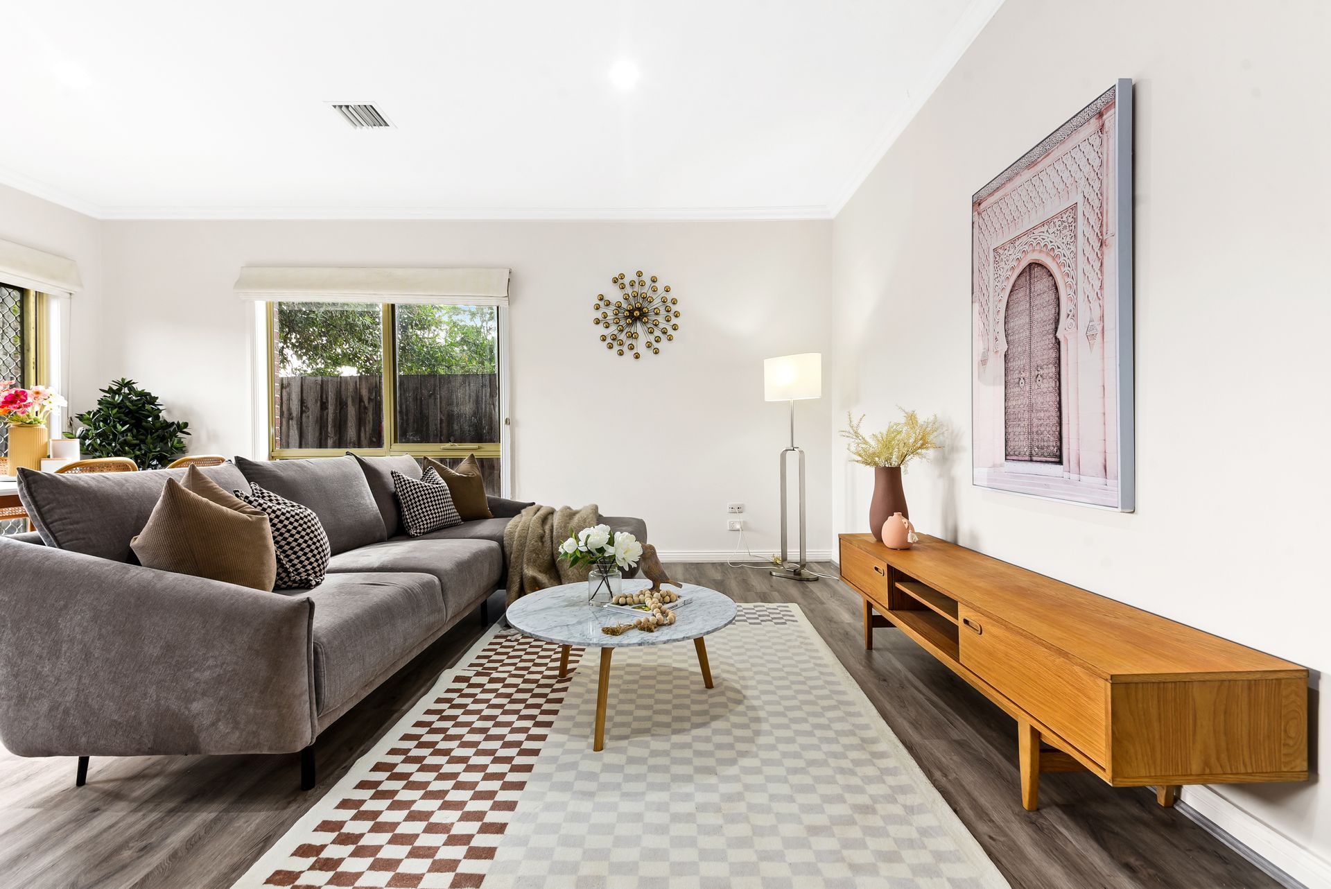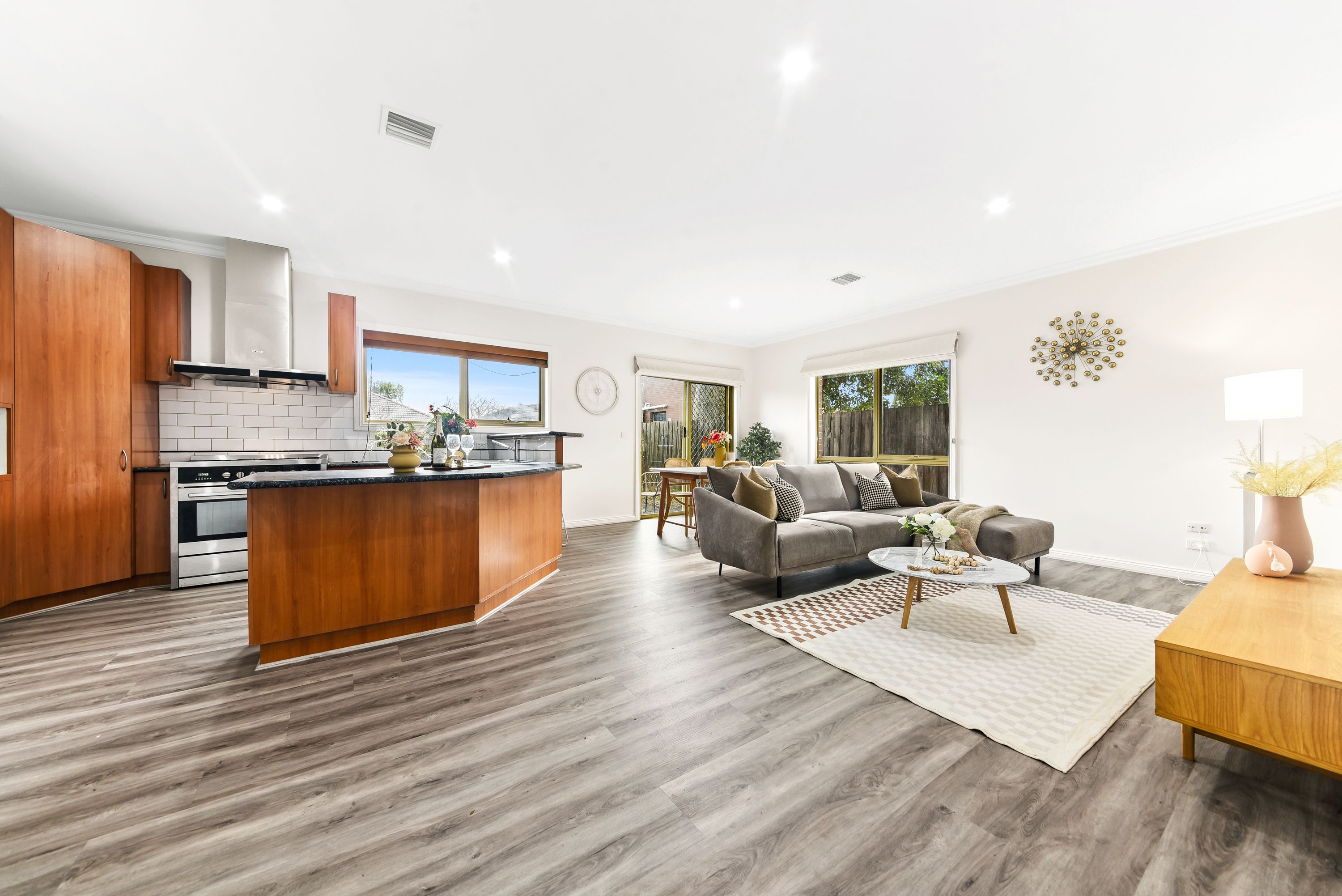 The open-plan living and dining area seamlessly connect to the kitchen, creating a cohesive space that's perfect for both everyday living and special occasions. Large windows and thoughtful design elements enhance the sense of space and light throughout the home.