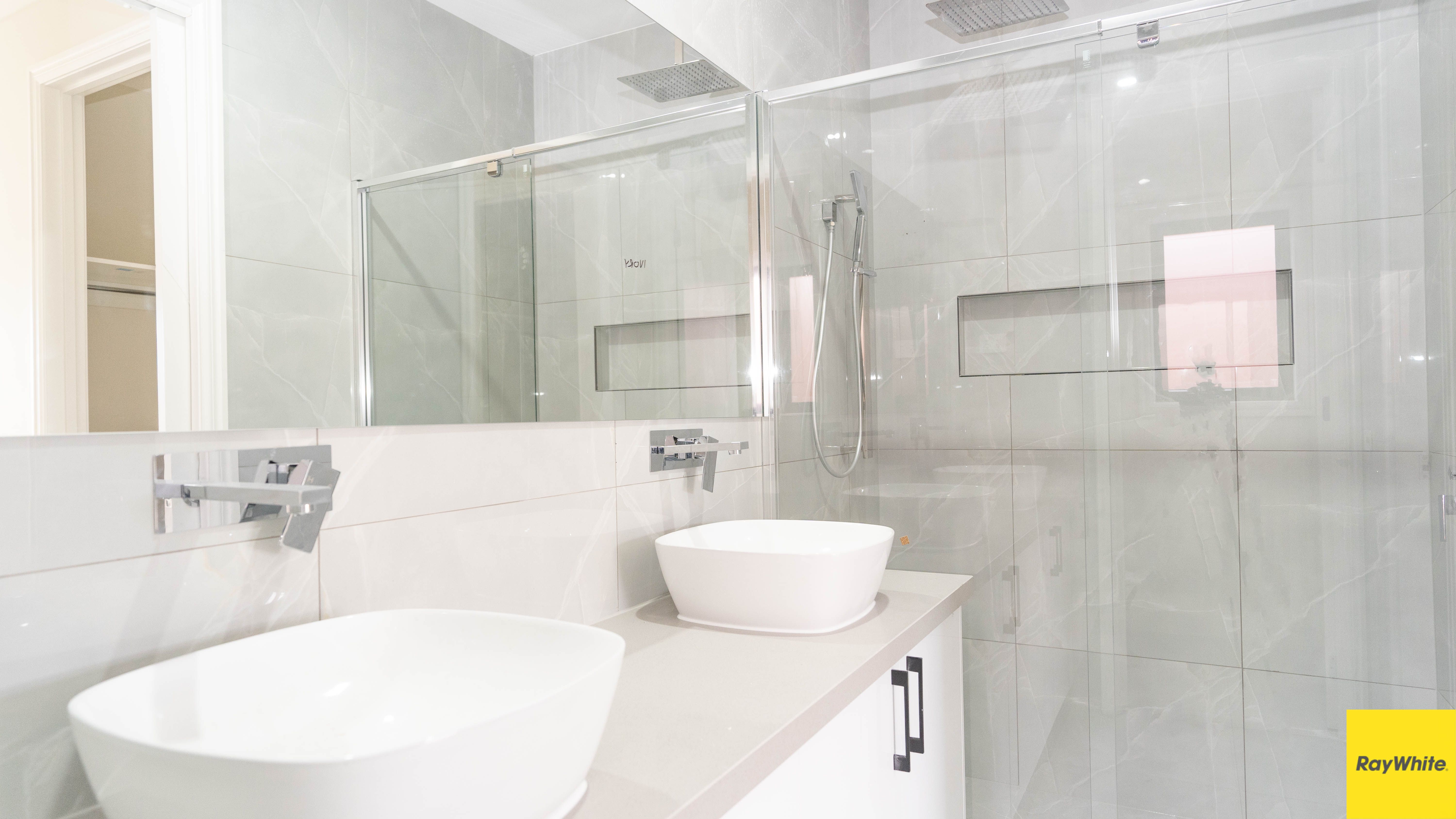 The huge master bedroom includes WIR plus a lavish en-suite with his and her walk-in robe and complete vanity & shower. Three light & bright bedrooms with built-in mirror wardrobes are conveniently positioned nearby to the main family bathroom. A free-standing bathtub, large frameless shower, double vanity with stone finishes, and a mirror offer a relaxing experience right from the comfort of your own home.