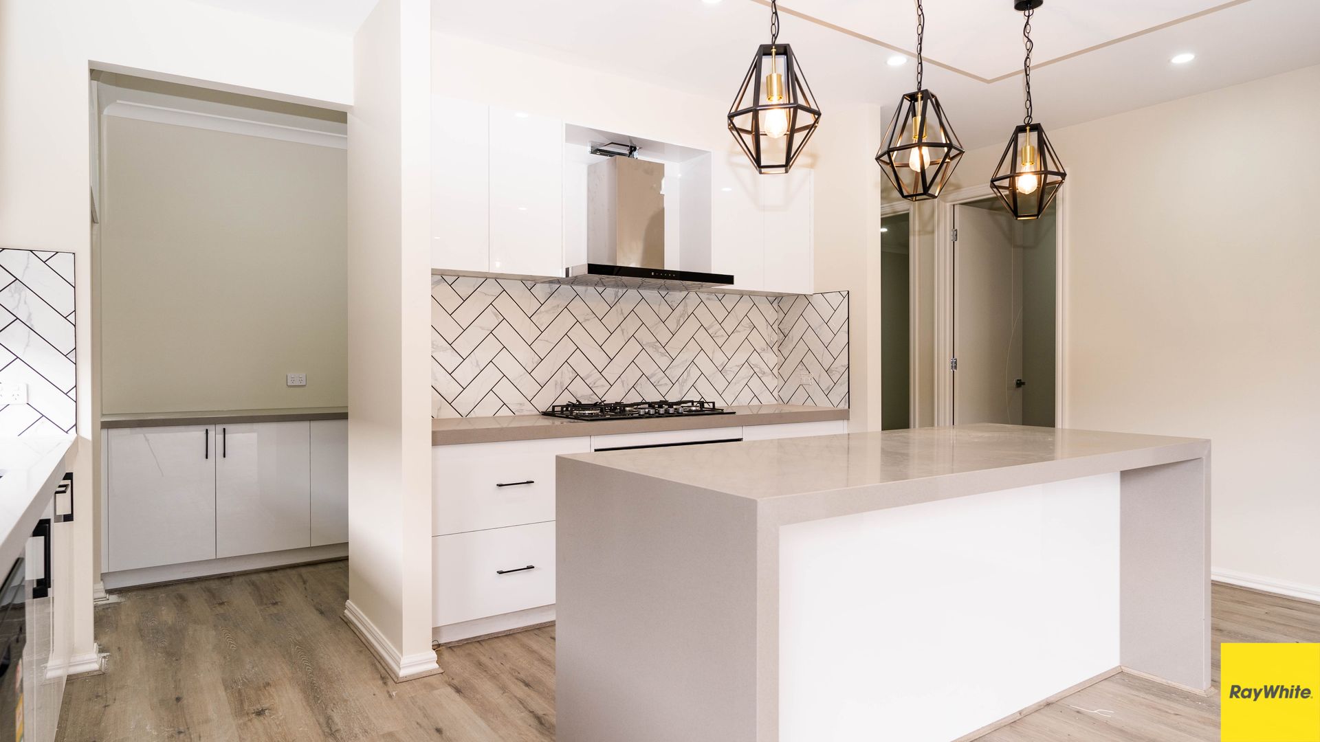 The immaculate kitchen with neighboring open-plan living & dining elegantly resides at the heart of the home. Contemporary in nature, the sizeable kitchen flaunts new 900 mm Appliances, a 60 mm stone Island bench-top waterfall on both sides, a designer tile splash-back, and a spacious butler in the pantry.