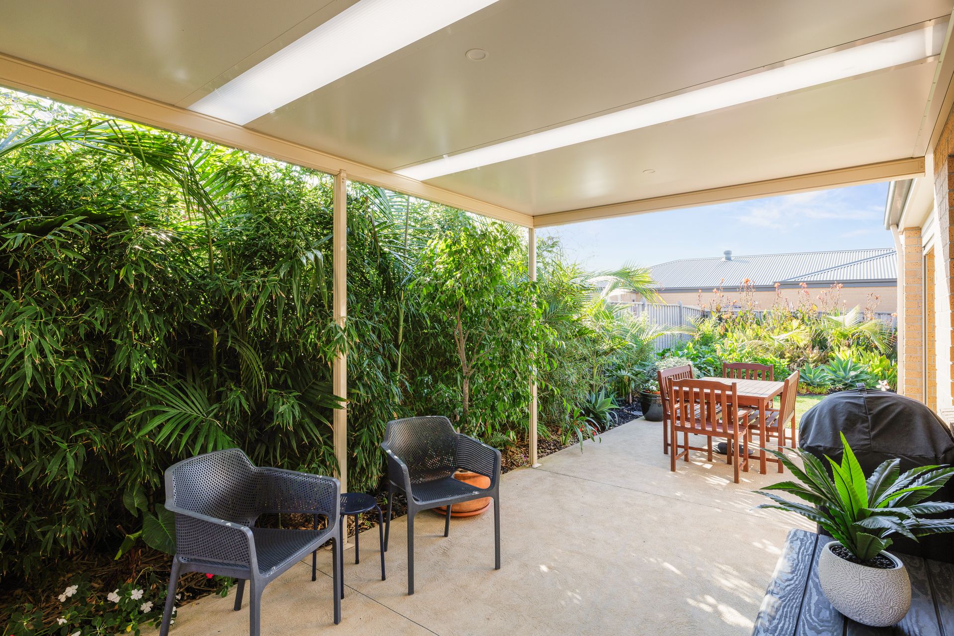Out through sliding doors is the impressive fully covered entertaining area which overlooks the lush yet low maintenance surrounds. With multiple outdoor zones, entertaining is possible all year round, regardless of weather conditions.