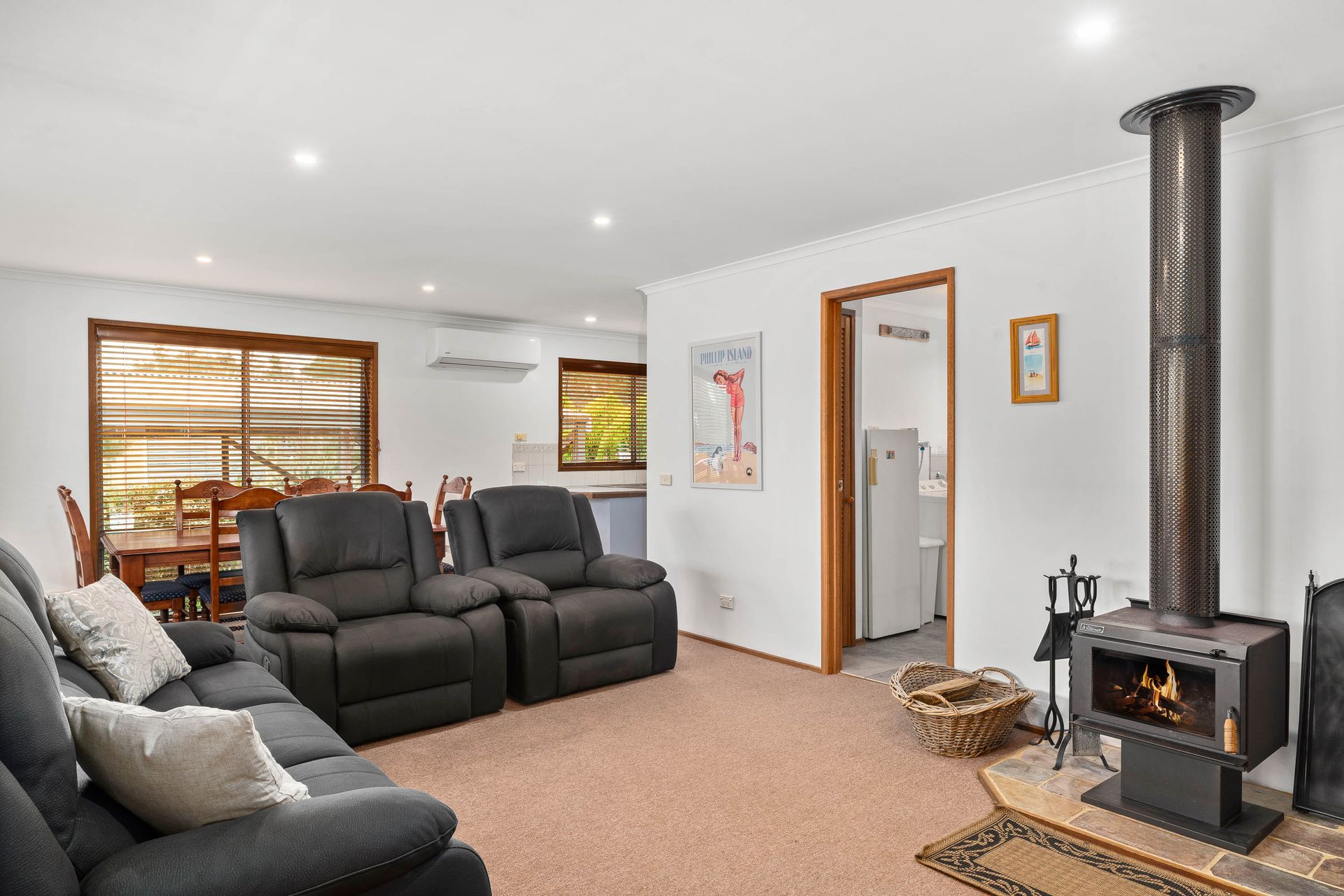 Inside, you're welcomed into an open-plan living, kitchen, and dining area designed for easy living and entertaining. The kitchen is equipped with electric cooking, while the living area offers year-round comfort with both a split system and a cosy woodfire heater.