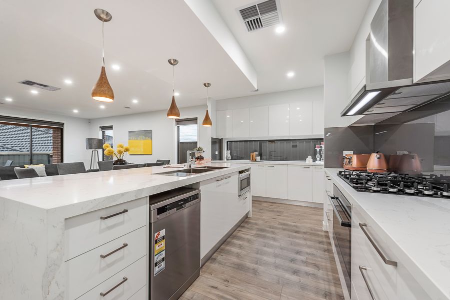 Outstanding design, architectural flair and luxury features throughout underline the appeal of this modern showpiece delivering an unsurpassed family lifestyle of versatility and class. Quality at every turn and meticulous attention to detail, the home's stunning interior boasts a grand entrance hallway with towering ceilings, 4 bedrooms (large master with WIR and luxurious ensuite), equally-stylish main bathroom and guest powder room (third WC). Dual family zones include an elegant formal lounge and vast open-plan living/dining area with bi-folds revealing a Merbau-decked al-fresco entertaining area. Add to this a gourmet kitchen with breakfast bar, finest appliances and walk-in/butler's pantry, family-sized laundry, internal access into the double garage. Other highlights include Caesarstone Calacatta benchtops and vanities, quality carpets and engineered oak floors, ducted heating and evaporative cooling, alarm and video intercom, square-set cornices and so much more. An aspirational family lifestyle in the popular Mt Aitken precinct, schools, shopping centres, parks and trails, public transport and major arterials are all within easy reach. Ultimate modern family living!