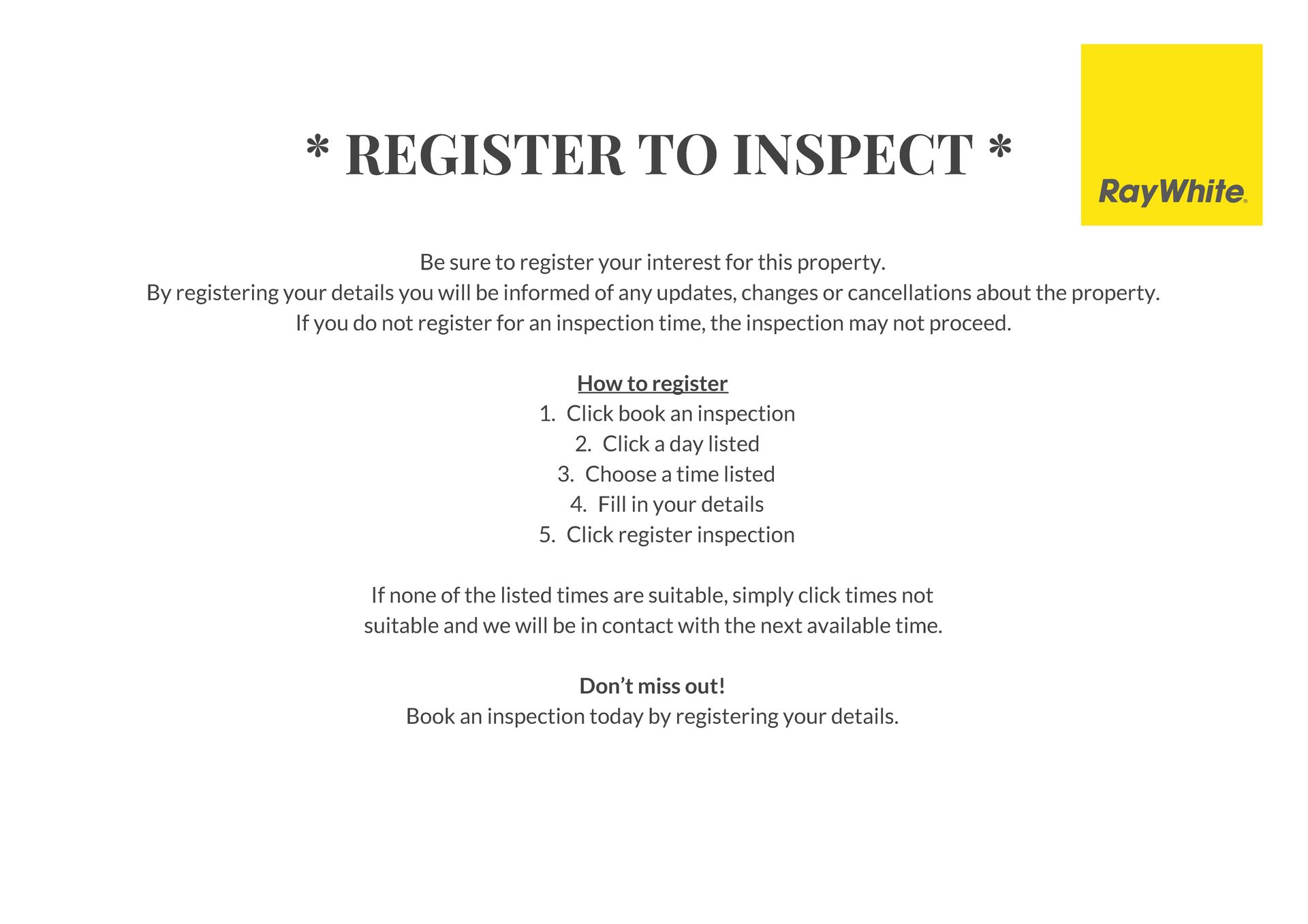 BOOK OR REGISTER FOR AN INSPECTION NOW OR REGISTER TO BE NOTIFIED OF ANY UPDATES.
