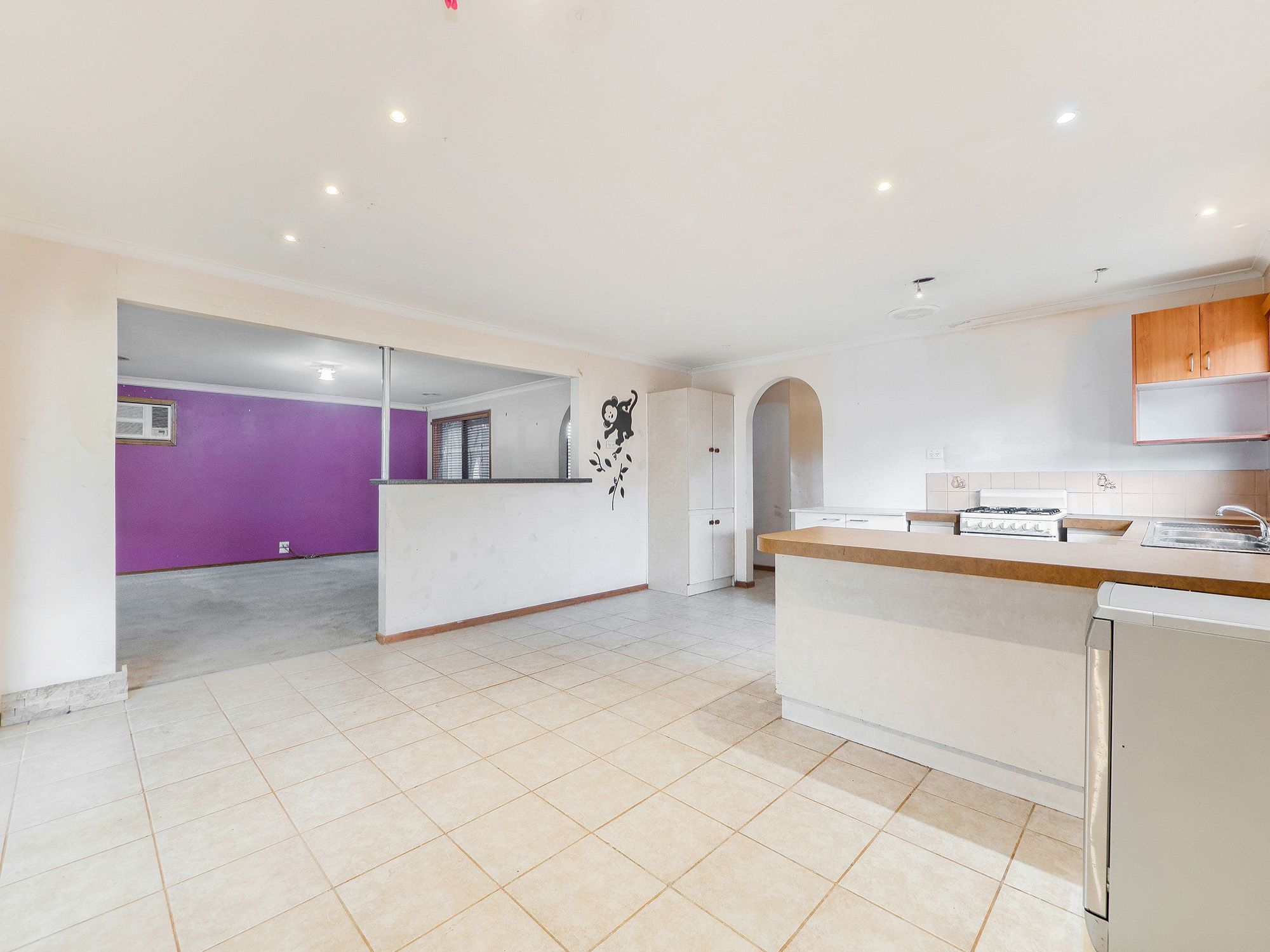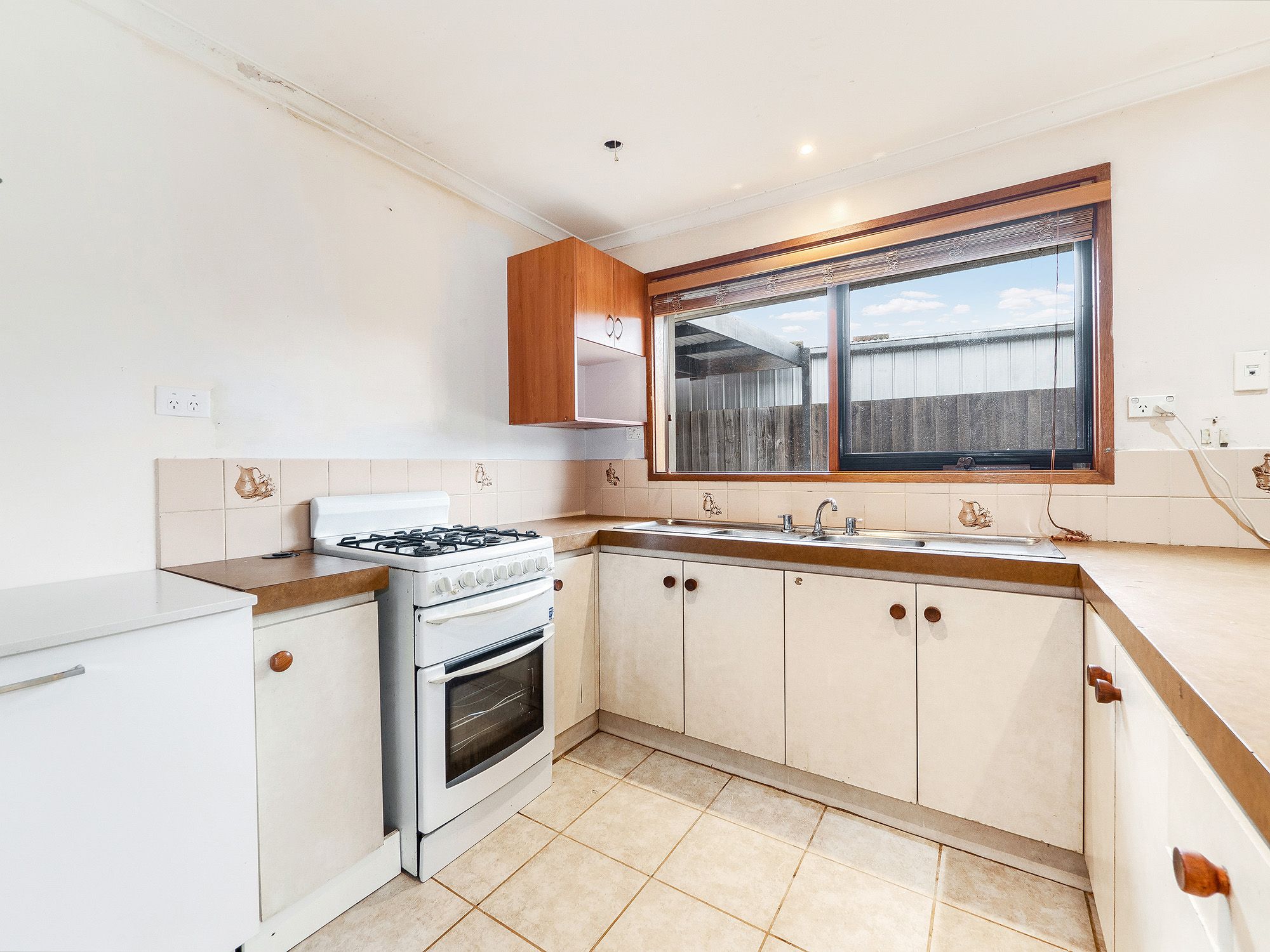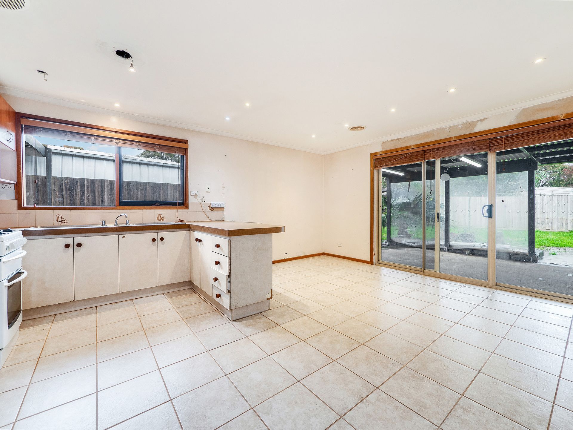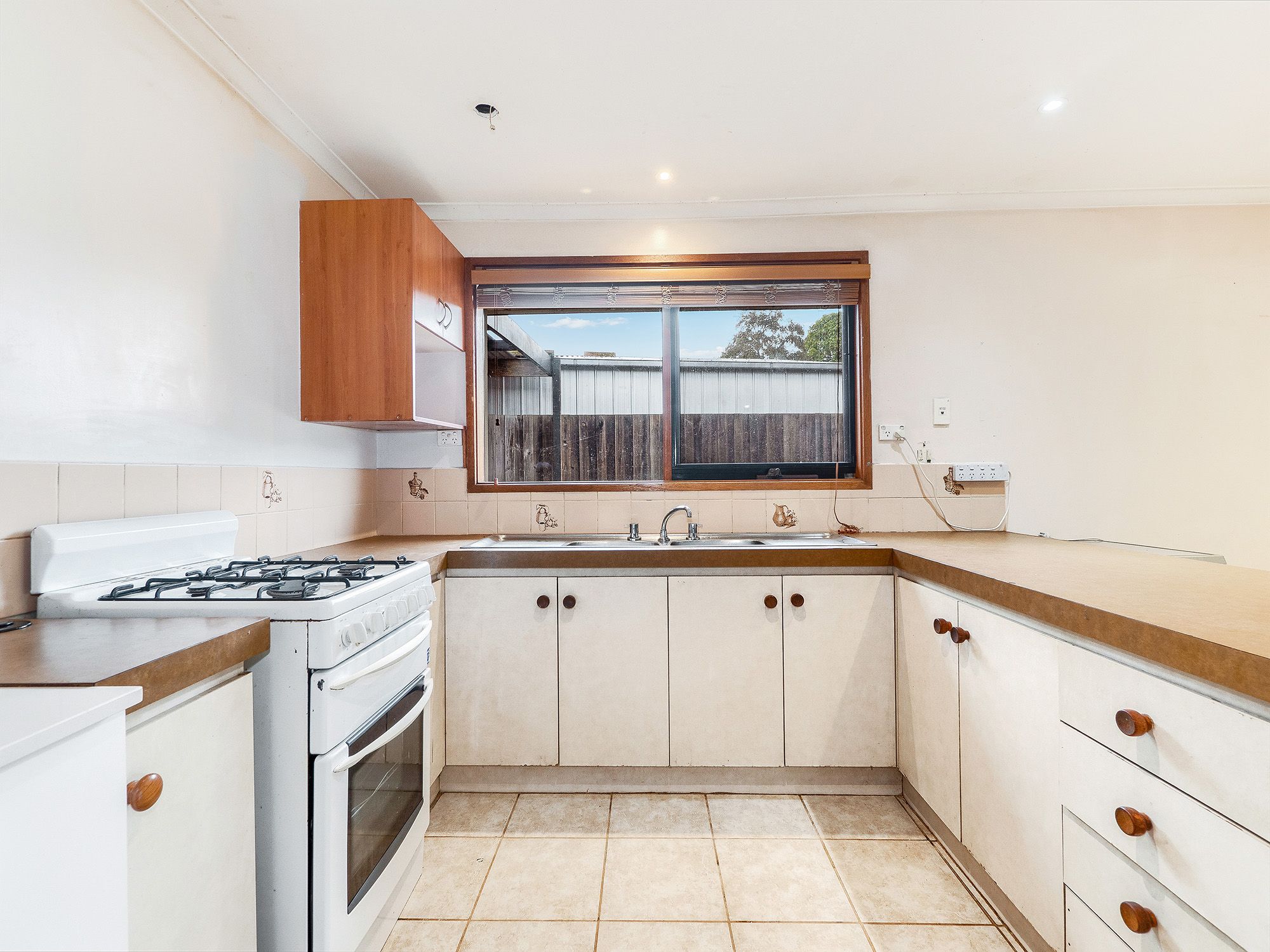 The interconnecting dining zone with fuss-free tiled flooring is sided by an original kitchen with breakfast bar, gas stove and great dimensions for a contemporary update, while sliding glass doors allow instant access to a covered patio with bistro blinds for barbecuing with friends.