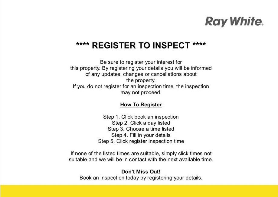 **PLEASE NOTE, inspections are STRICTLY 10 minutes only, if you do not arrive on time, the Property Manager reserves the right to deny access. Please ensure you arrive on time to avoid disappointment**