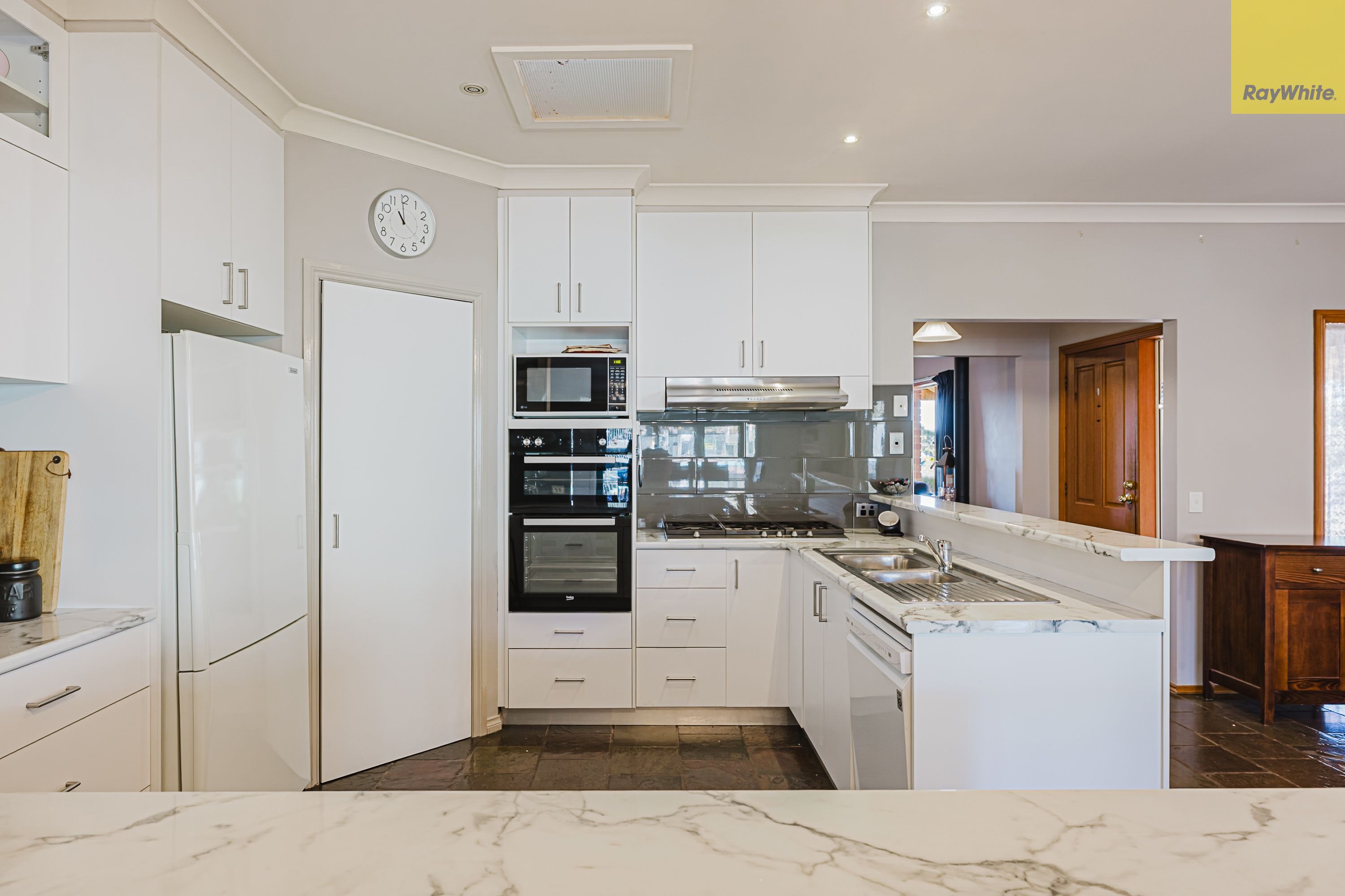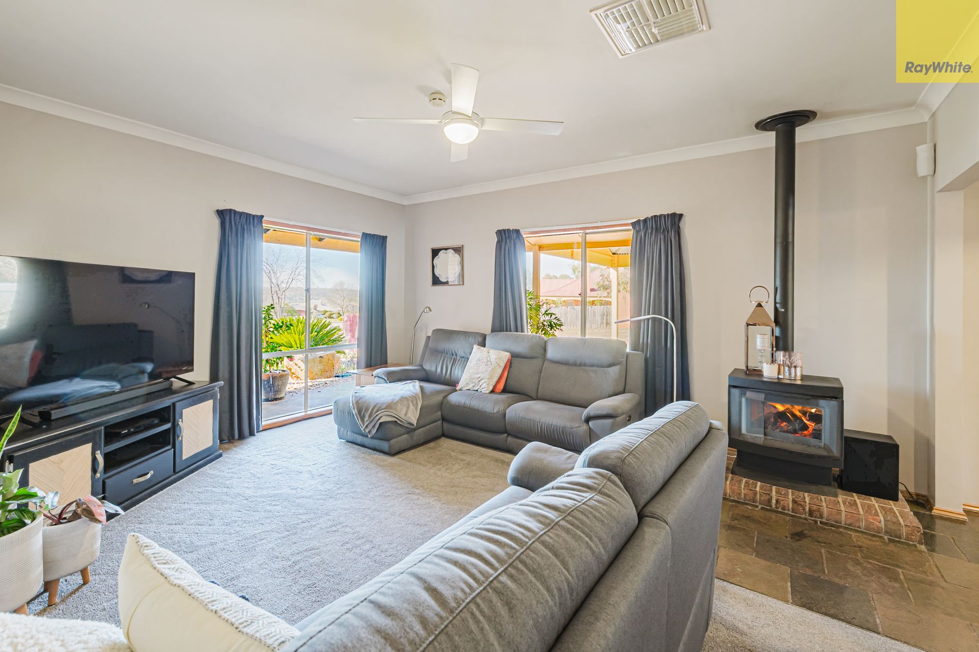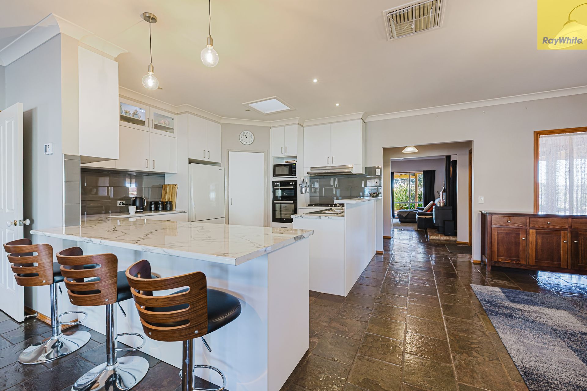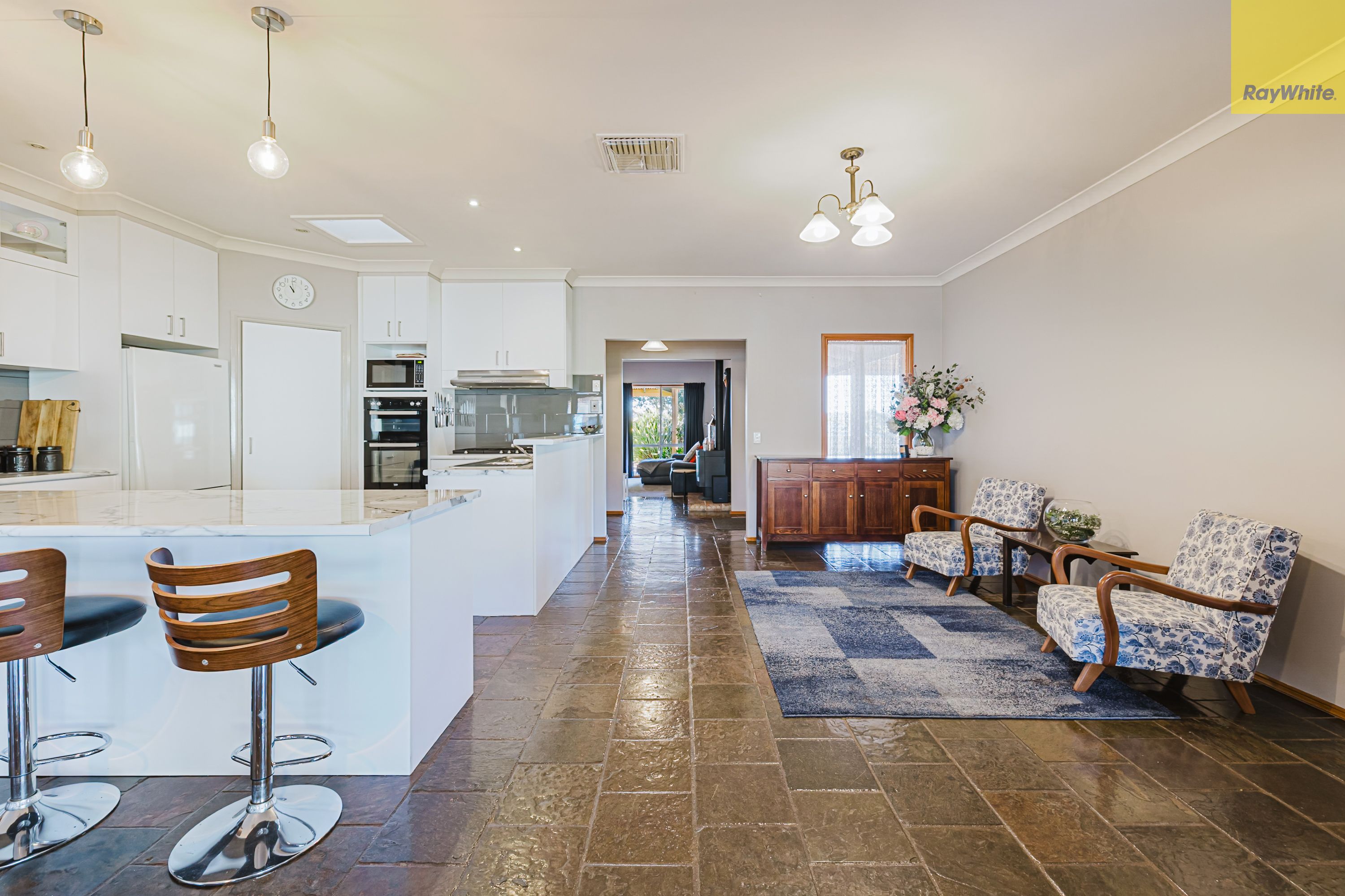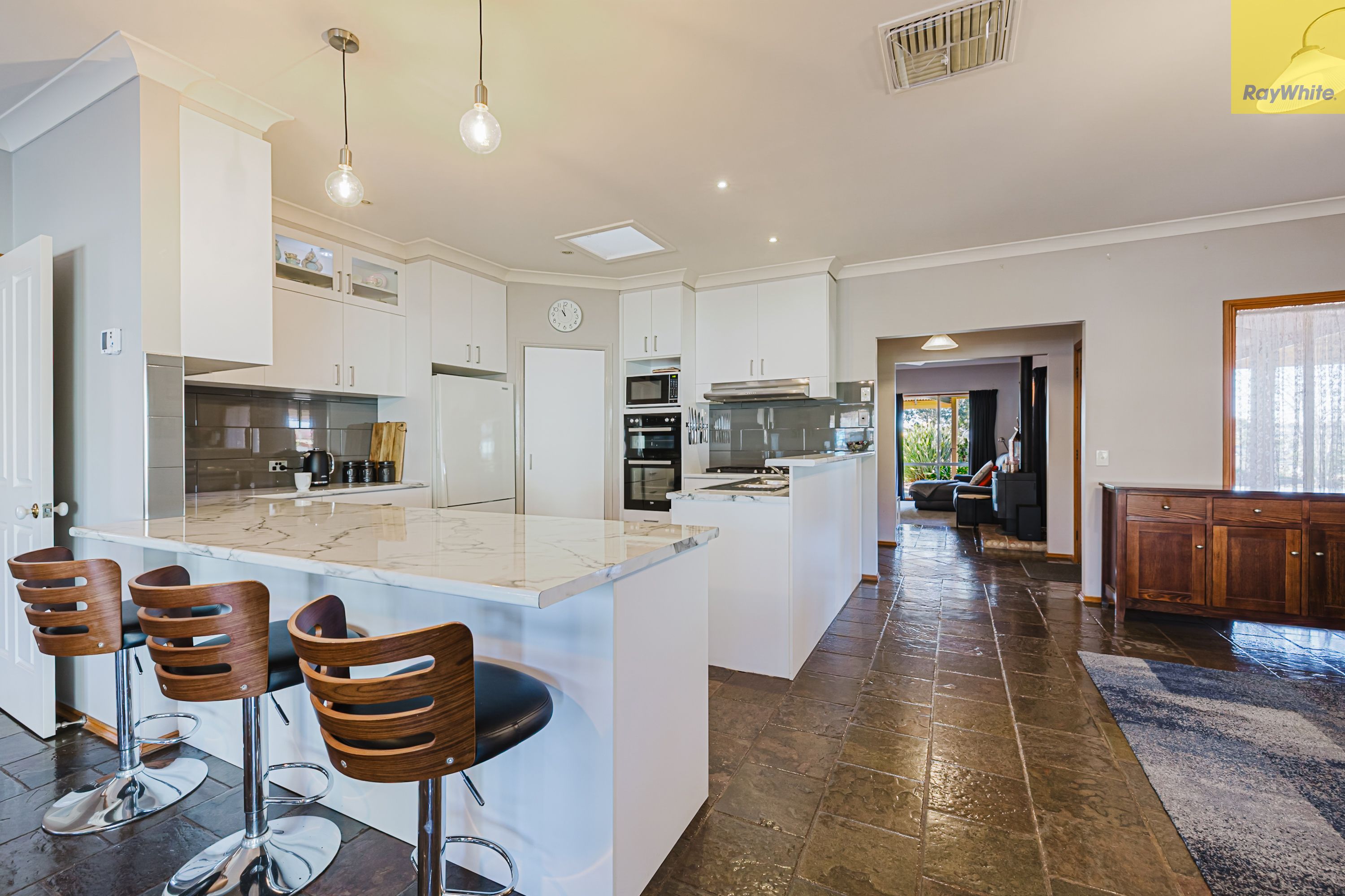 Step inside to a generous front lounge, where large windows invite in natural light, creating a warm and welcoming ambience. This space is enhanced by a built-in bar and a cosy wood fire heater, perfect for winter evenings or entertaining guests in comfort. Flowing through the home, you'll find a second open-plan living area adjacent to the kitchen, also bathed in natural light.