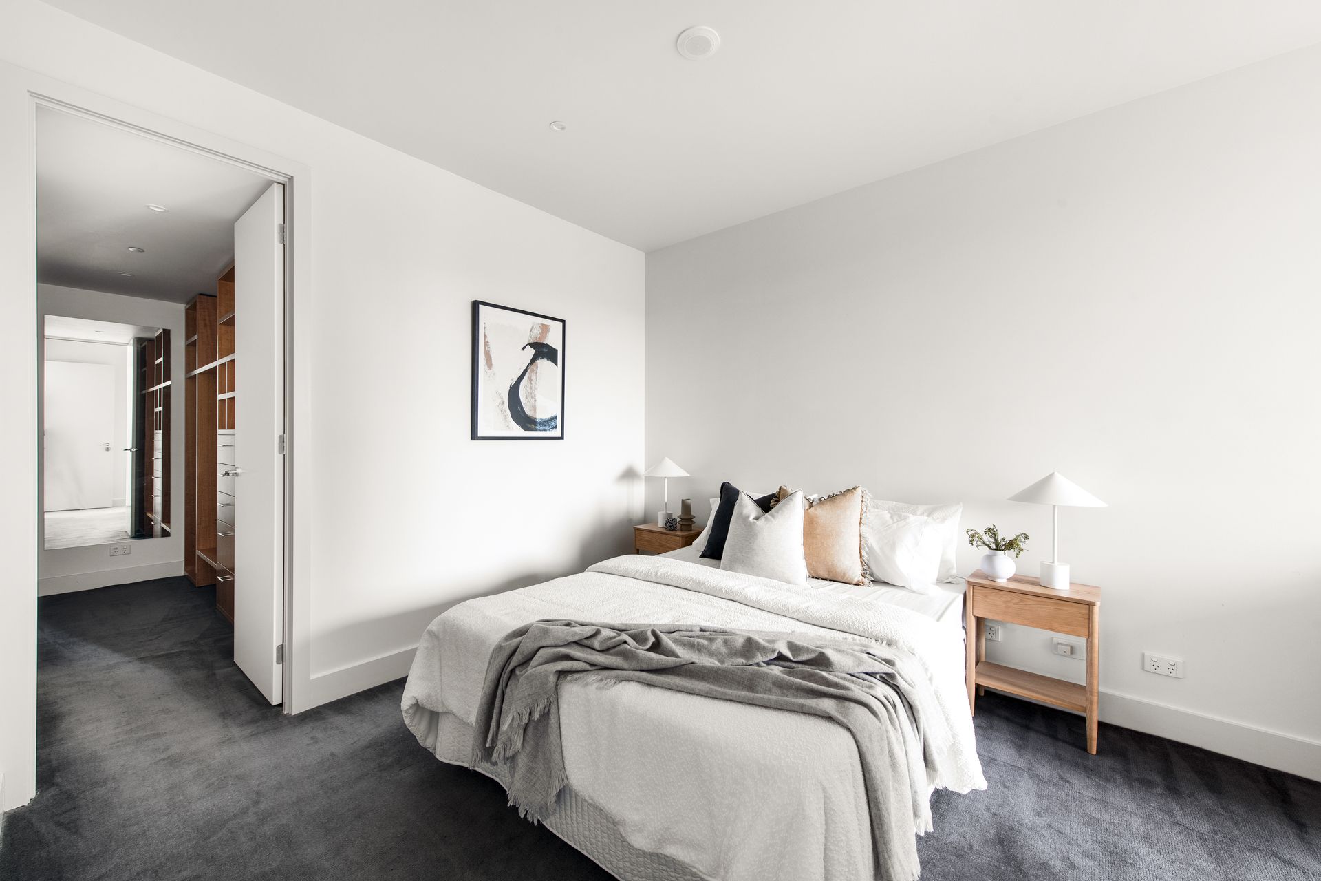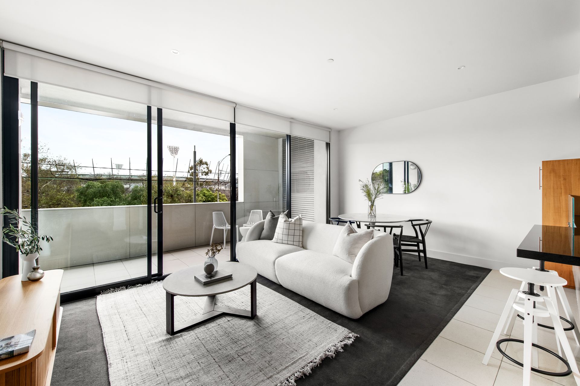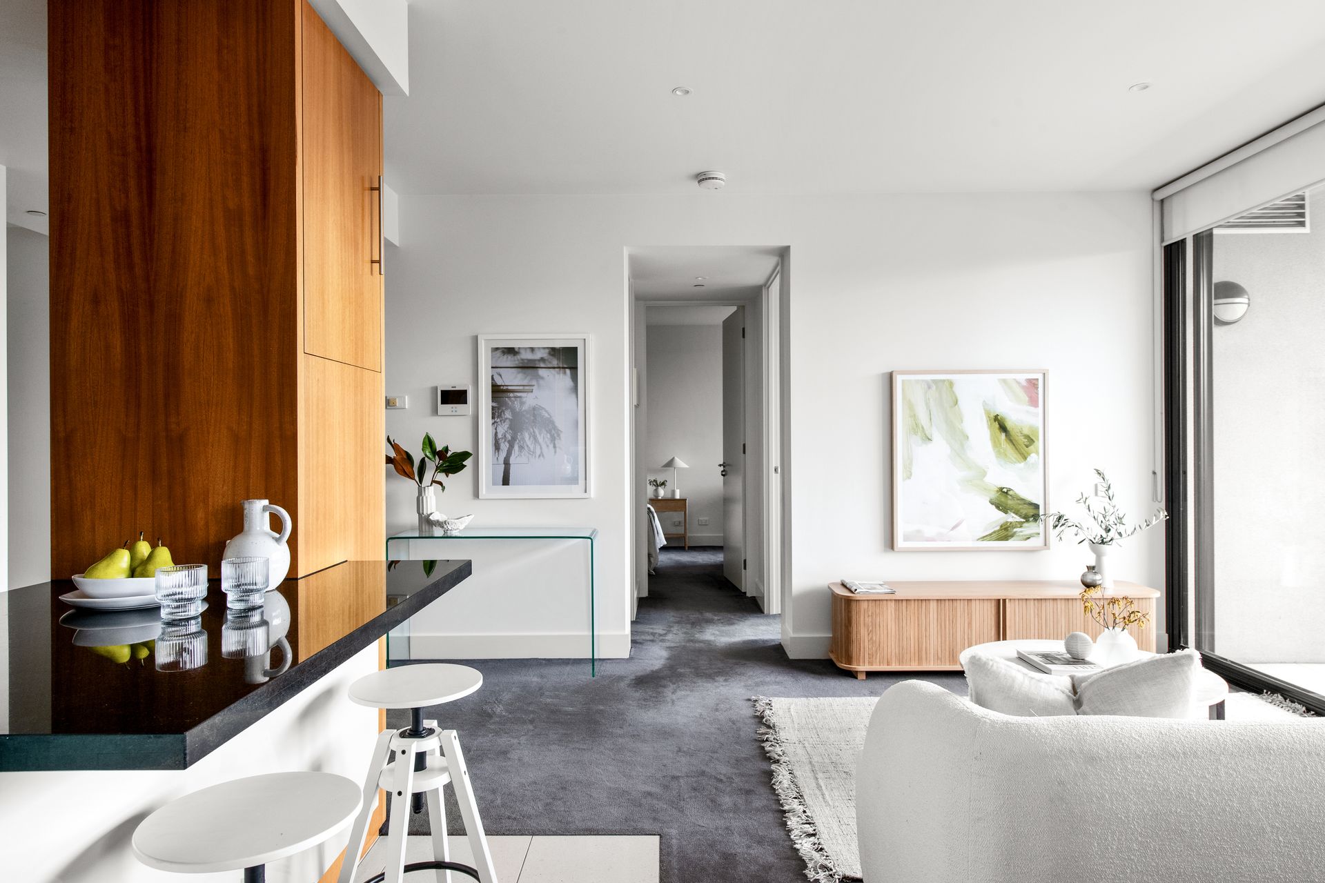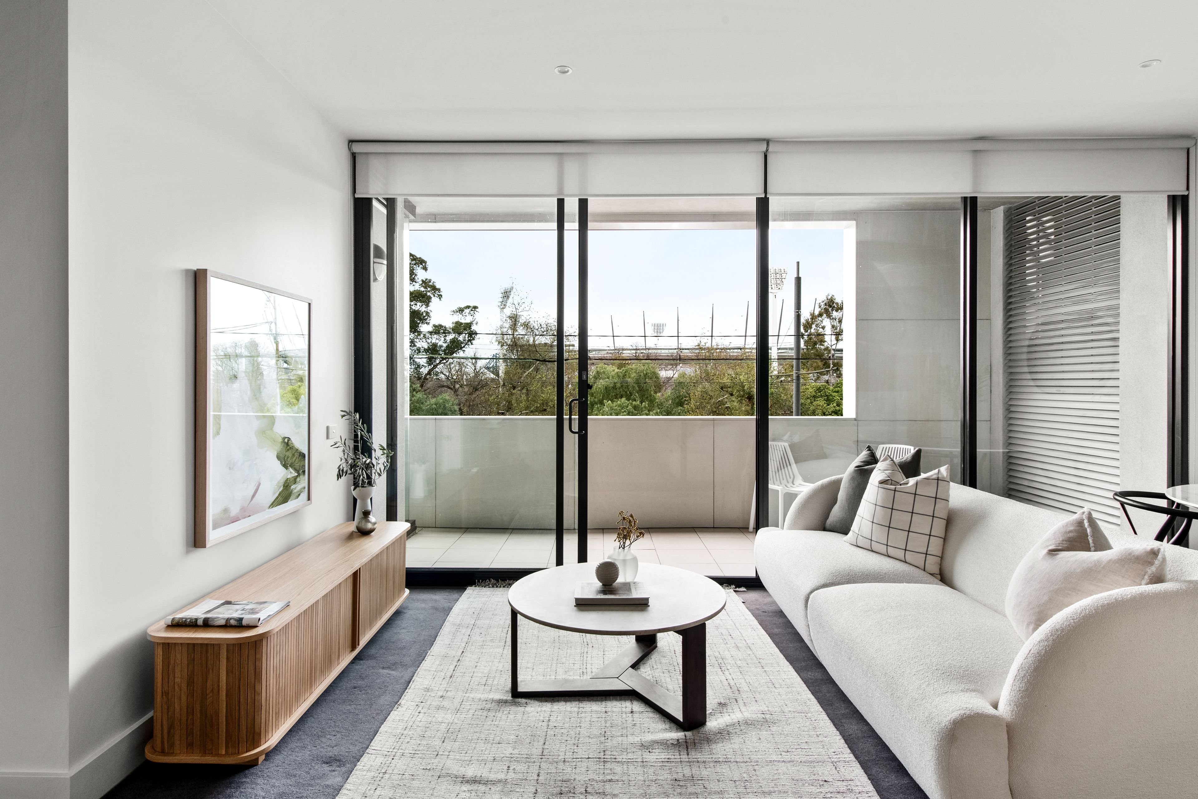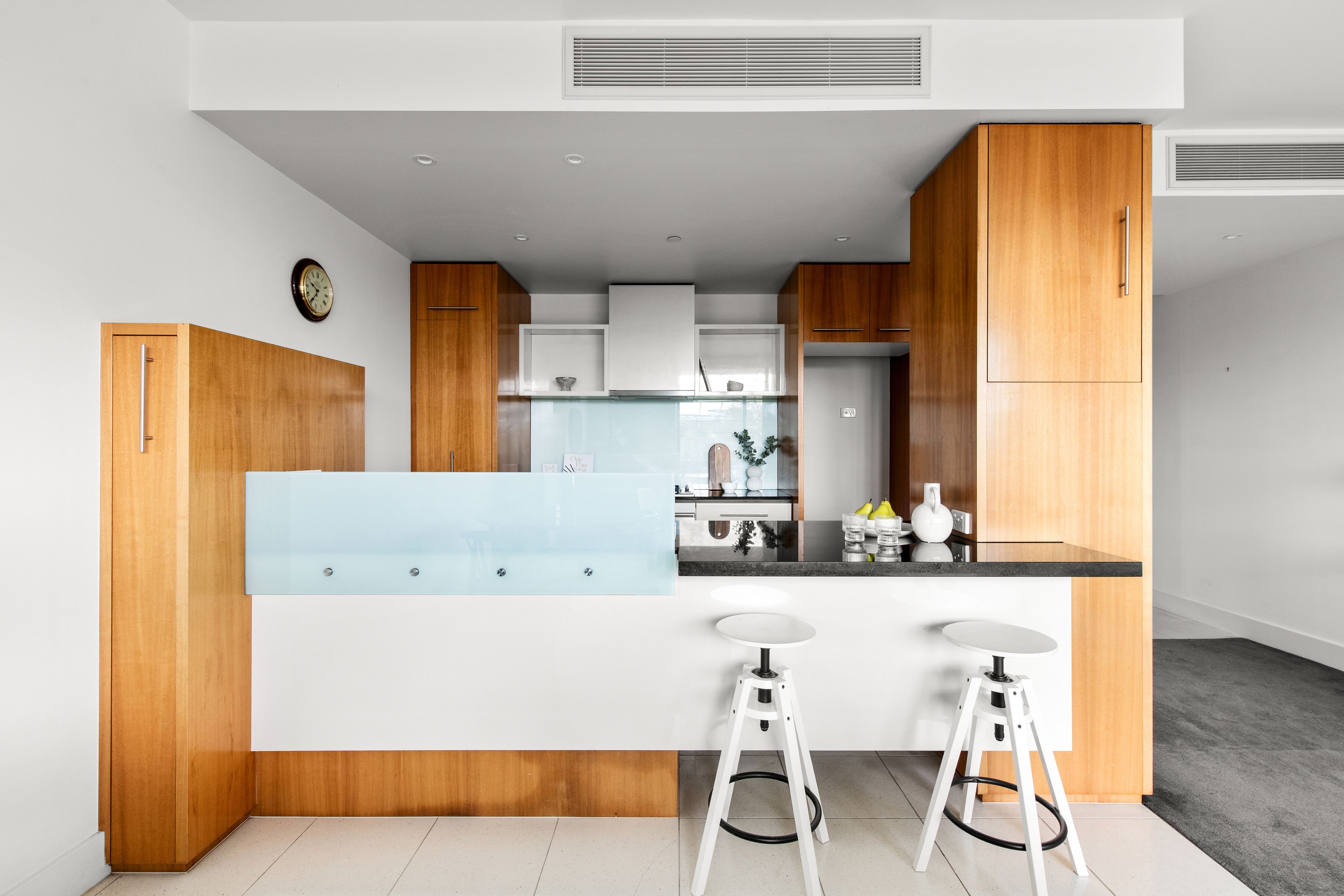 Quality and generous proportions are evident throughout the residence. The main bedroom boasts a stunning walk-in wardrobe with a generous ensuite, while the second bedroom features a built-in mirrored wardrobe and wonderful views of the MCG. Both bathrooms are of the highest quality, with marble finishes, walk-in showers and the ensuite fitted with a sumptuous bath.