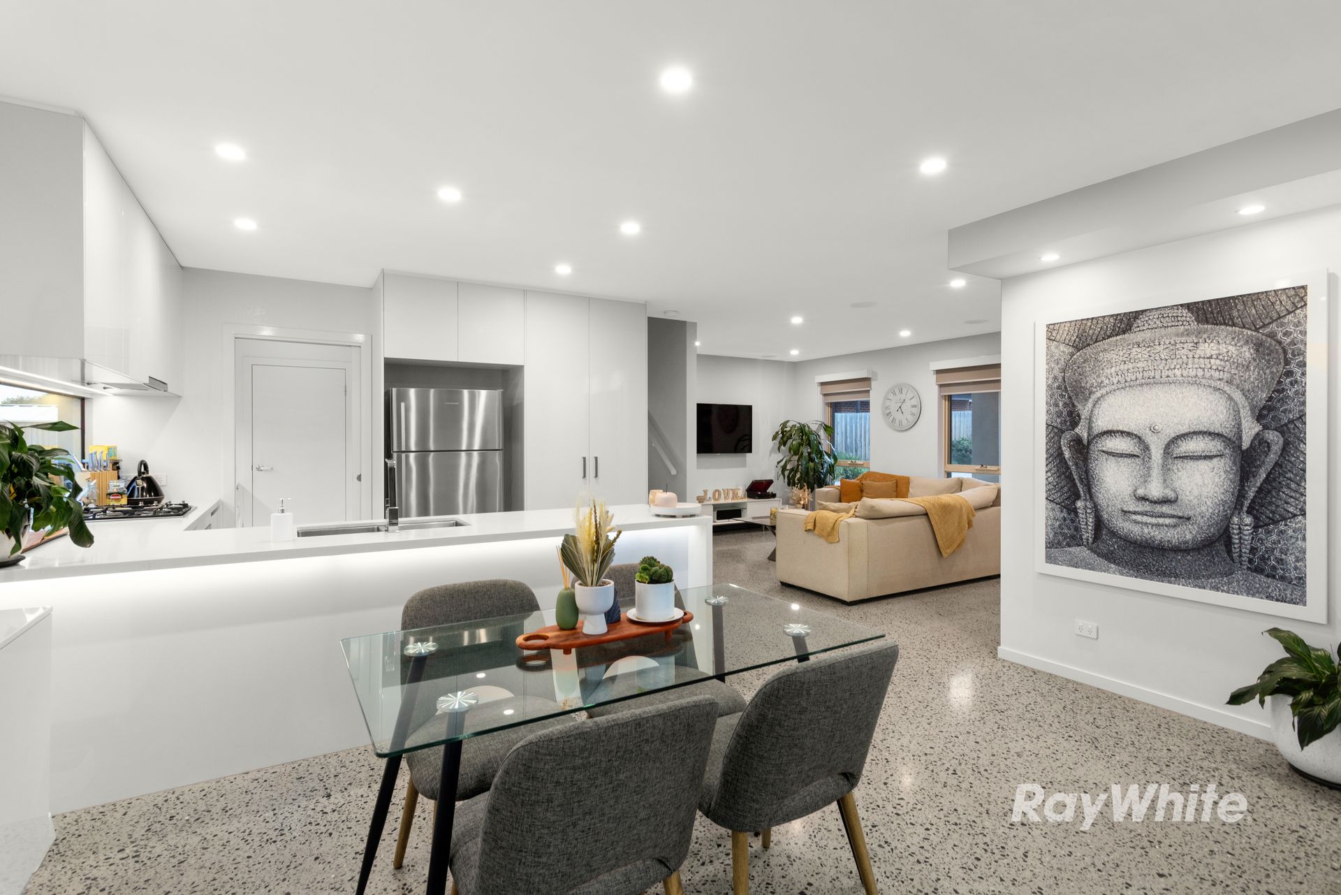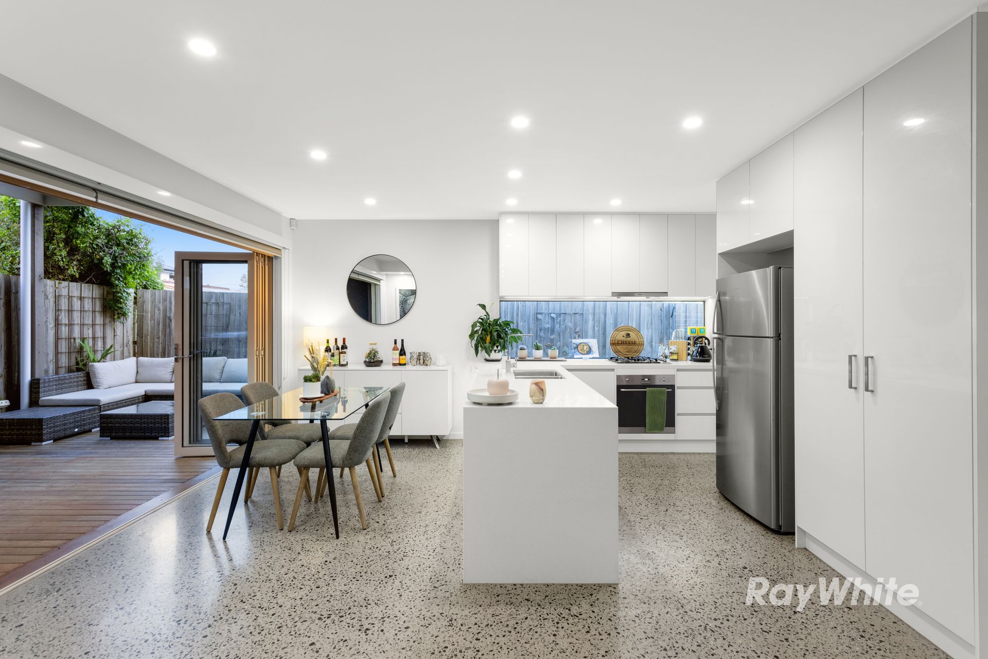 The home also features a spacious kitchen, with stainless steel Smeg appliances, stone benchtops and ample storage space. The kitchen overlooks the dining area, making it the perfect spot for family meals or hosting dinner parties.