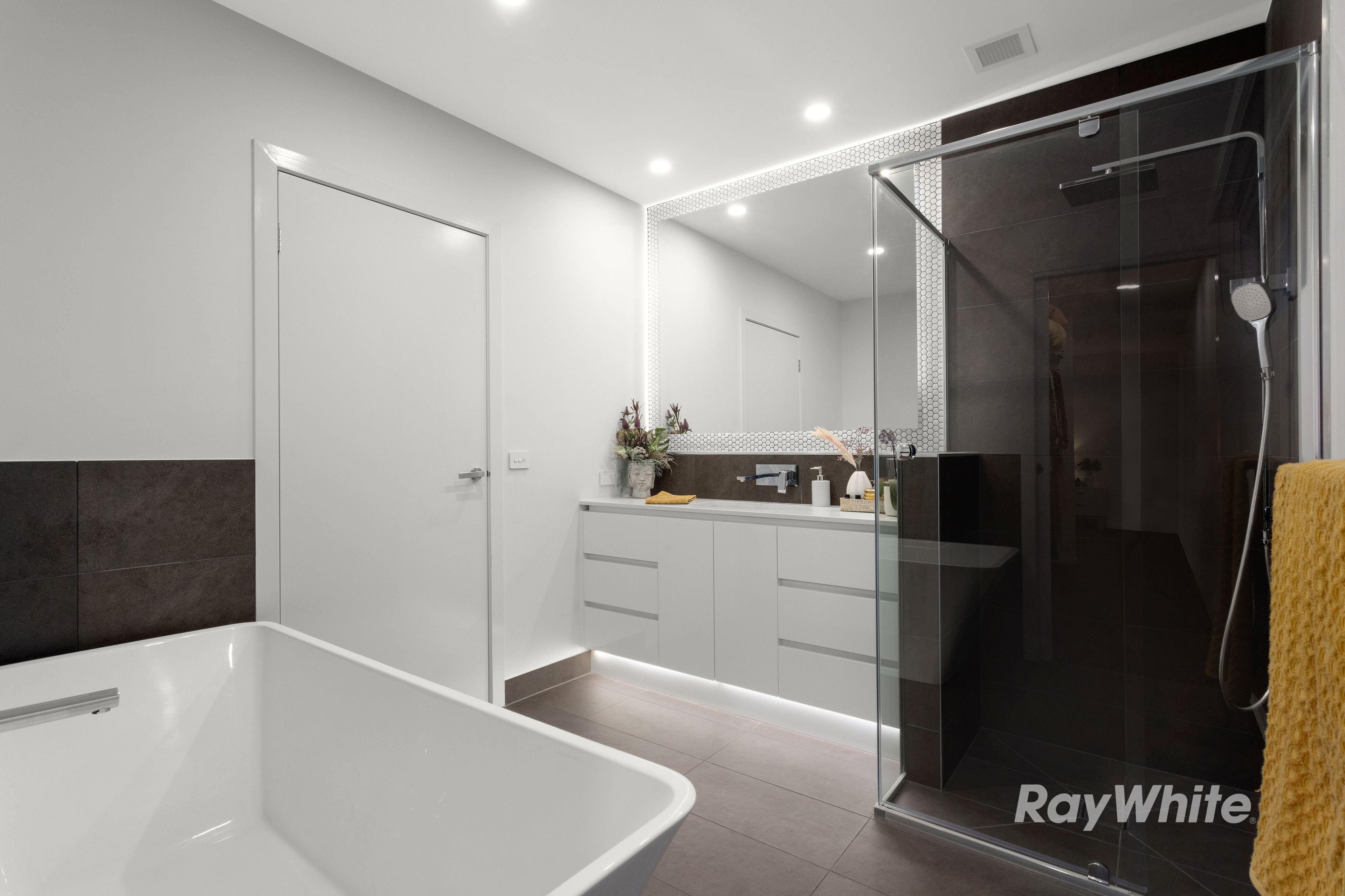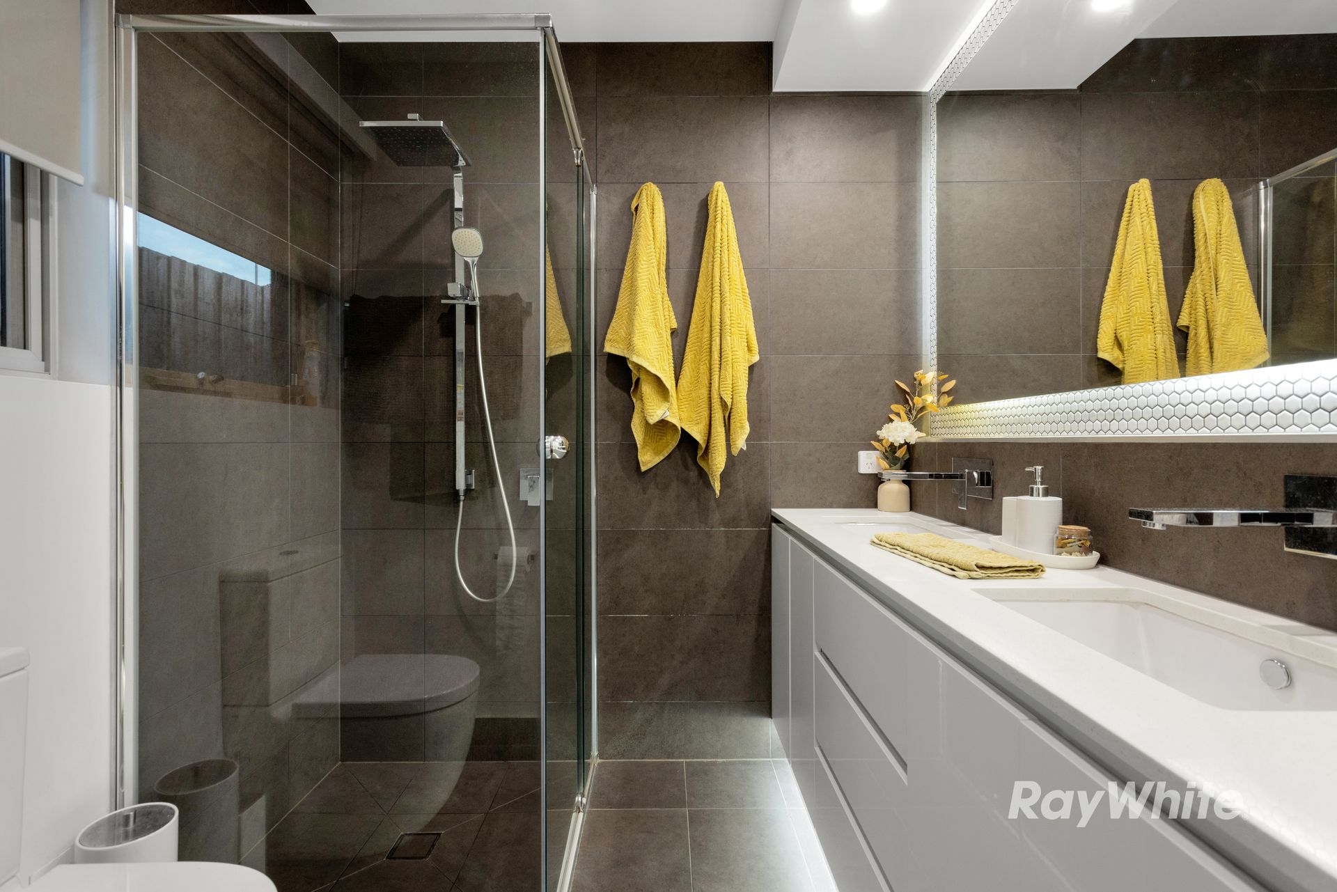 The master bedroom suite features an ensuite bathroom, dual basins and a large walk in robe.