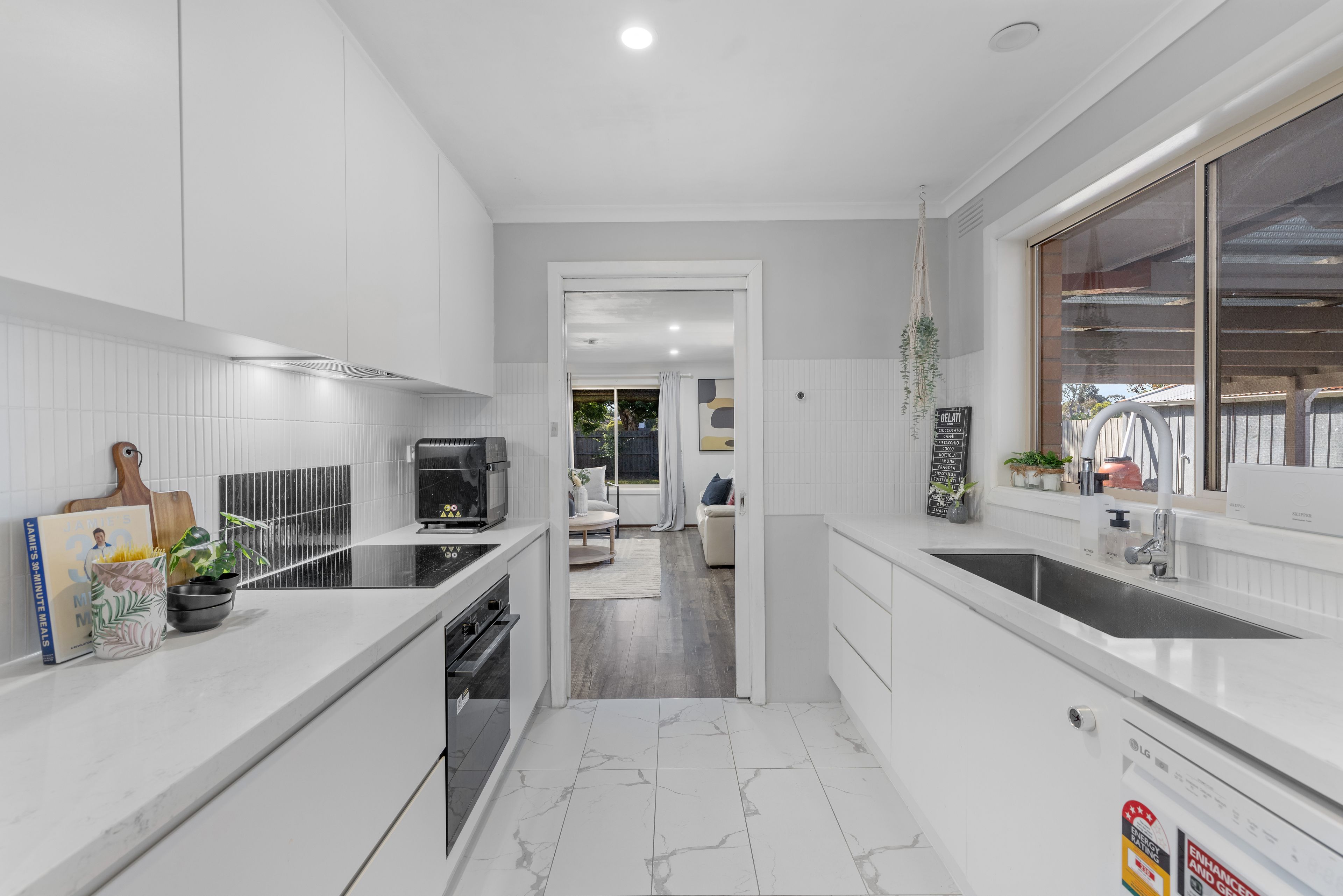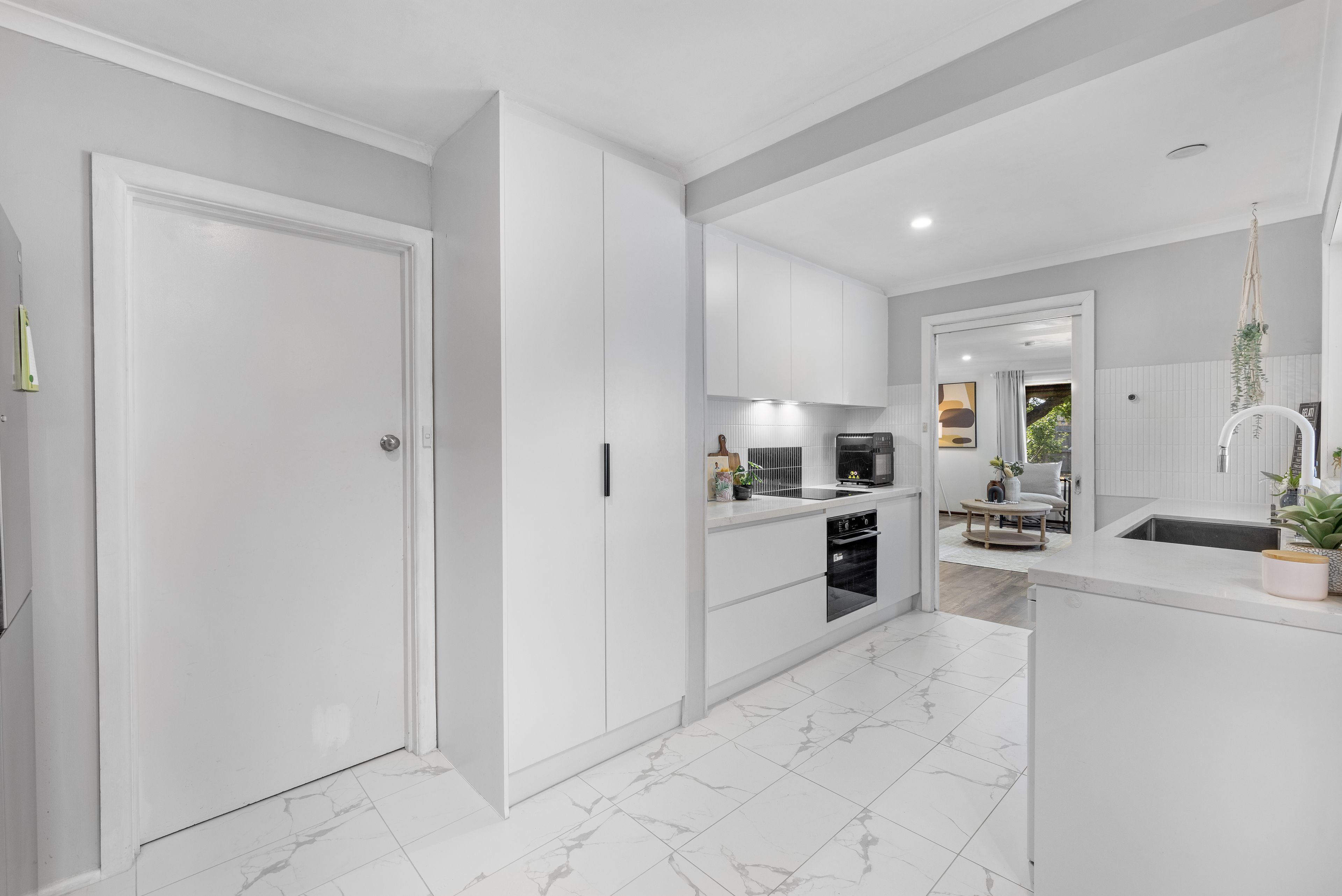 At the heart of the home lies the recently renovated kitchen, showcasing stone benchtops, an induction cooktop, an electric oven, an oversized sink, and a stylish finger-tile splashback. Sleek white cabinetry, paired with a practical dishwasher and a dedicated coffee bar within the dining area, makes this kitchen a dream for entertainers and busy households alike.