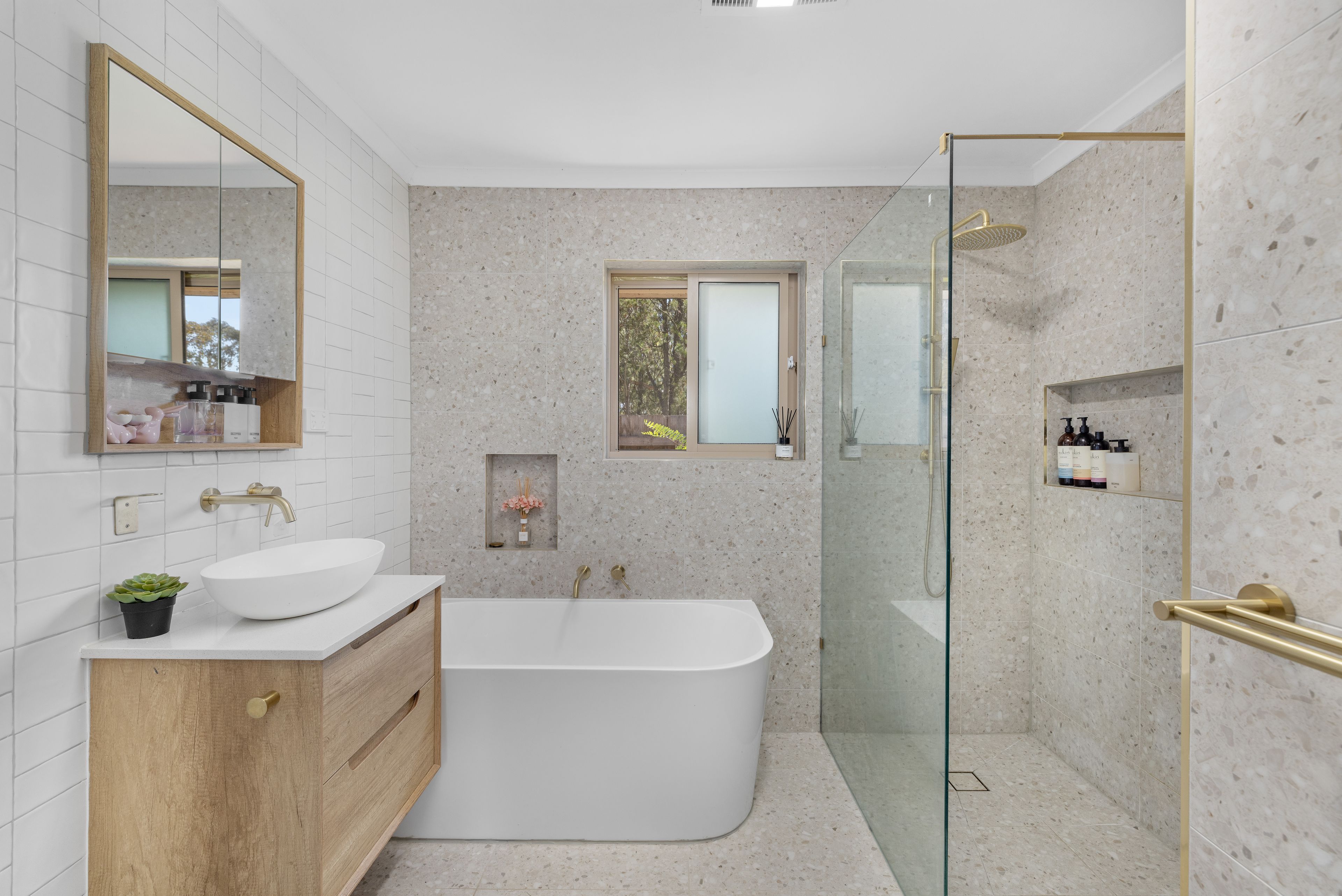 • Main bathroom features beautiful terrazzo floor tiles on three walls and floor and a subway tile feature wall also has a single floating vanity with stone benchtop and brass • fixtures and free standing bath