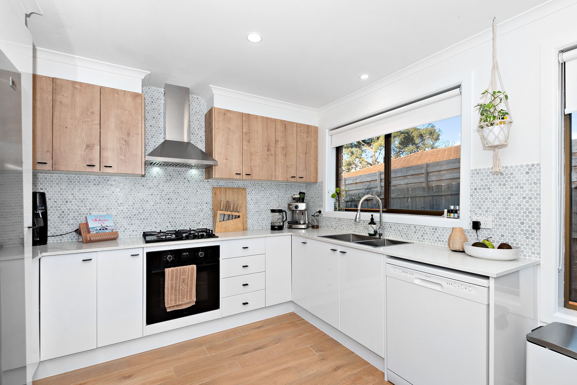 Here you will find a contemporary splashback and high-end appliances including a gas cooktop, under-bench oven and dishwasher.