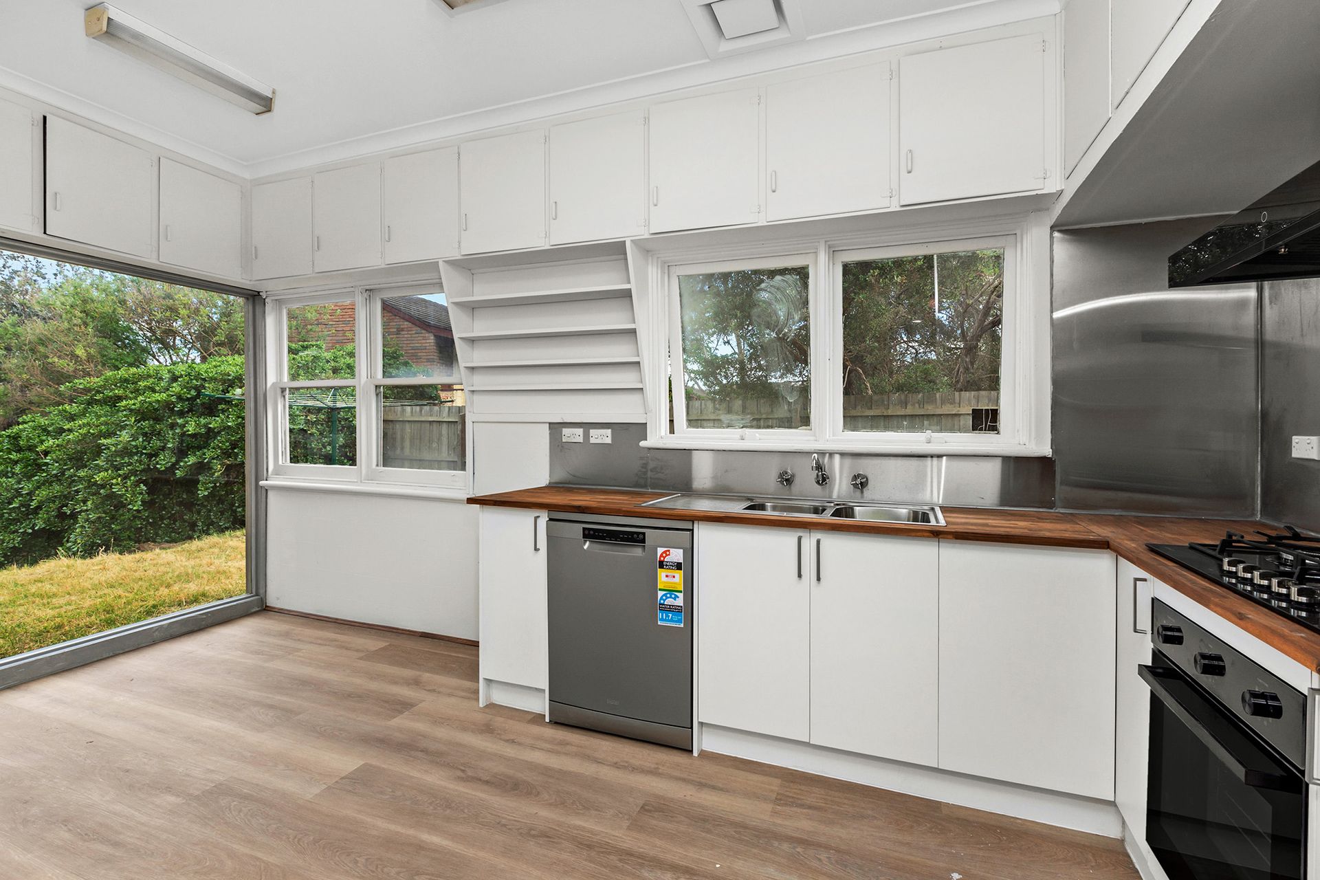 The updated kitchen includes new appliances, ample overhead cupboard space, timber benchtops, and an adjoining meals area filled with natural light and a lovely view overlooking the yard bordering Kananook Creek.