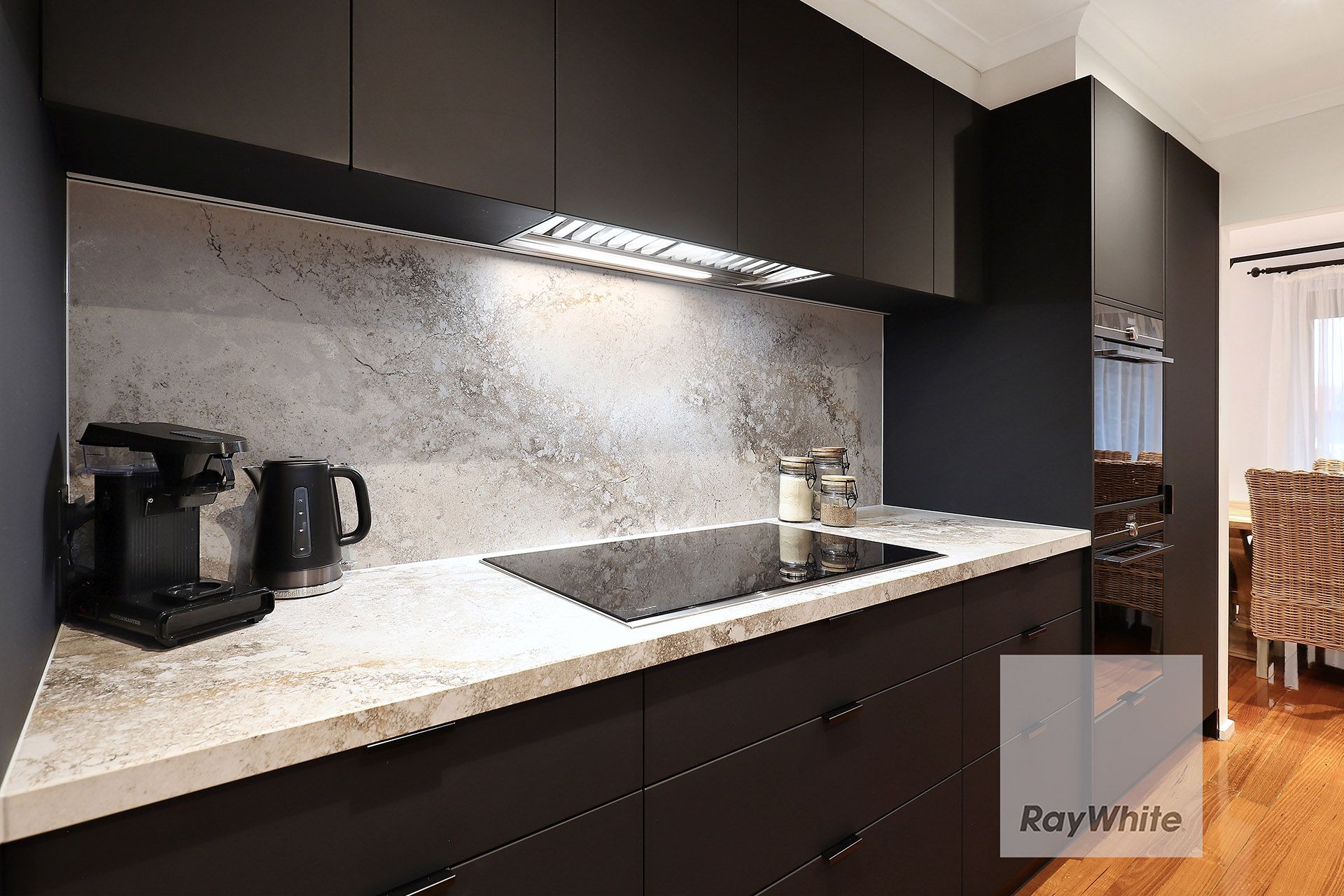 Featuring large L-shaped lounge and dining, exceptional kitchen boasting premium European appliances (double wall oven, induction cooktop, integrated dishwasher) with stone counters, ample storage cabinetry and adjacent study nook.