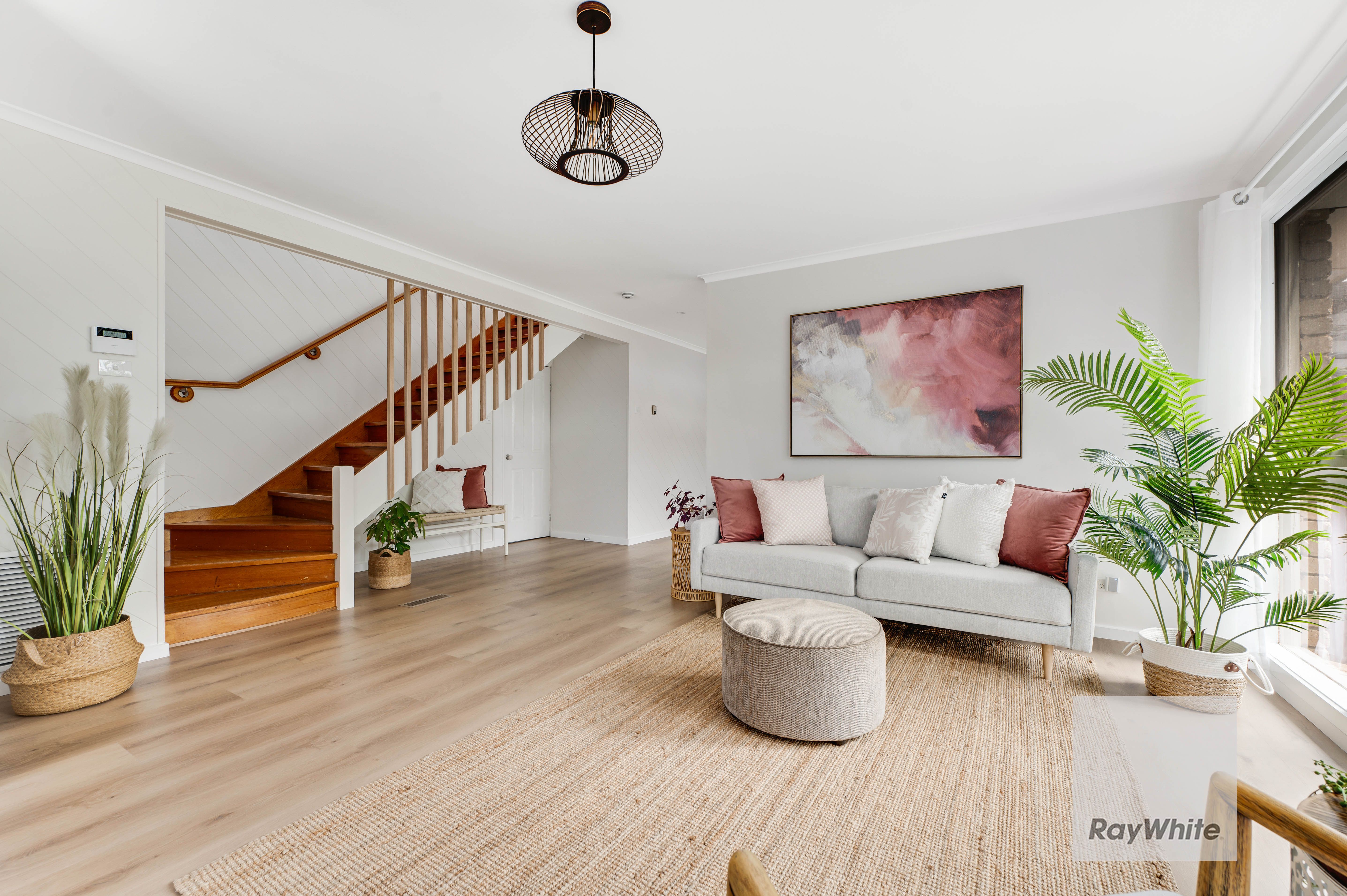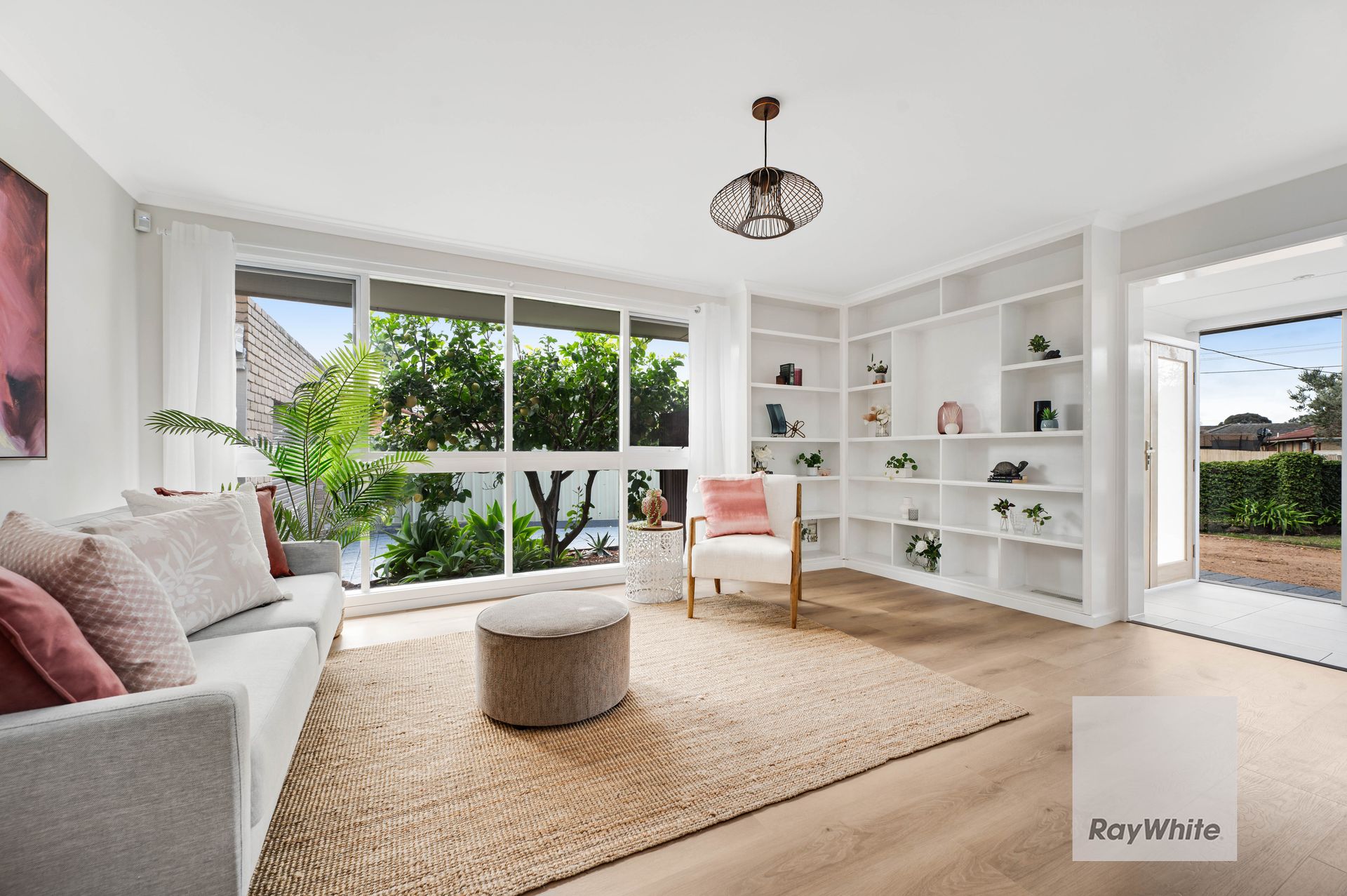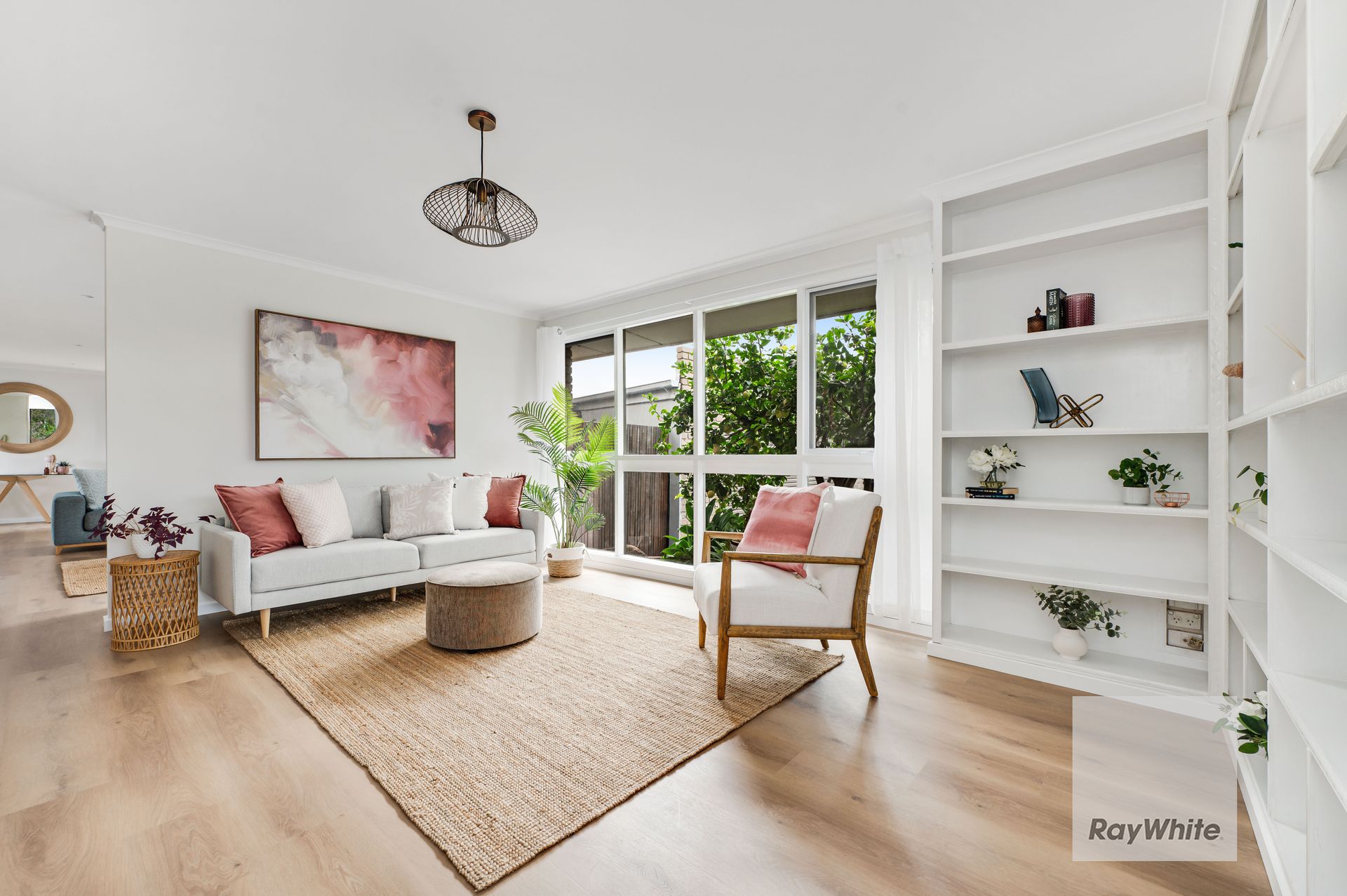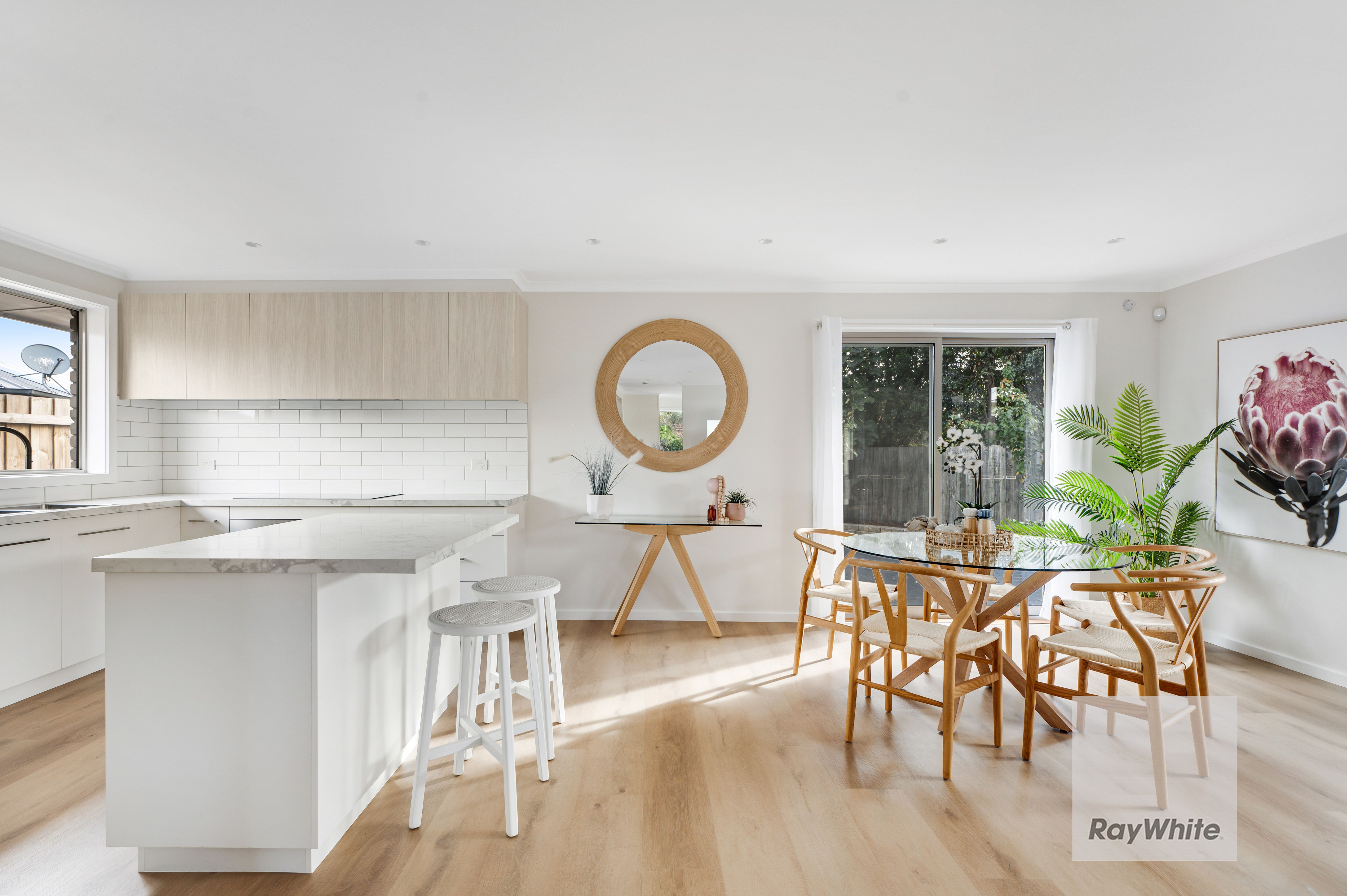 A sunny entry vestibule prefaces the flowing floor plan, while pale Scandi inspired interior hues, wide board flooring and timber accents define a property filled with considered design features.
