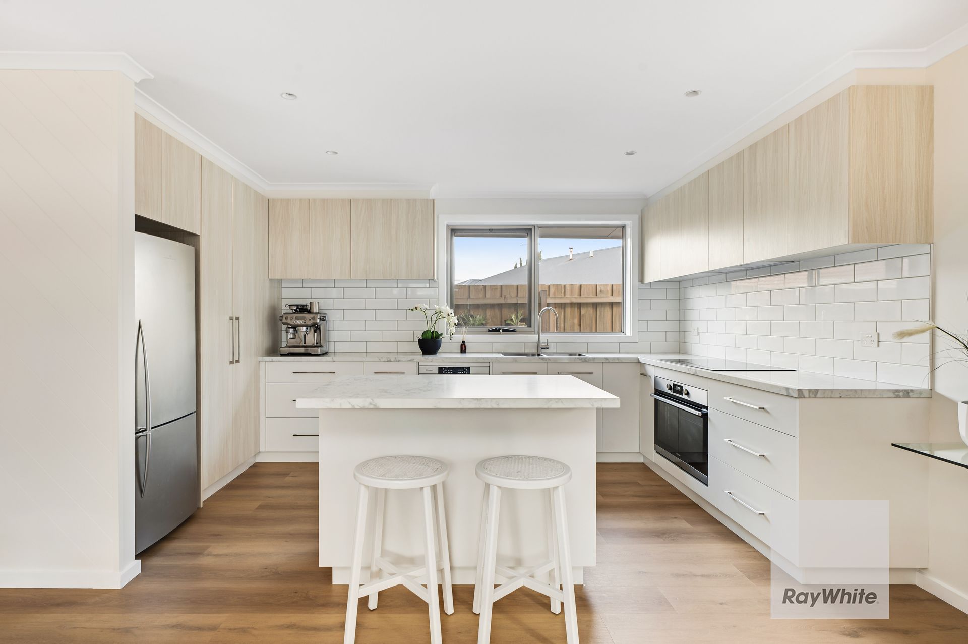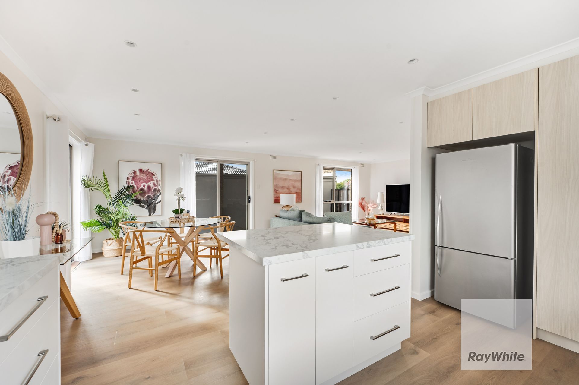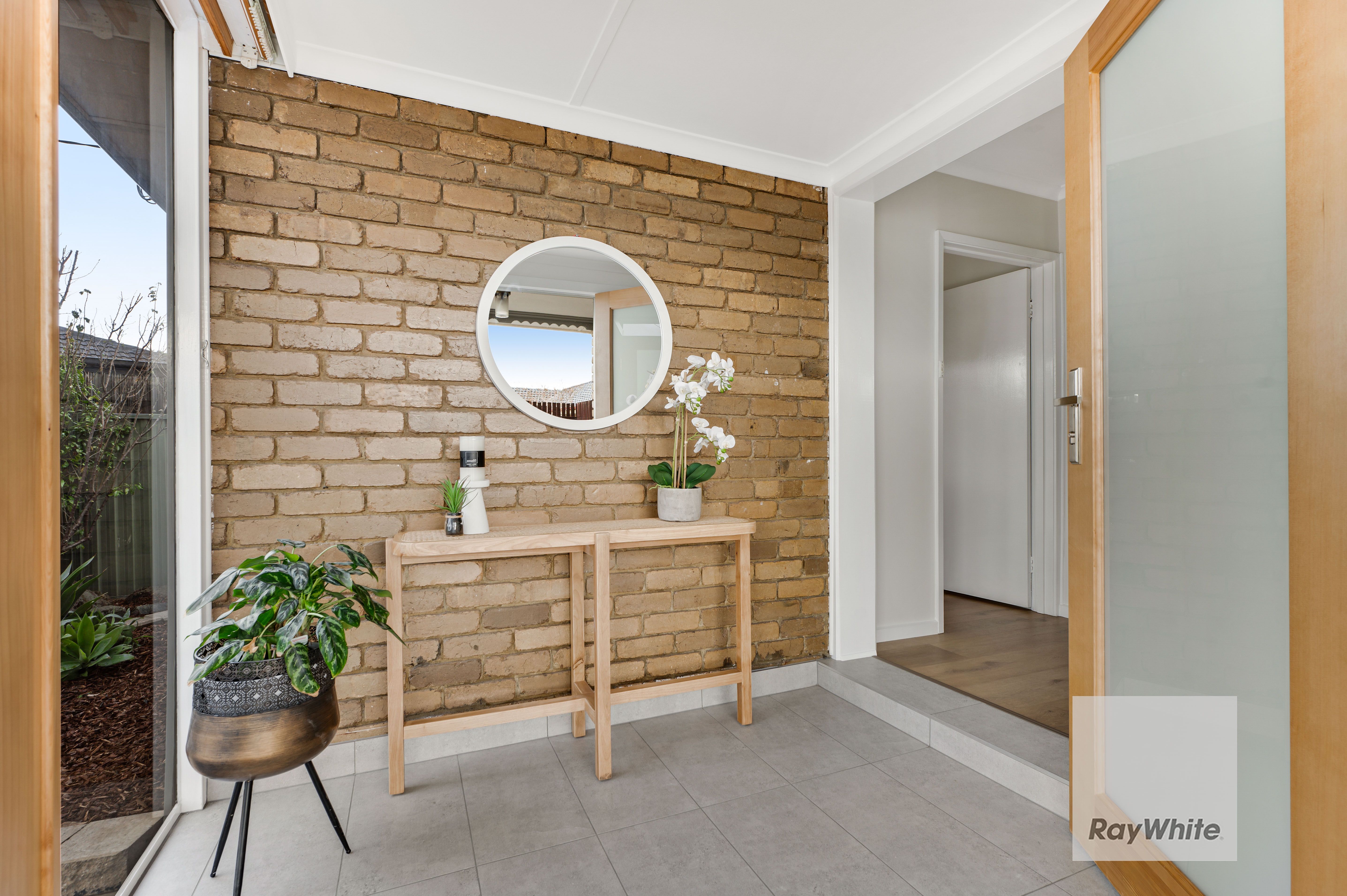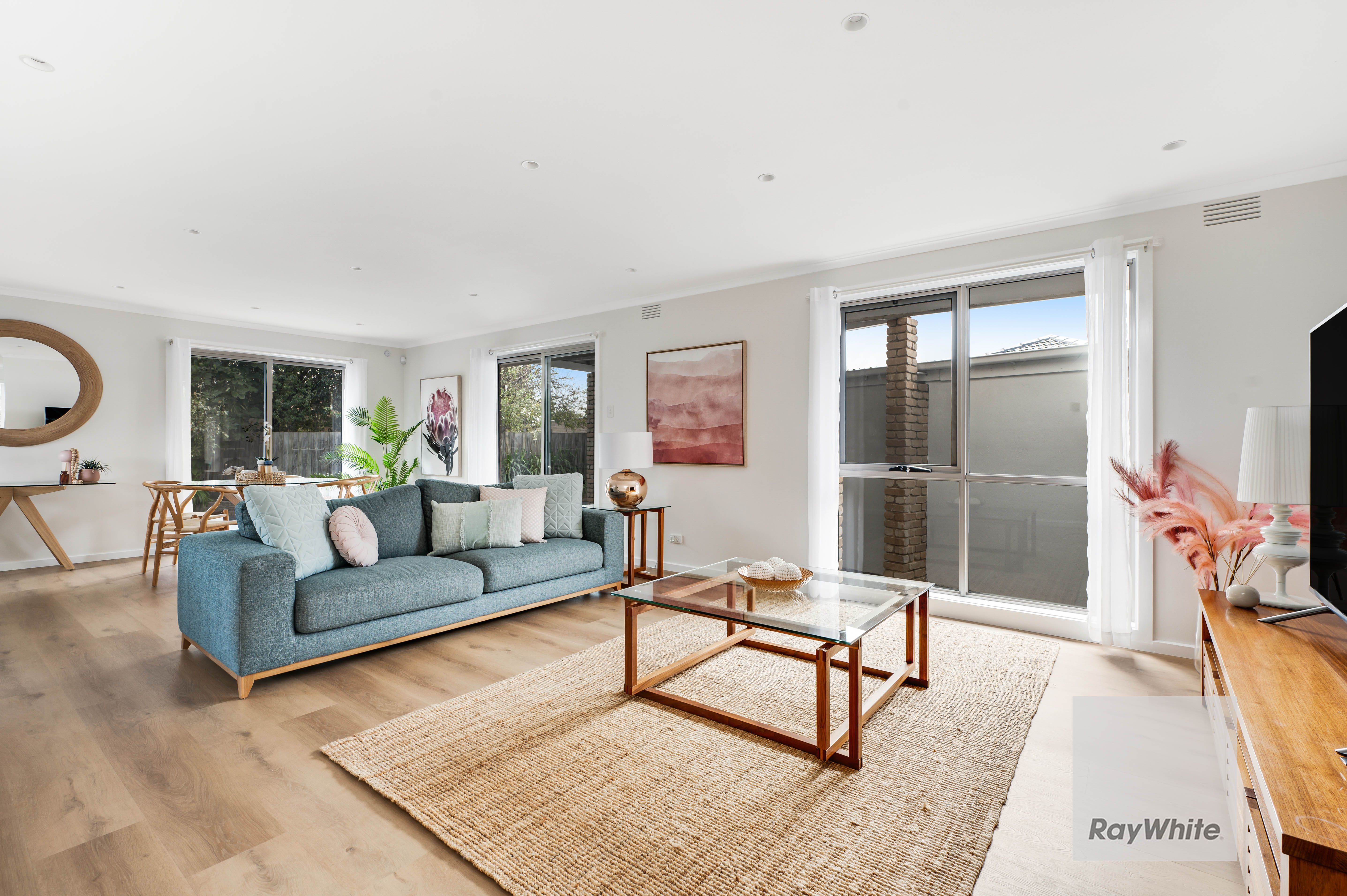 A sunny entry vestibule prefaces the flowing floor plan, while pale Scandi inspired interior hues, wide board flooring and timber accents define a property filled with considered design features.