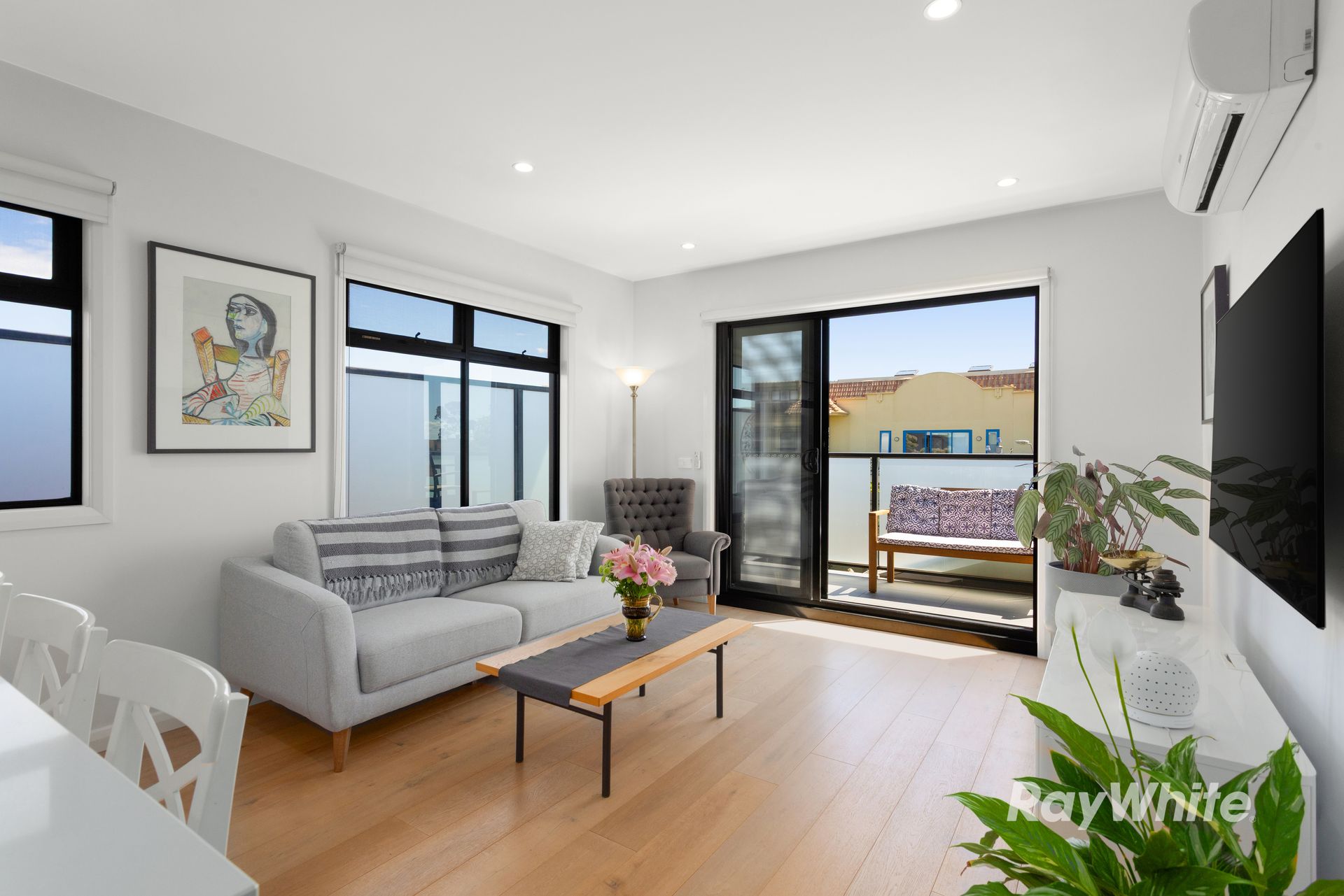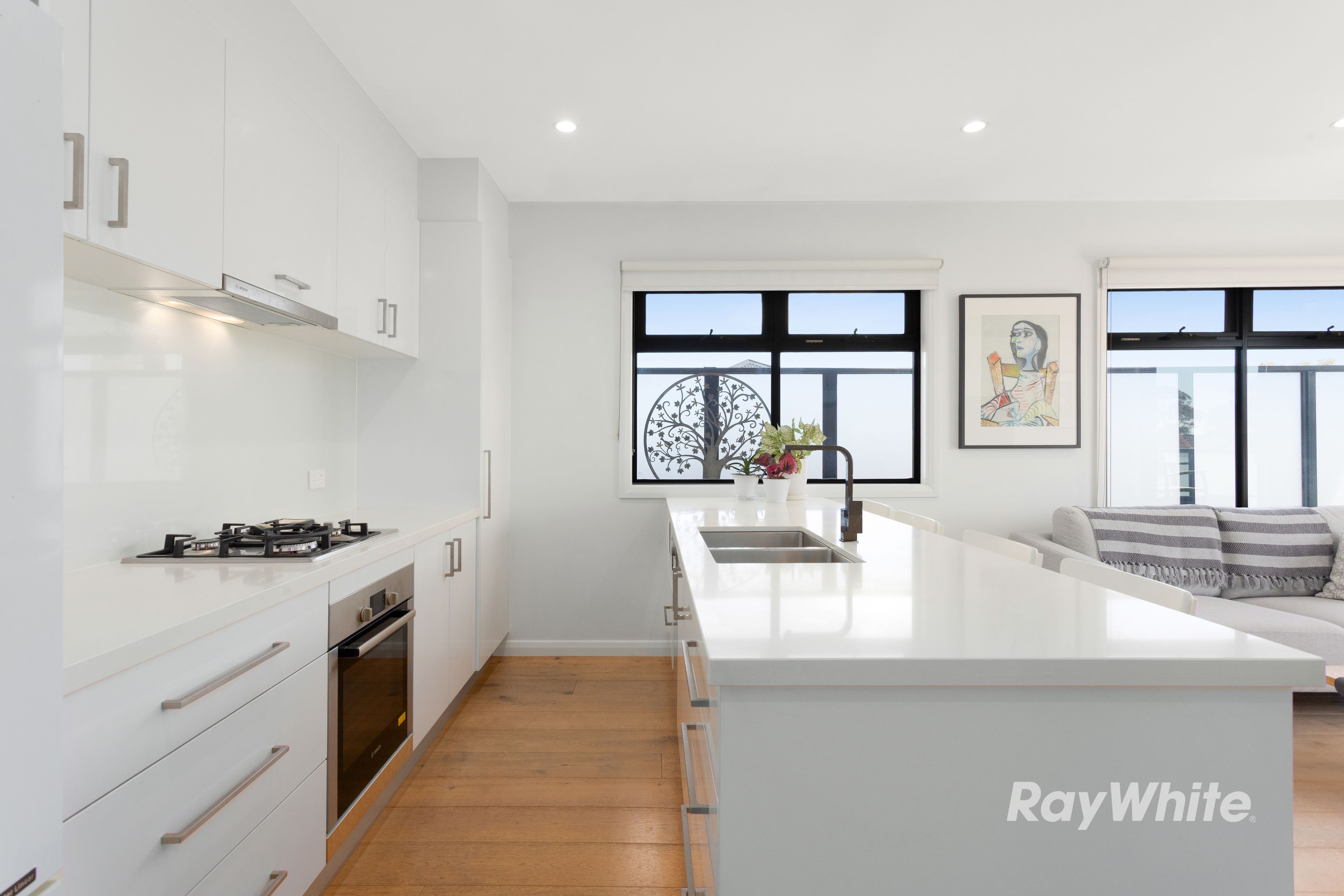The open plan living and dining zone flows beautifully to a private balcony; a quiet retreat for morning coffee or evening unwind. The sleek white kitchen impresses with its streamlined cabinetry and quality finishes, while timber-look flooring adds warmth and texture throughout the main living areas.