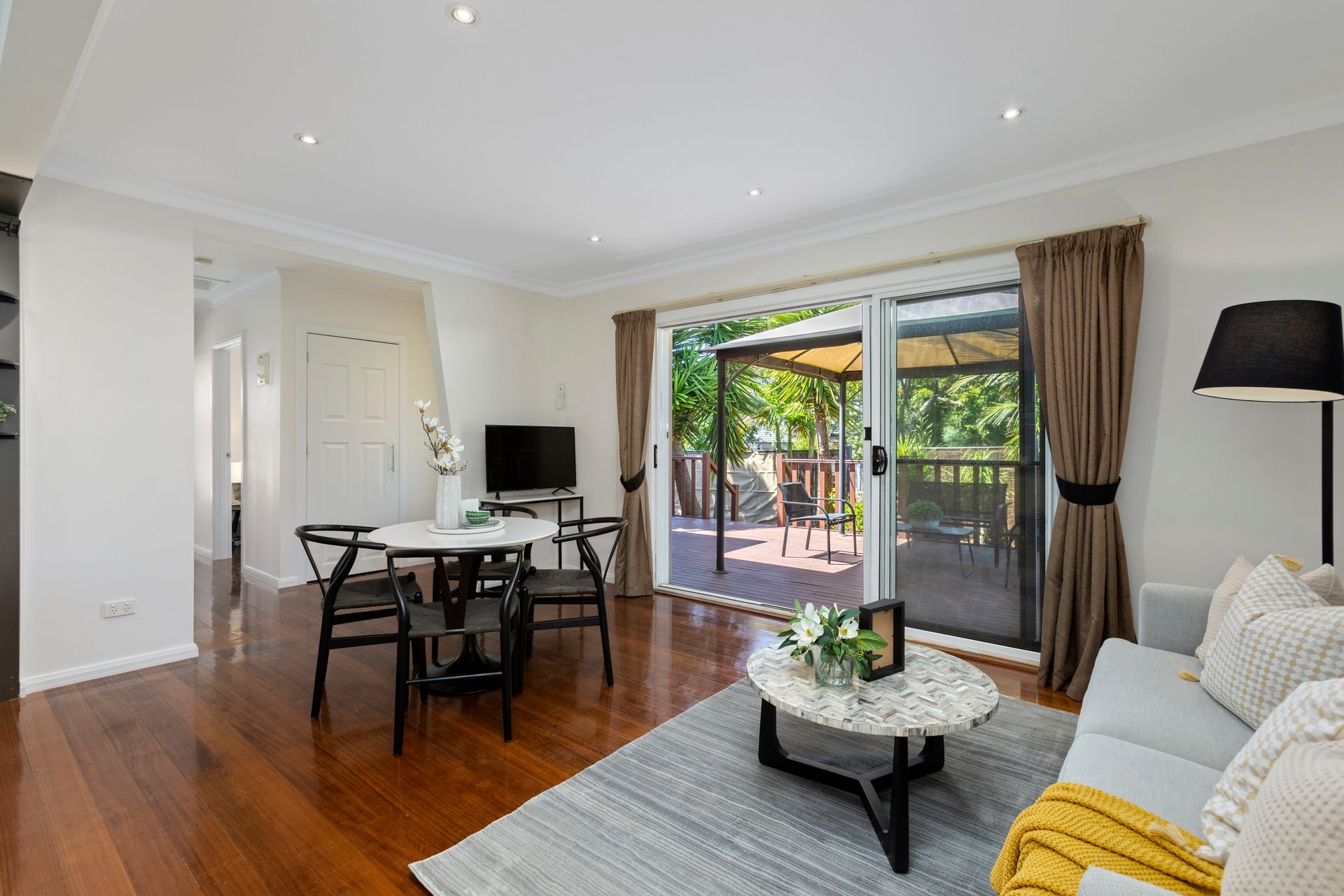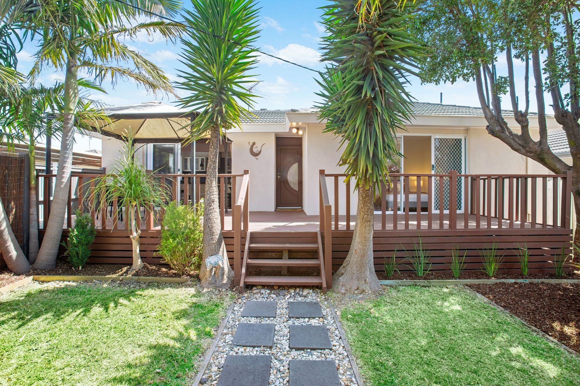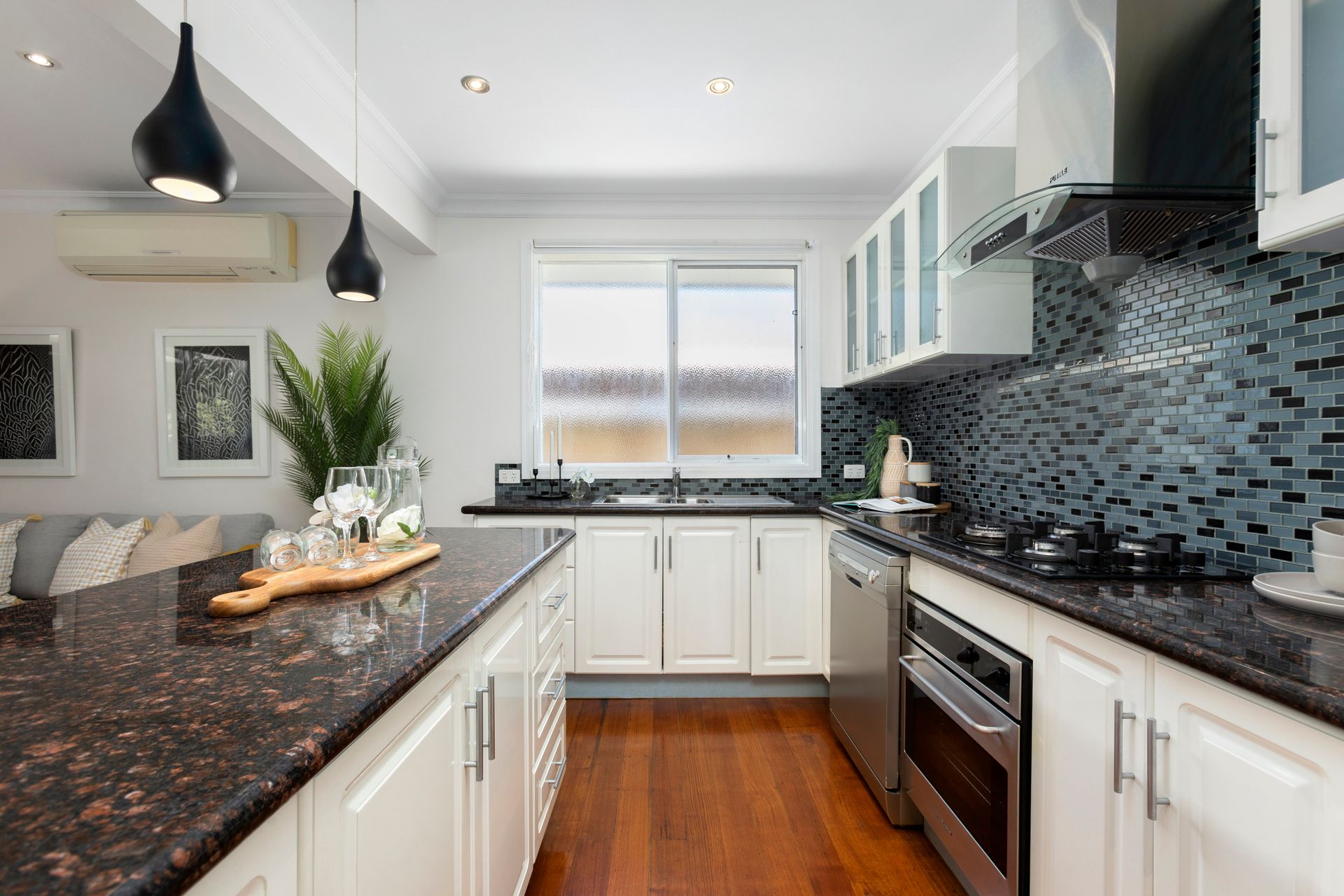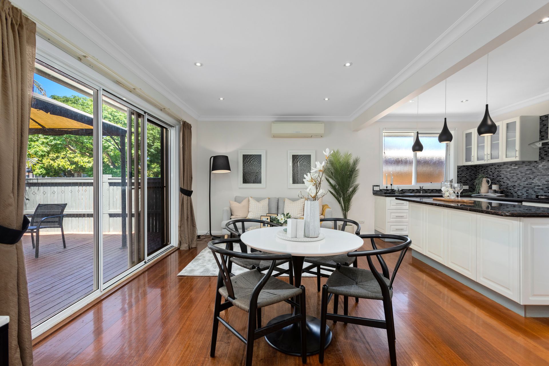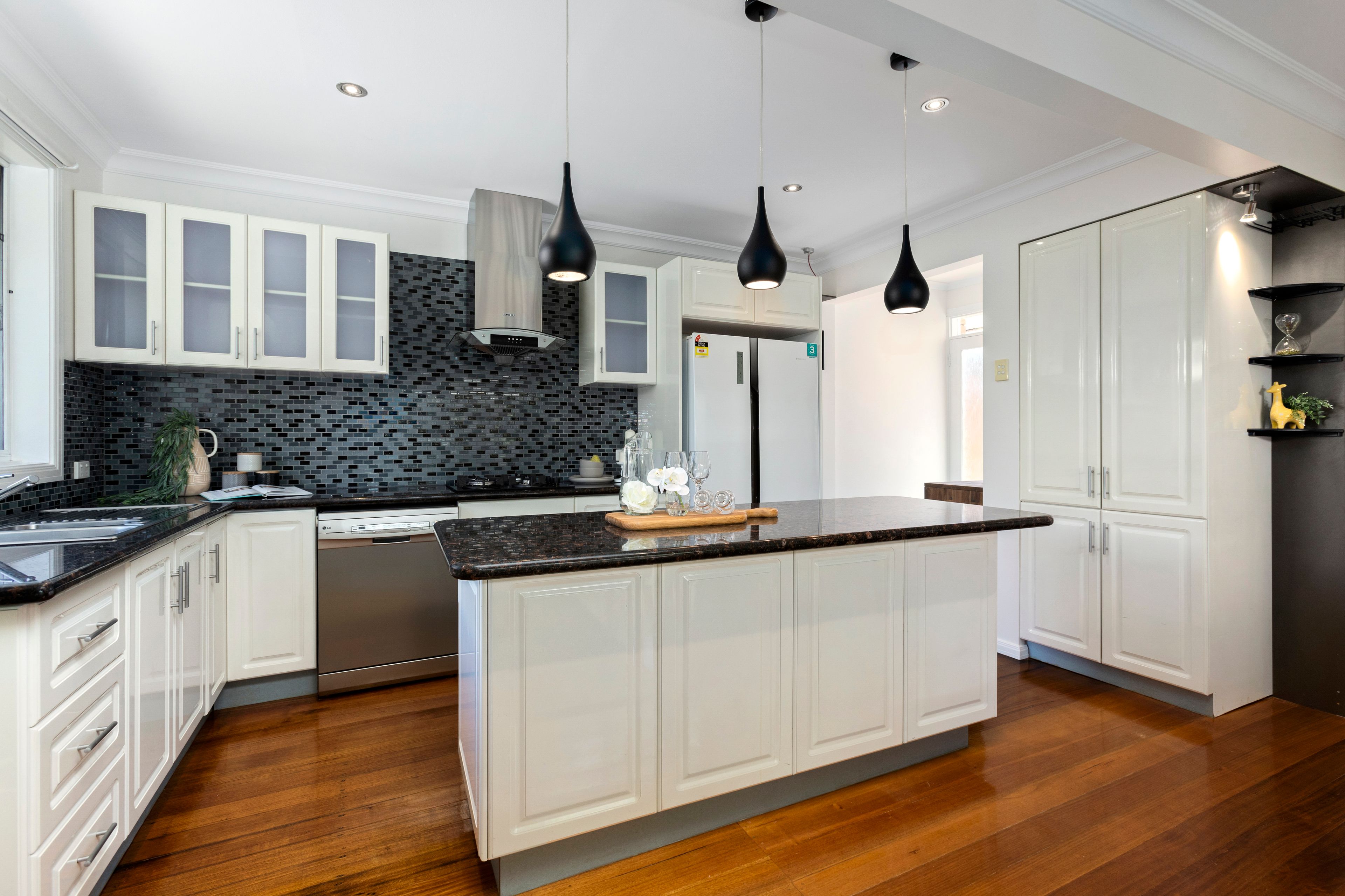 Stylishly appointed kitchen with quality cooking appliances and dishwasher, granite benches and island bench/breakfast bar with teardrop pendants overhead; plenty of storage and pantry space - and you'll LOVE the spaciousness and seamless indoor-outdoor flow from the living and dining extending out onto the huge, raised timber deck and gazebo overlooking the front garden.