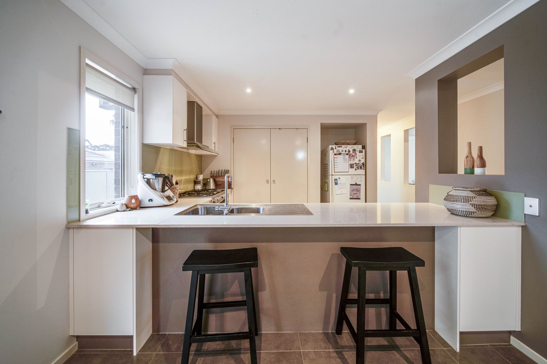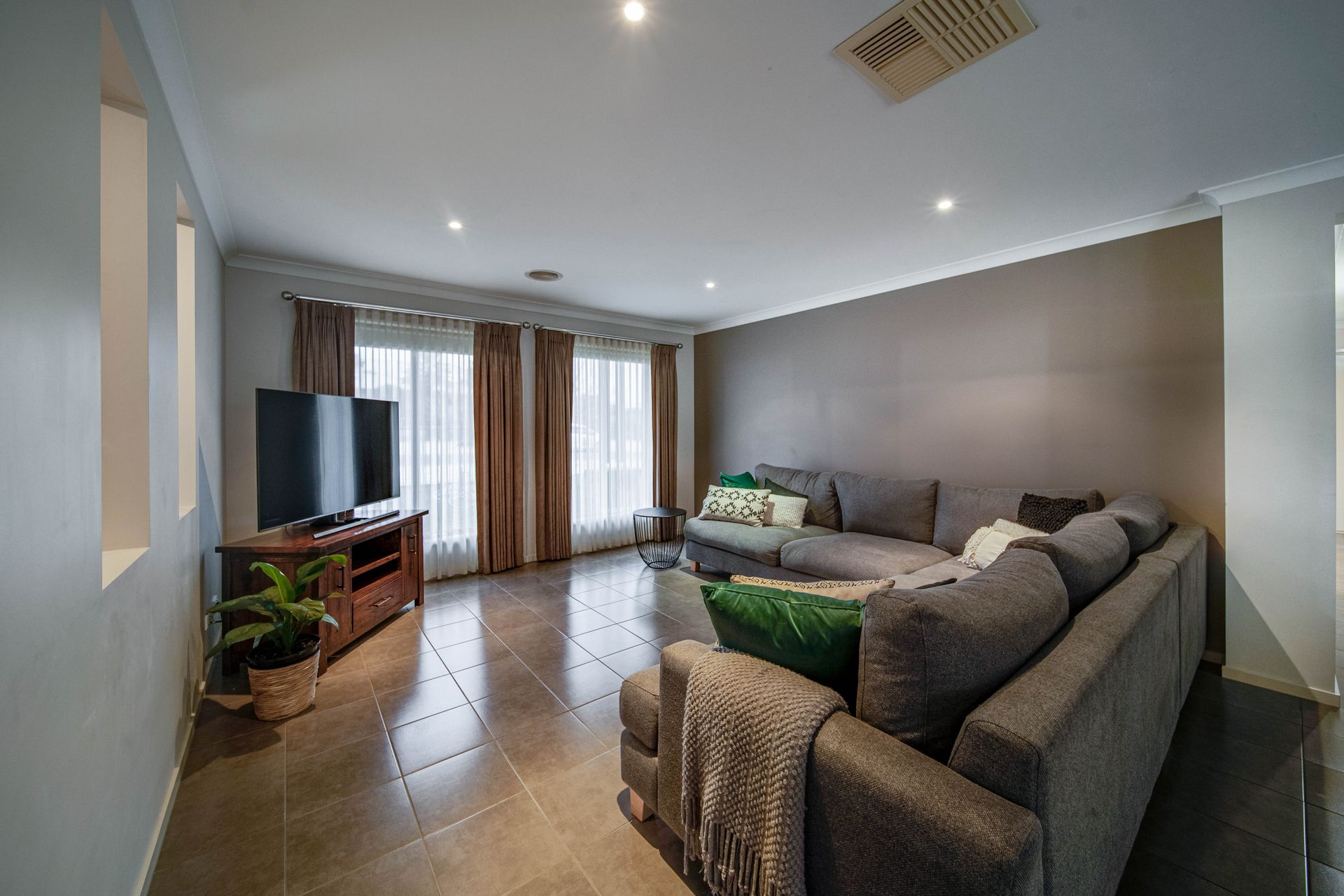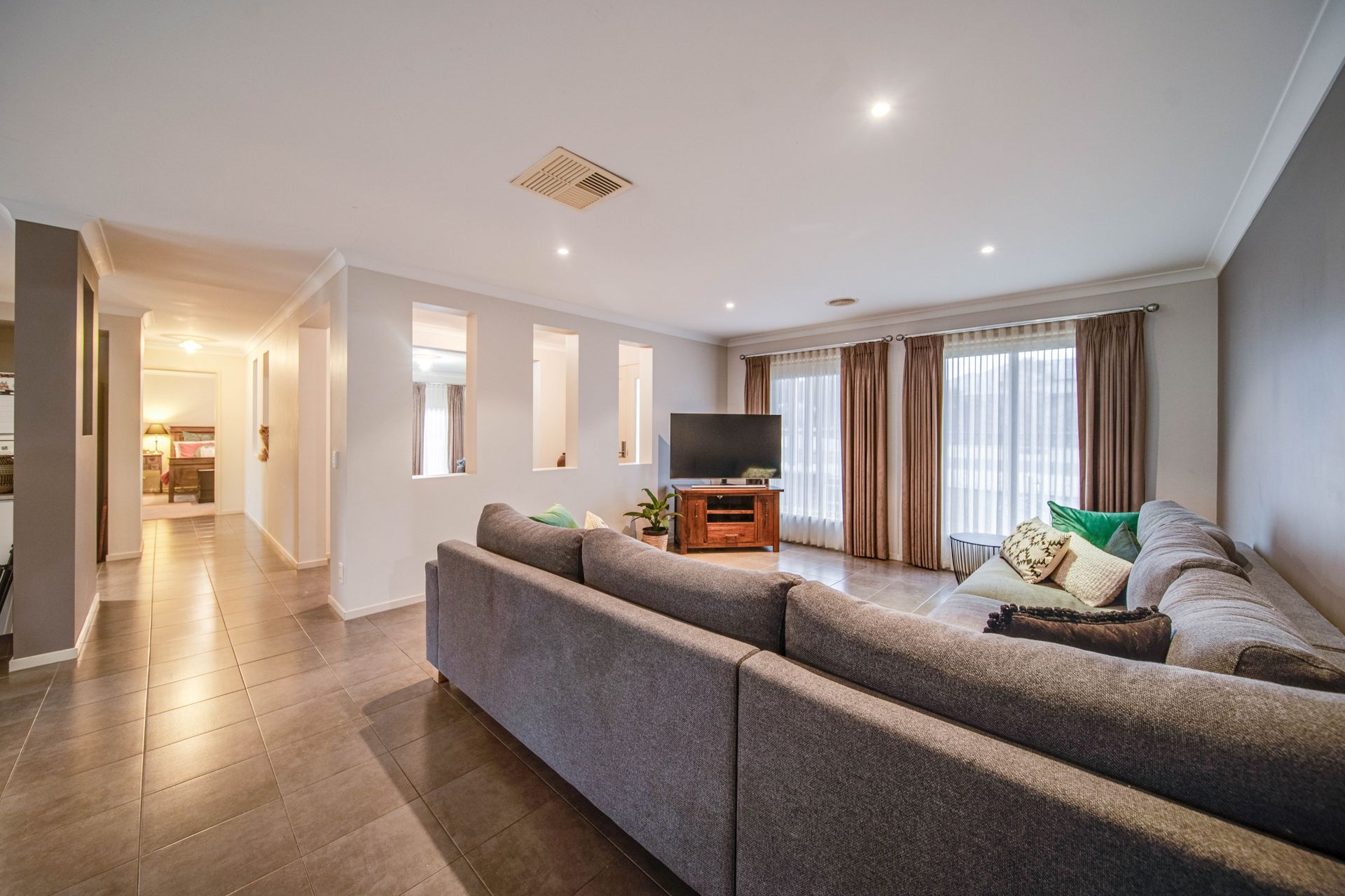 An open plan kitchen, dining and living area is located in the centre of the home. To the right wing of the property, an additional living area and study are situated. The luxurious master suite features a spacious walk in robe and ensuite, perfectly positioned away from the rest of the house. To the left wing, 2 more bedrooms, a bathroom, separate toilet, laundry and double car garage.