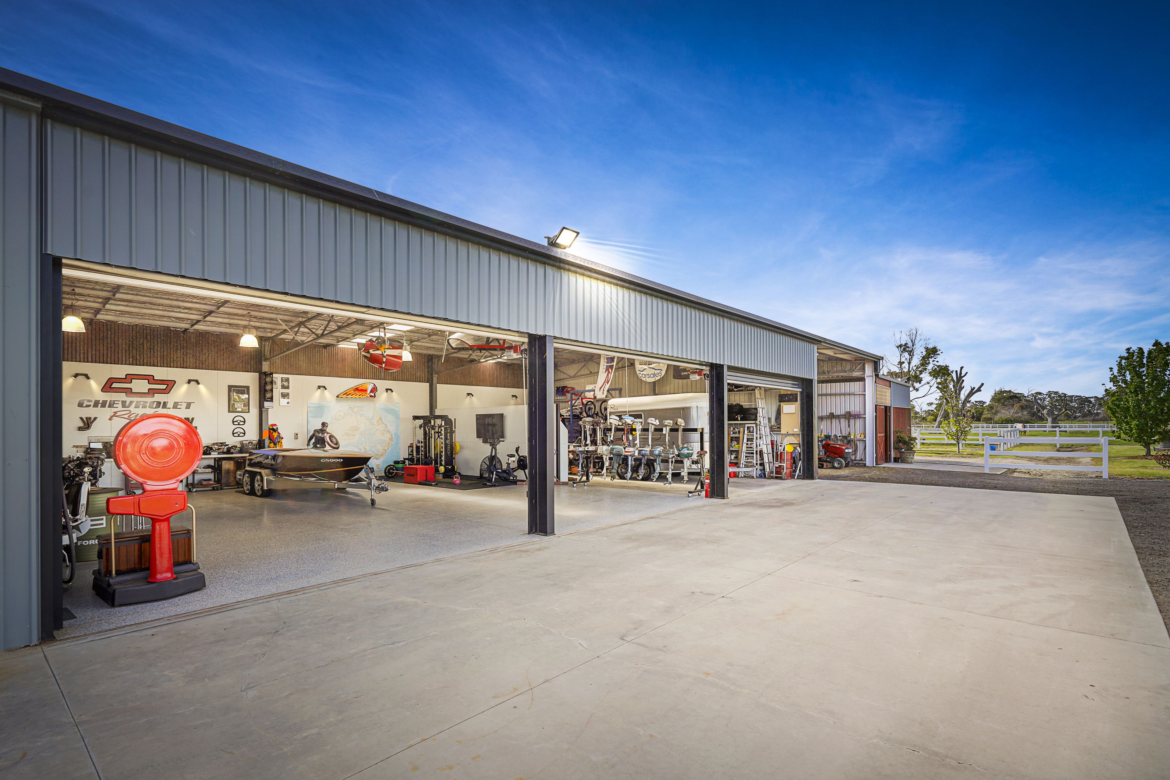 A massive garage of 24m x 12m with 3 x 3 phase roller doors and epoxy floor combines the dream of a man cave haven with the practical elements of a workshop, assembly room and upstairs mezzanine storage. Additionally there is an undercover wash bay area, plus machinery and hayshed.